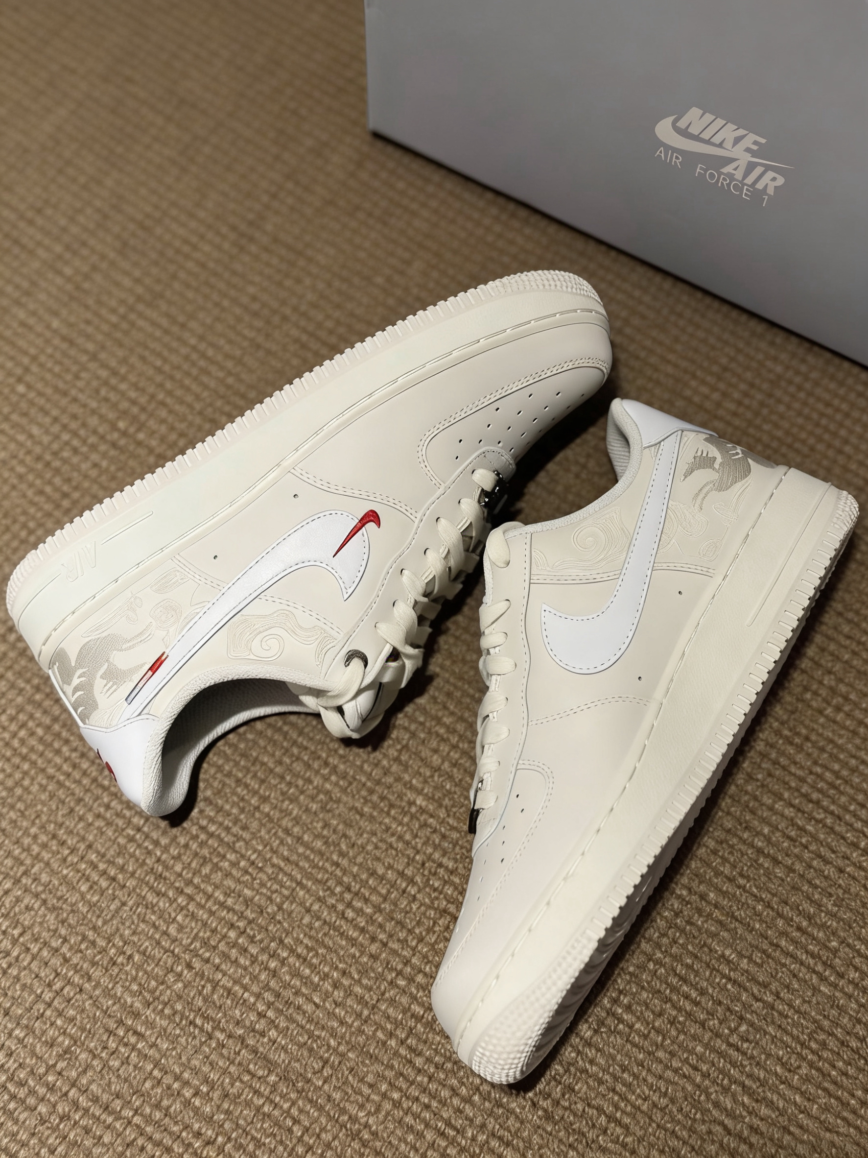 🐎马年专属纹样:鞋身侧面的祥云+飞马刺绣太绝了,米白色基底上的浅纹低调又高级,灯光下细看能感受到浮雕般的质感,本命年穿出门直接自带祥瑞buff。 🐎CNY点睛之笔:Swoosh Logo的一抹红勾和后跟的红色细节,完美呼应新年氛围,不会像传统红鞋那样扎眼,日常搭衣服也不违和。 🐎材质质感在线:奶白色皮革+细腻麂皮拼接,穿着体验