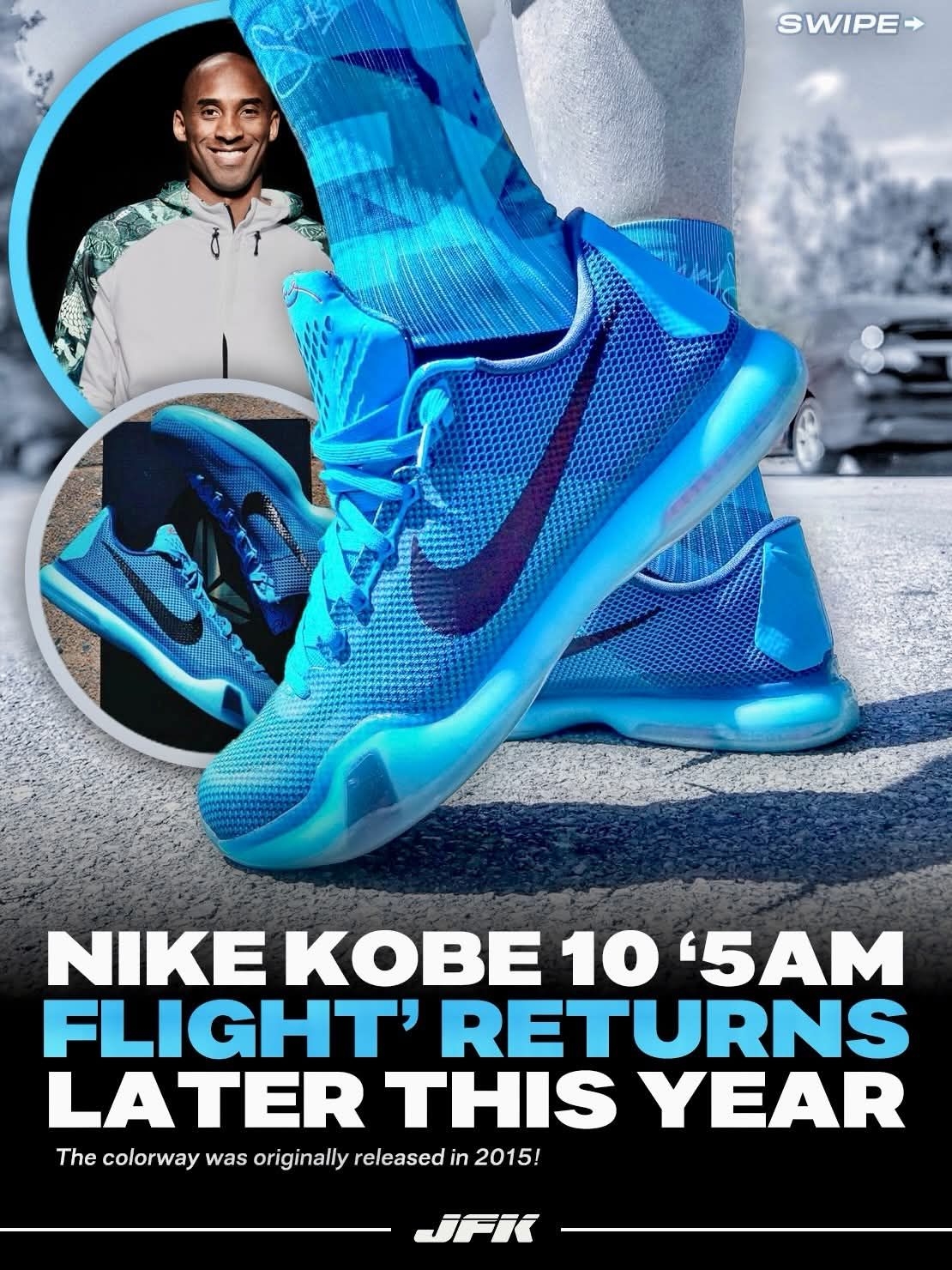 谁的青春又回来了!🔥 Nike Kobe 10「5AM FLIGHT」官宣今年复刻回归! 这双2015年发售的神配色,以科比凌晨四点训练的故事为灵感,通透的湖蓝色网面+渐变水晶底,把“凌晨五点的飞行”氛围感拉满,不管是上脚还是收藏都绝了! 当年没抢到的鞋友们,这次可别再错过了,准备好冲了吗?🙋♂️