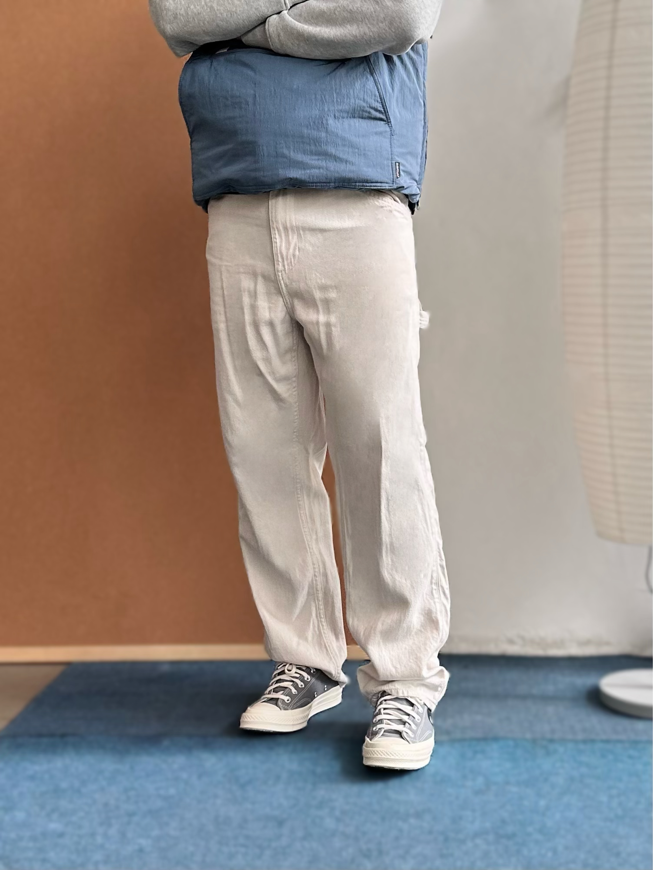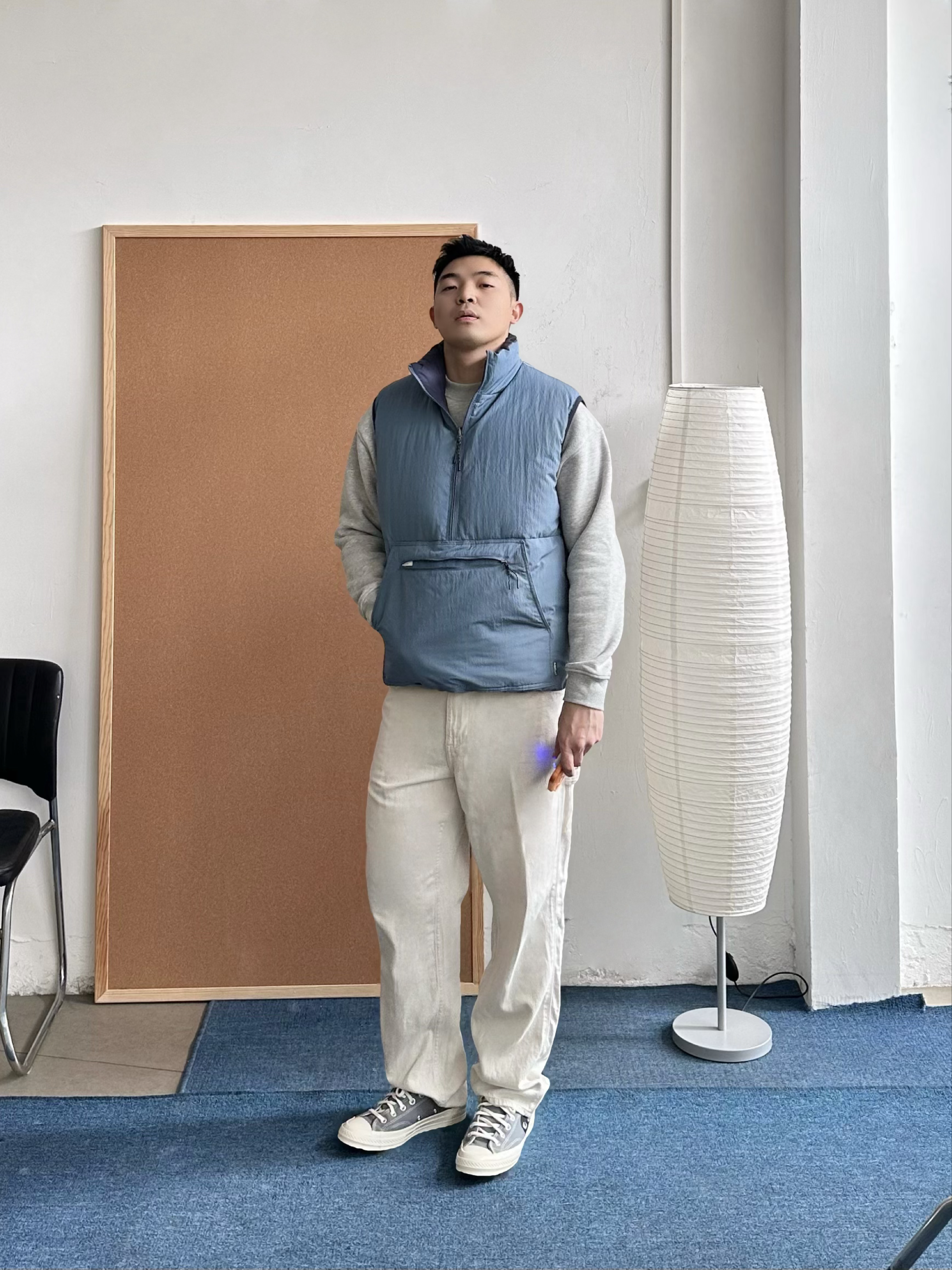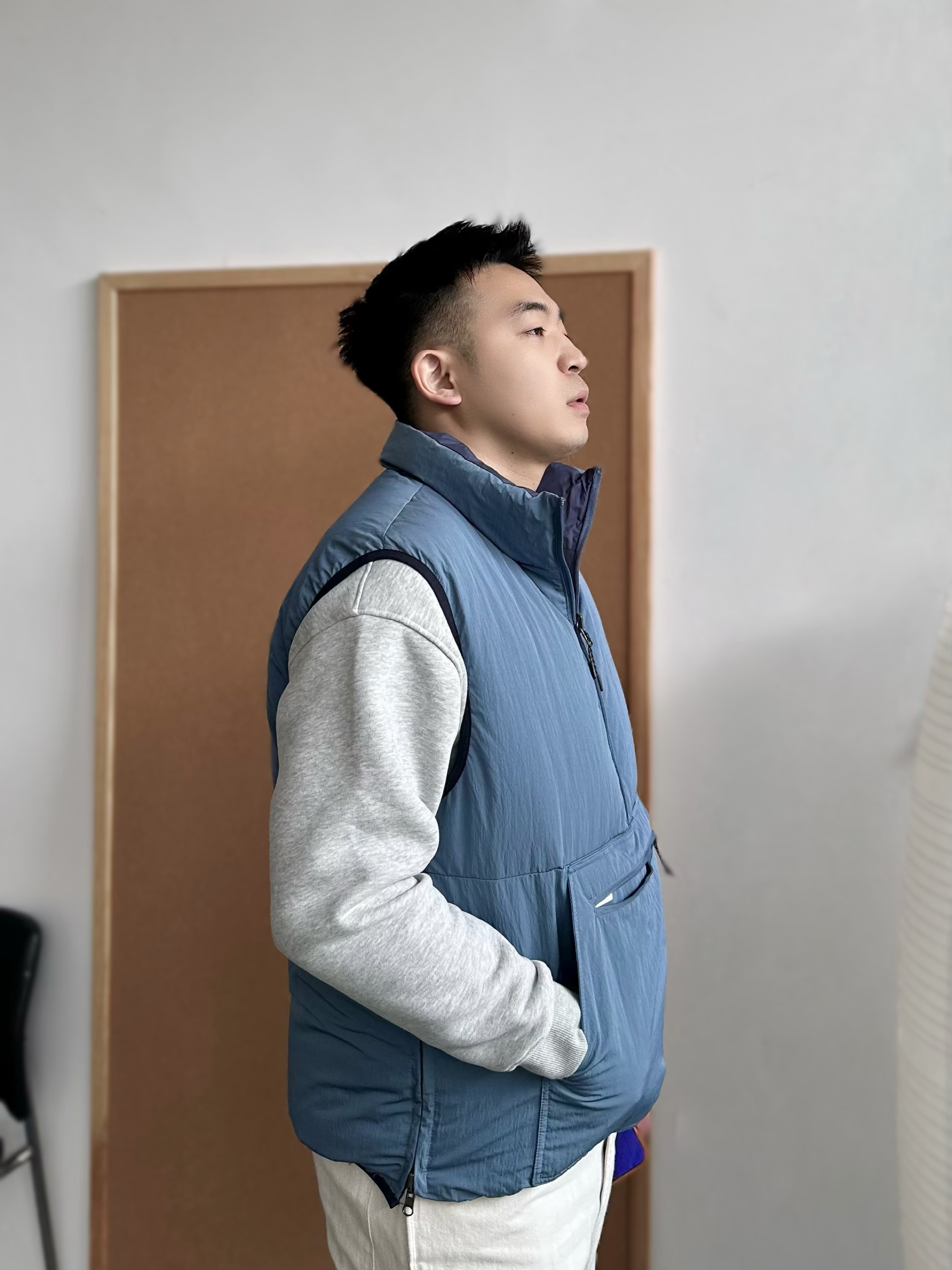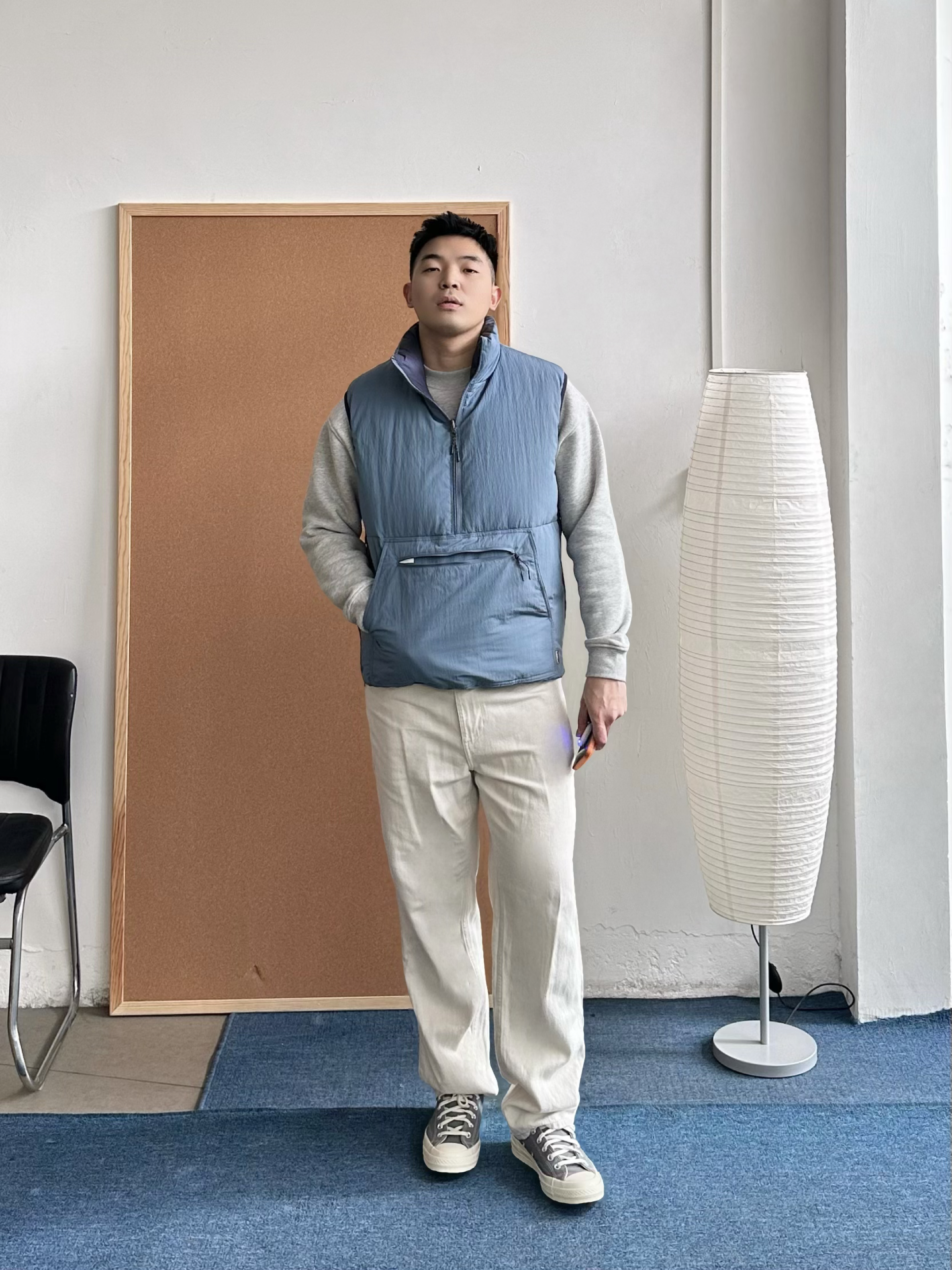 👕 内搭:浅灰色卫衣终于开窍了😅 以前总觉得单穿有点普通,但当打底反而很加分,干净耐看。 🦺 外搭:浅蓝色机能棉服马甲叠穿层次马上出来,美式休闲感更明显,保暖但不厚重。 👖 下装:浅白色直筒长裤把整体提亮。 👟 鞋子:浅灰帆布鞋收尾,经典联名款,百搭轻松。