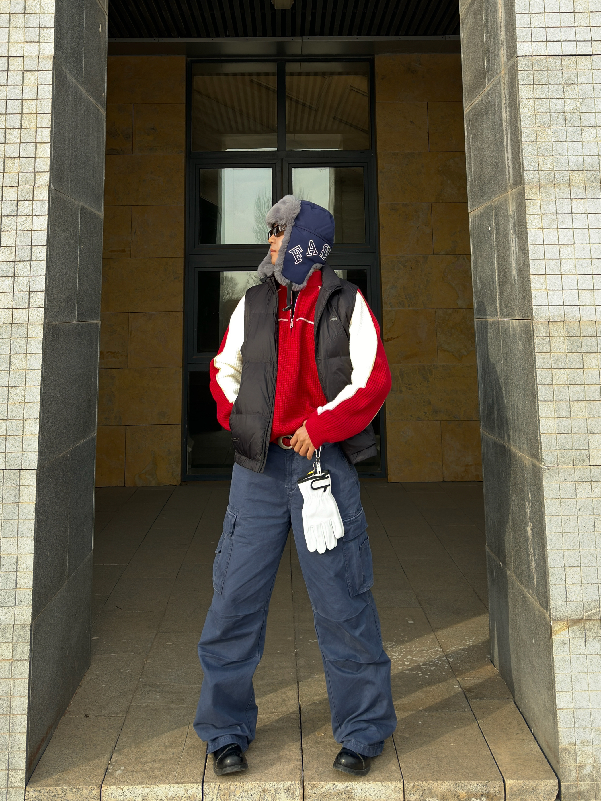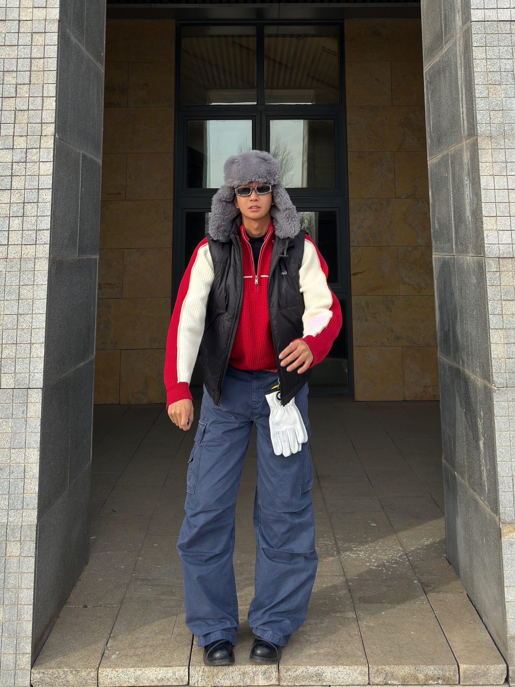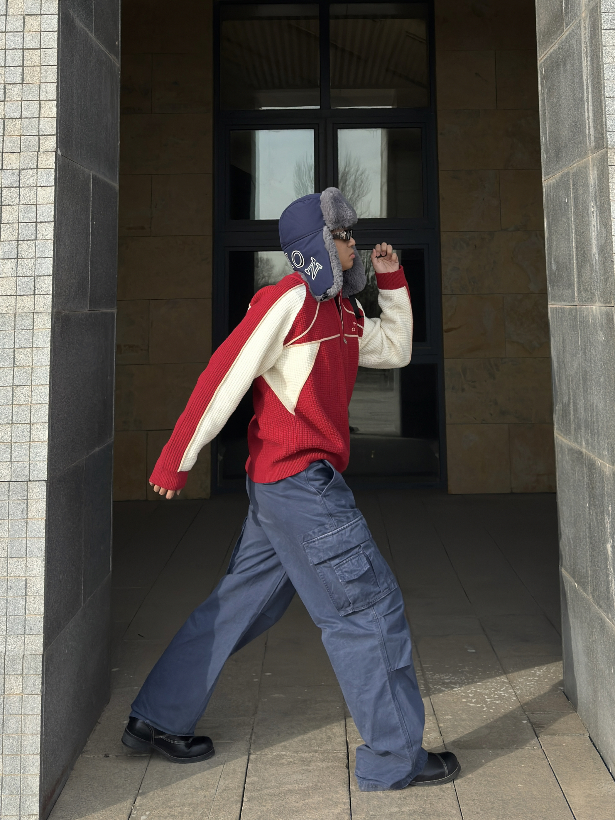 家人们!这套红白蓝配色真的太绝了! 经典的红白拼色半拉链毛衣,华夫格的肌理感超有质感,半拉链设计不仅增加了穿搭层次,还能根据温度调节领口,实用性拉满! 下身搭配一条藏蓝色工装裤,大口袋设计不仅能装,还自带复古街头感,裤型宽松又显瘦,对各种腿型都很友好。 最后再配上一顶雷锋帽,保暖又复古,整套穿搭既有少年感又不失硬朗气质,走在街上回头率直接爆表!