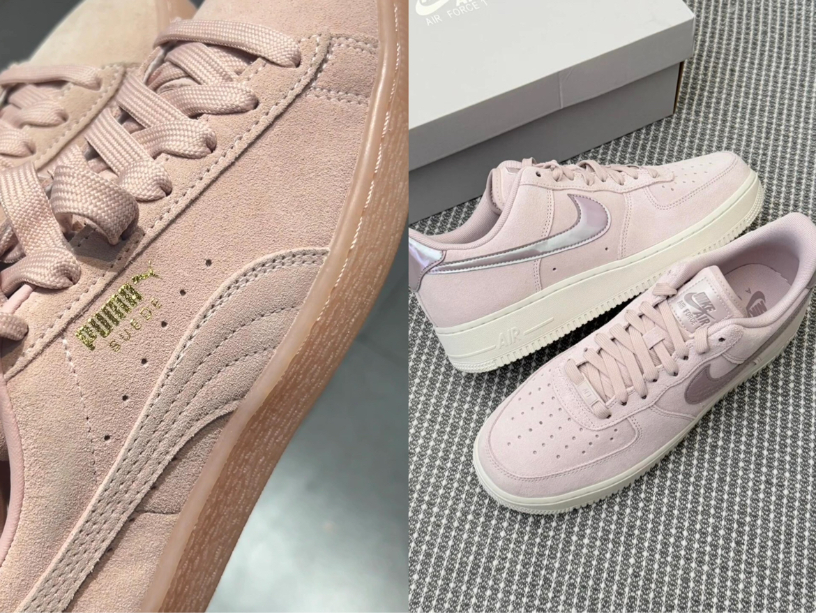 这两款粉色板鞋颜值在线,麂皮材质质感细腻,粉色调柔和耐看。彪马款鞋底柔软,走路时脚感舒适,鞋舌与后跟的品牌标识细节精致;耐克款后跟炫彩设计有亮点,鞋面透气孔设计提升穿着舒适度。两款鞋型都贴合脚型,搭配牛仔裤、休闲裙都合适,日常出行穿着轻便,是实用性与颜值兼具的选择。大家平时更爱穿麂皮还是皮质板鞋呢?