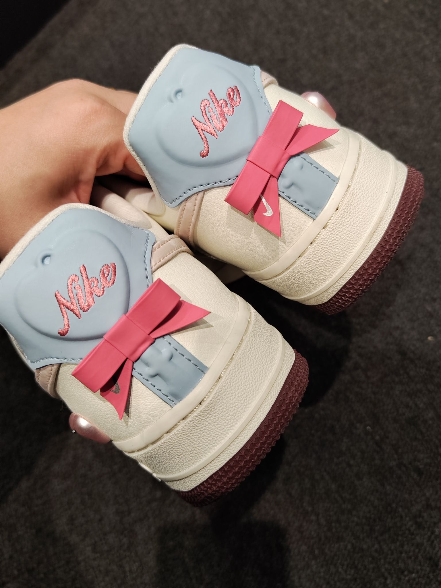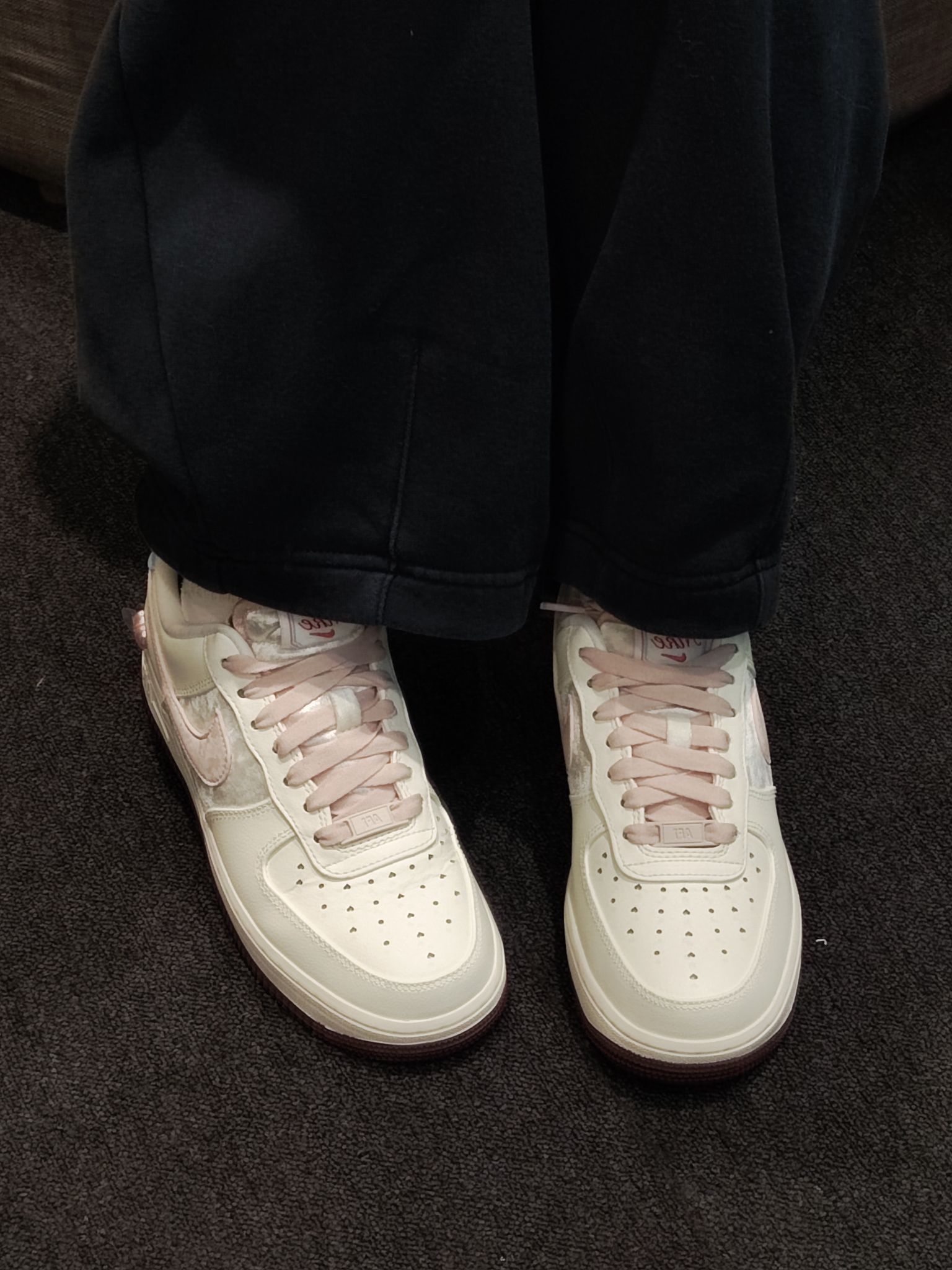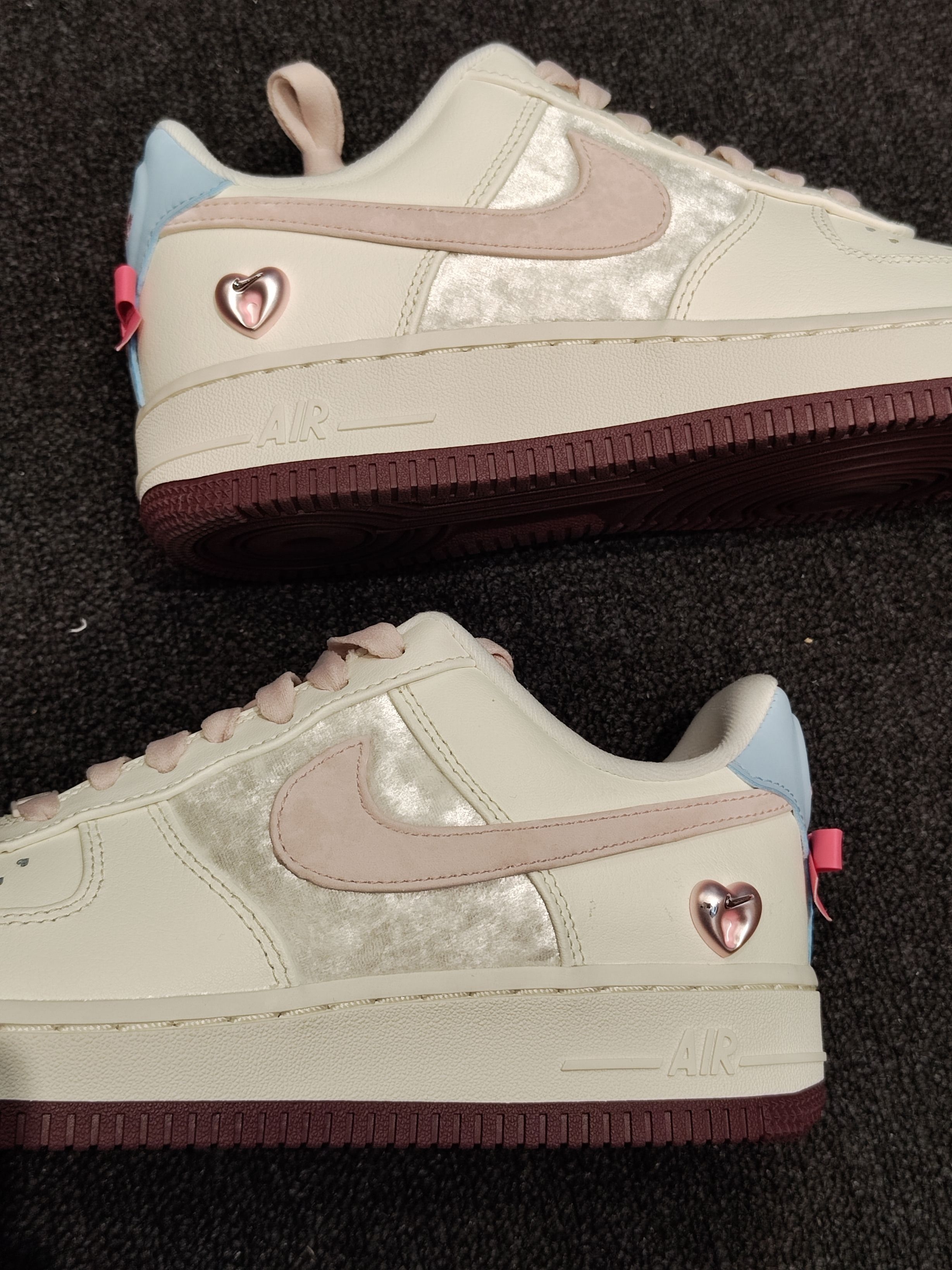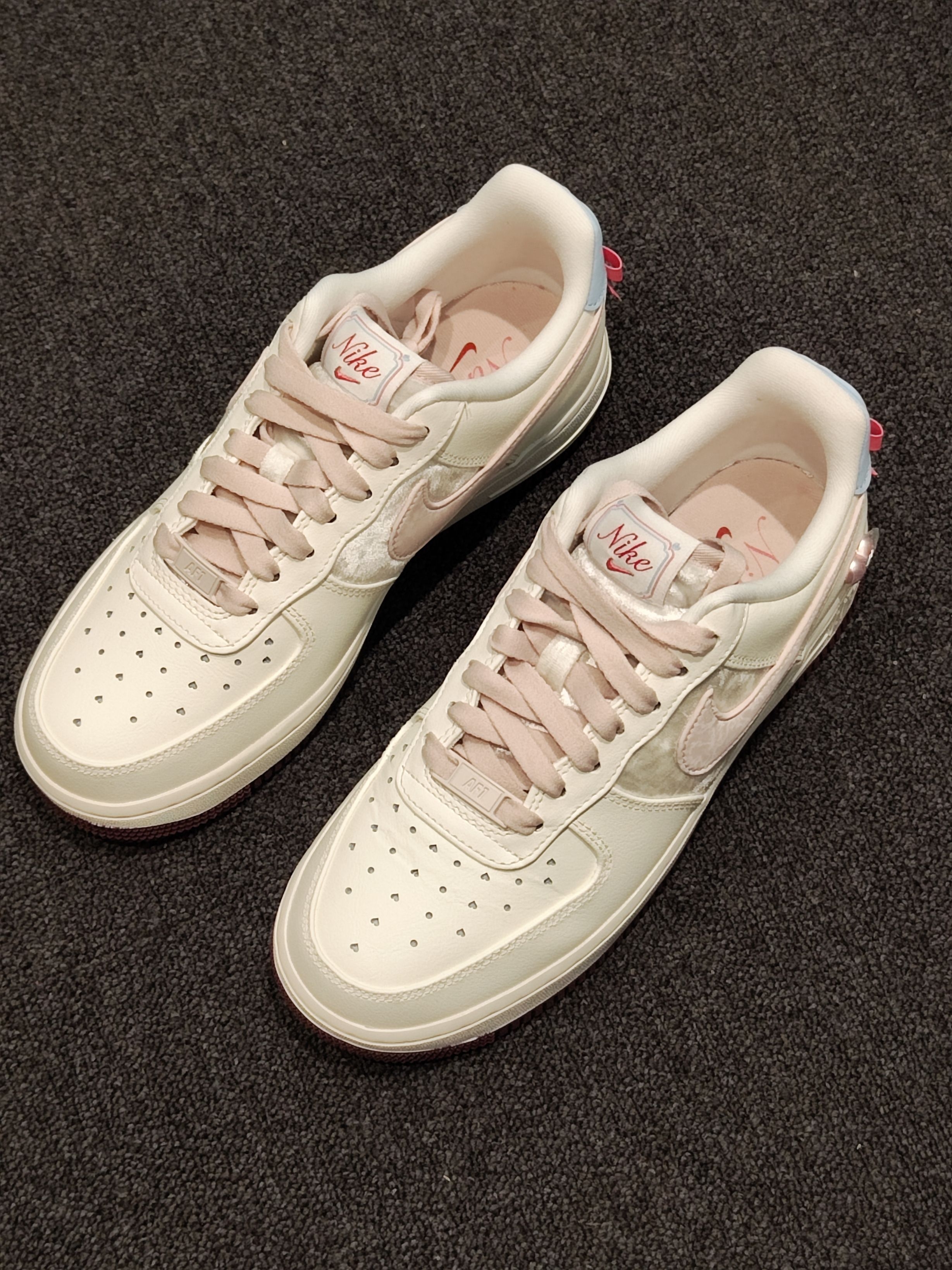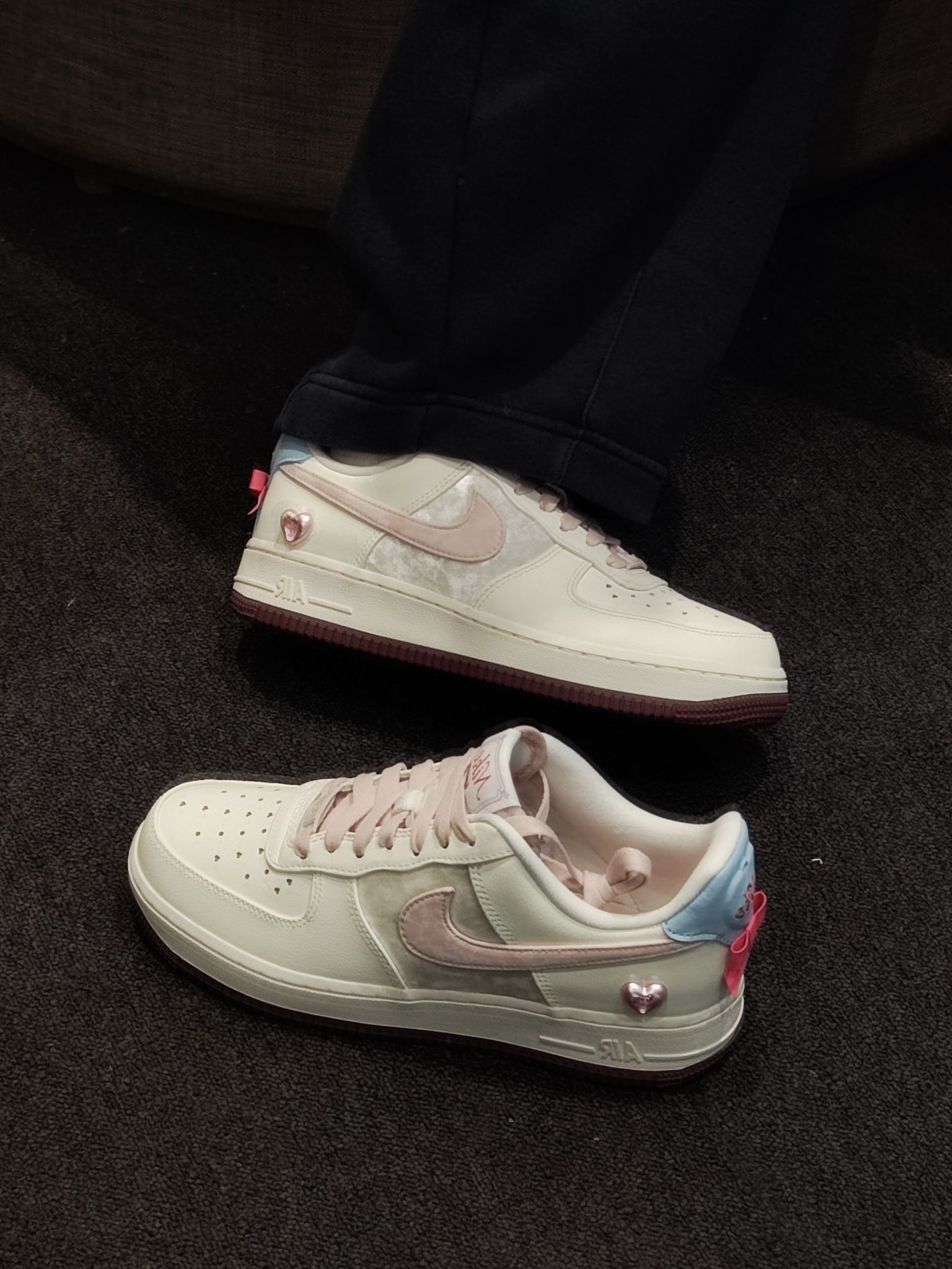 - 奶白+柔粉配色,绒面勾子+爱心水钻,细节拉满!情人节穿它出门,甜度超标~ - 上脚显白又显脚小,百褶裙/牛仔裤都能搭,甜妹约会必备! - Nike AF1情人节限定|把爱意焊在鞋上,温柔到骨子里💖 - 爱心扣+小飘带,每一处都是小心机!送女友/自留都超合适~