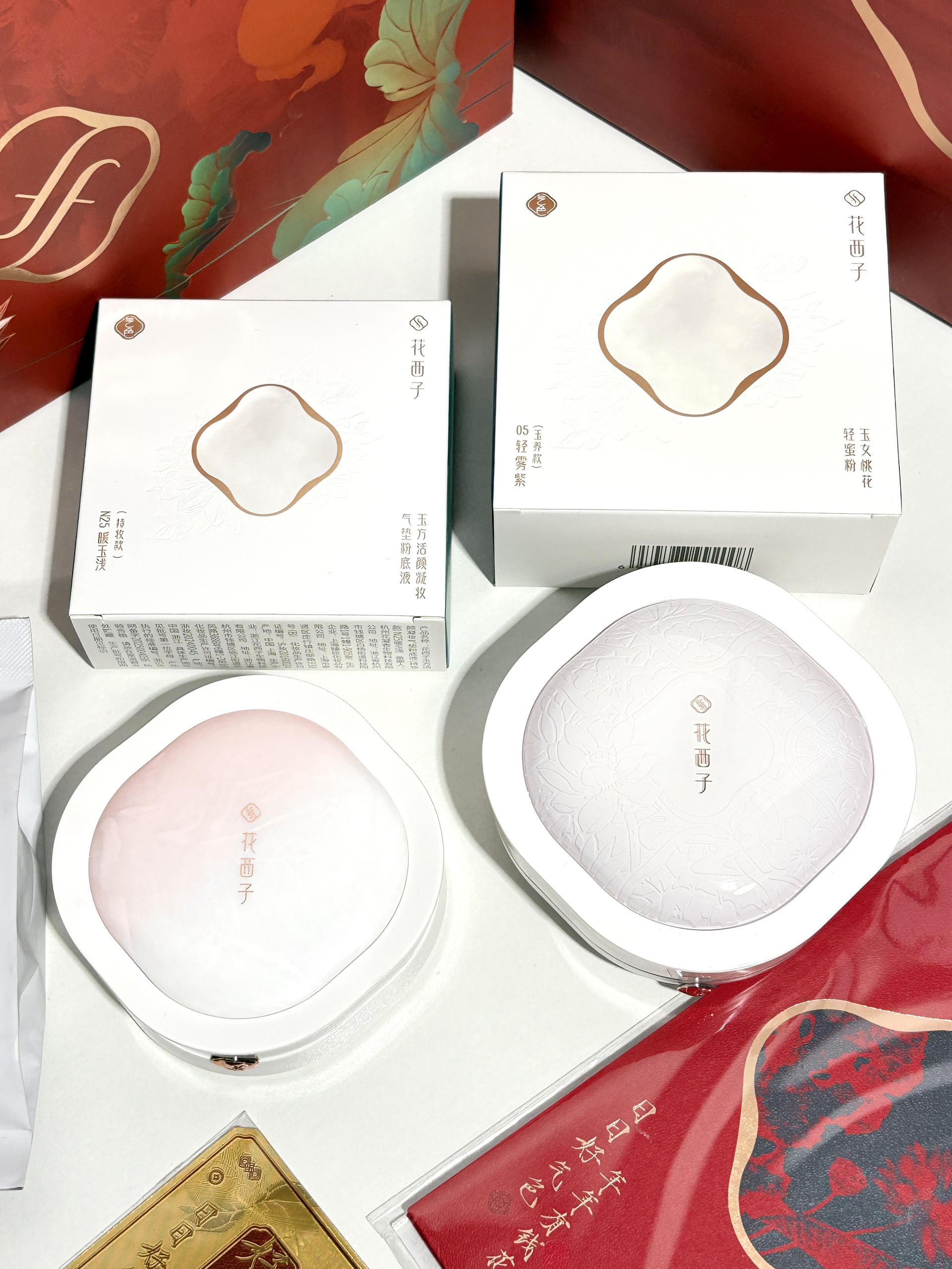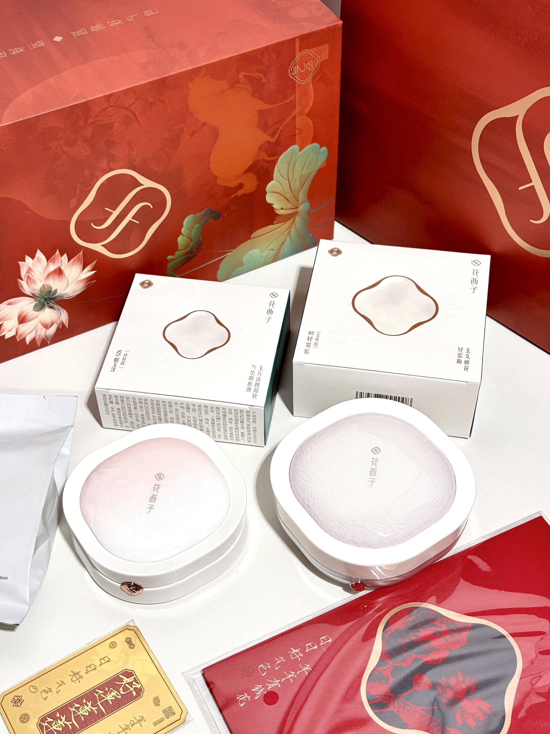 谁懂啊!收到这套花西子直接被美晕!红金配色的礼盒也太有年味了,荷花暗纹精致到不行,过年送礼拿得出手又有心意~ 拆开是气垫+散粉的王炸组合!气垫上脸是自然的妈生皮,遮瑕力在线还不卡粉,干皮秋冬用也很服帖。搭配05轻雾紫散粉,一秒磨皮提亮,黄皮直接白一个度✨ 定妆后出门拜年,吃火锅逛亲戚都不脱妆,持妆力绝了! 新年想换底妆的姐妹闭眼冲,这套自用送礼都超合适~