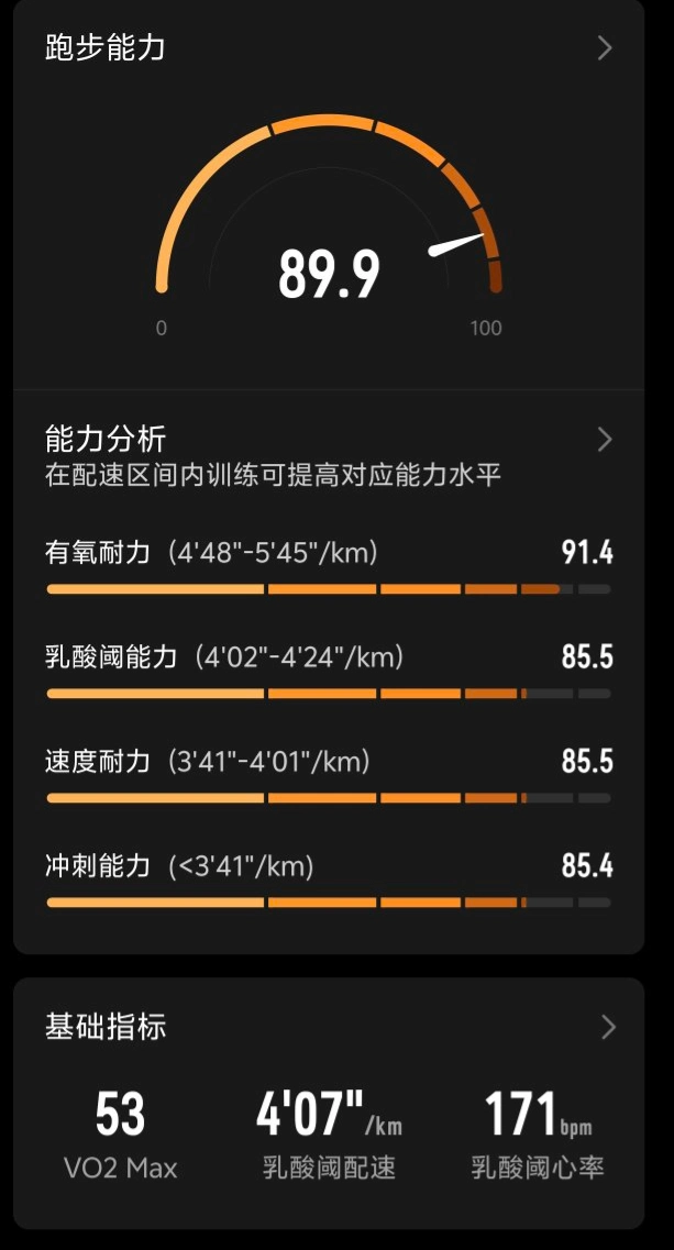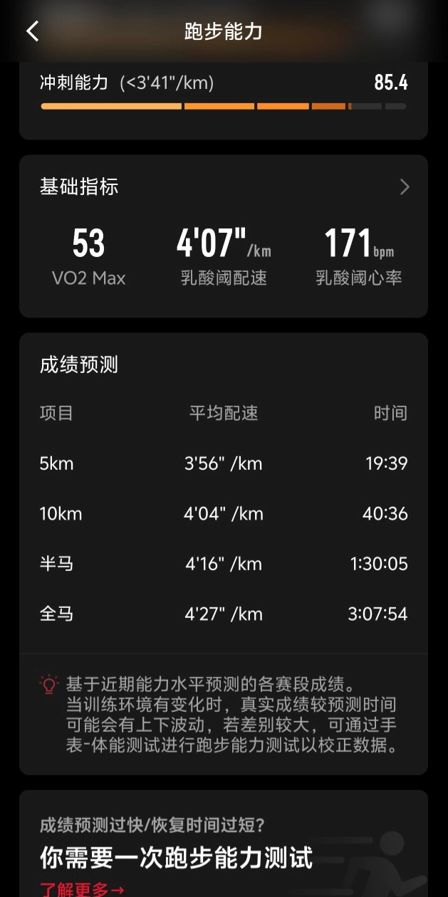 #今天也跑了 最近跑步心率和配速又不在相对应区间。准备用高驰自带的跑步能力测试重新测一下配速和心率的标准值。按照测试要求完成测试,10公里平均配速430,最后结果阈值配速在407,阈值心率171。重新规划了配速和心率区间,以后可以更准确的进行训练了