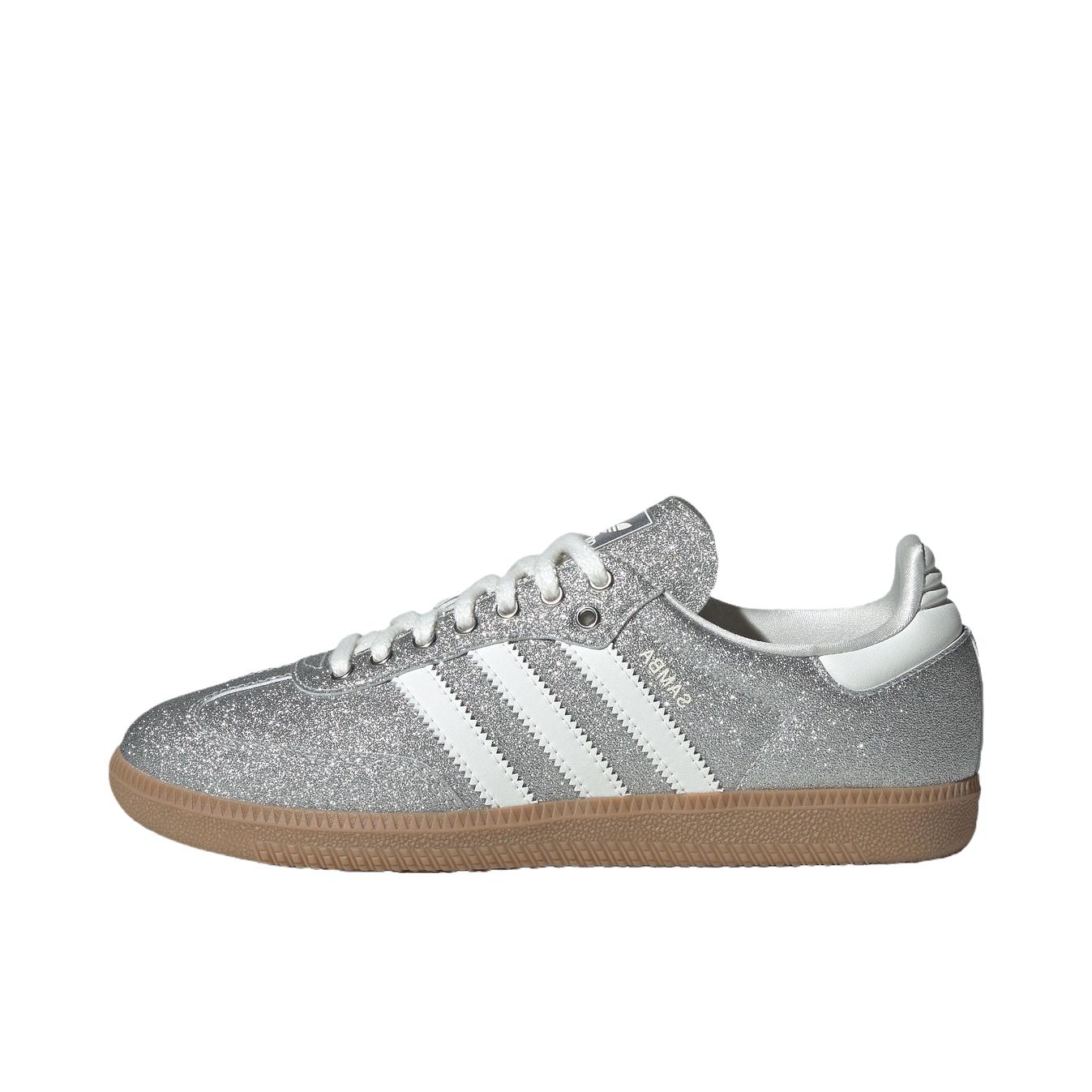 鞋面采用银闪粉材质,在光线下自带细闪效果,比普通德训鞋更具辨识度,轻松打造亮眼造型。经典德训鞋型+生胶大底,既能搭配牛仔裤、运动裤打造休闲风,也能适配半裙、西装裤营造复古氛围感。
