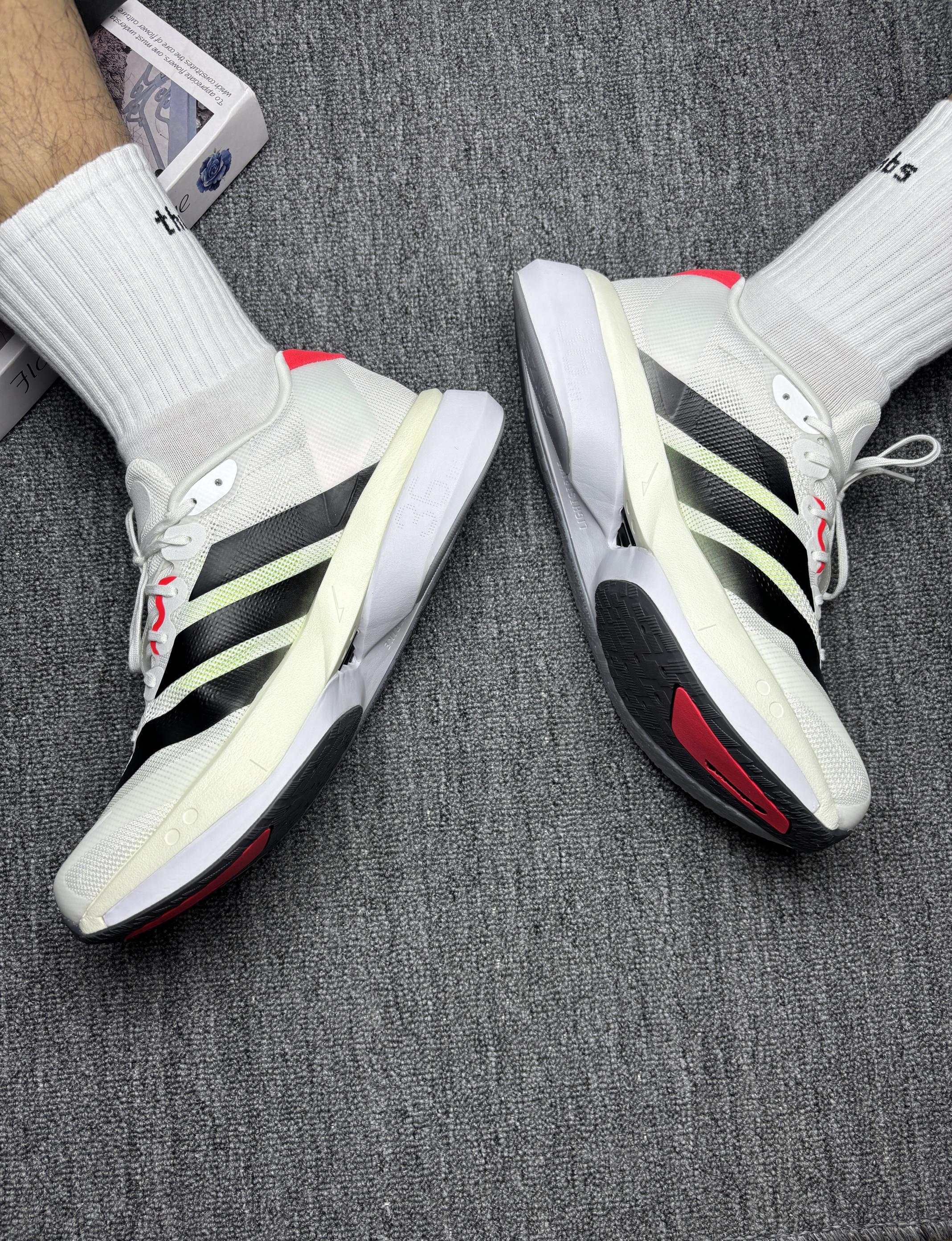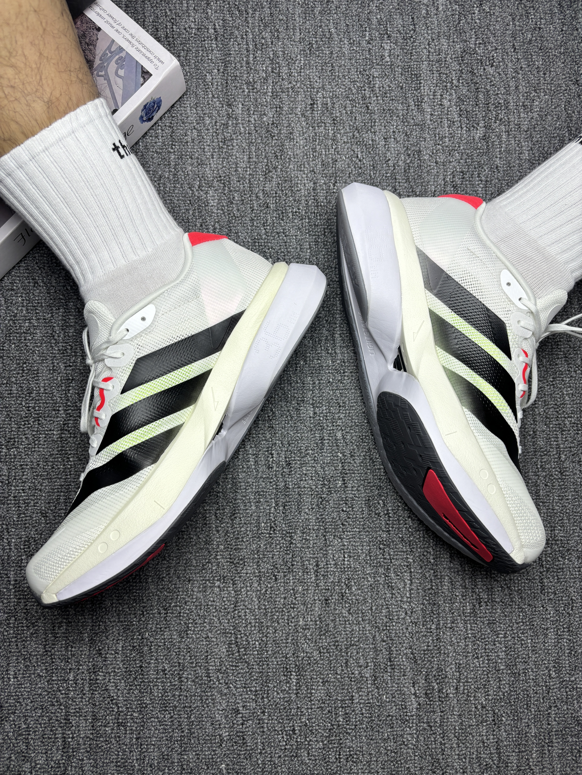 没想到adidas 的设计师还是很有品位的,低调又富有特点的配色,上脚的体验让我感觉非常值得,缓震科技没得说,跳远,跑步,鞋子的缓冲效果都非常好,大大的减轻了脚踝和膝盖的损伤,这款个人感觉适合竞速多一点,前掌的大底也大大增加了抓地力,助力非常ok,干脆利落,稳定性可以说满分的。 材质上透气性也是一绝,长期跑步、训练也不会出太多汗,对汗脚很友好。鞋面在logo下还有浅绿色的光韵,这也是...
