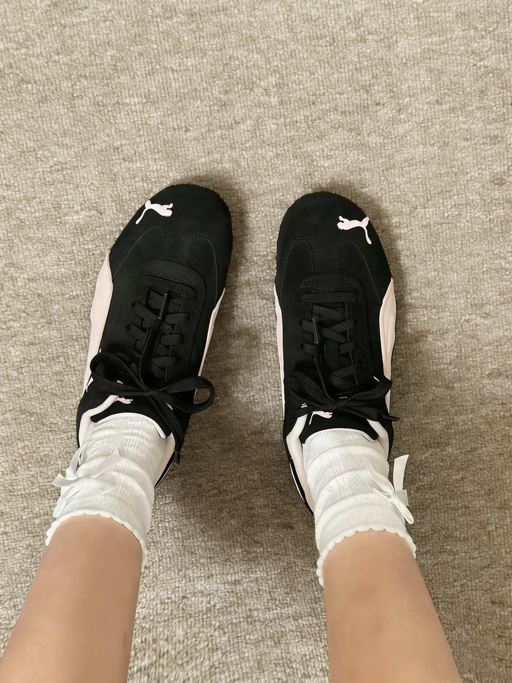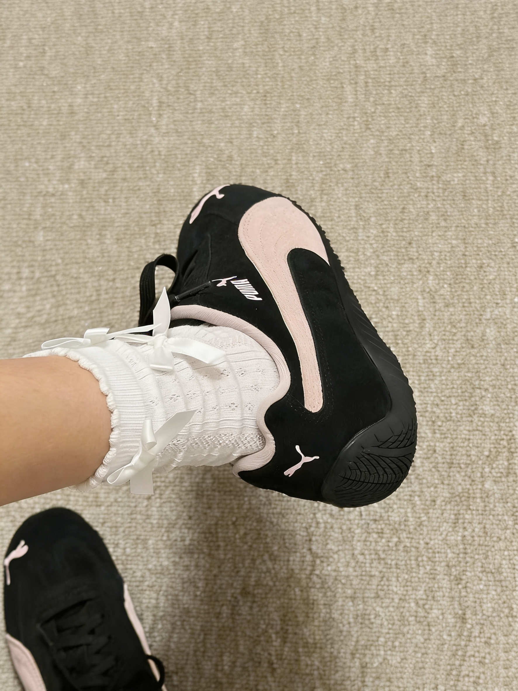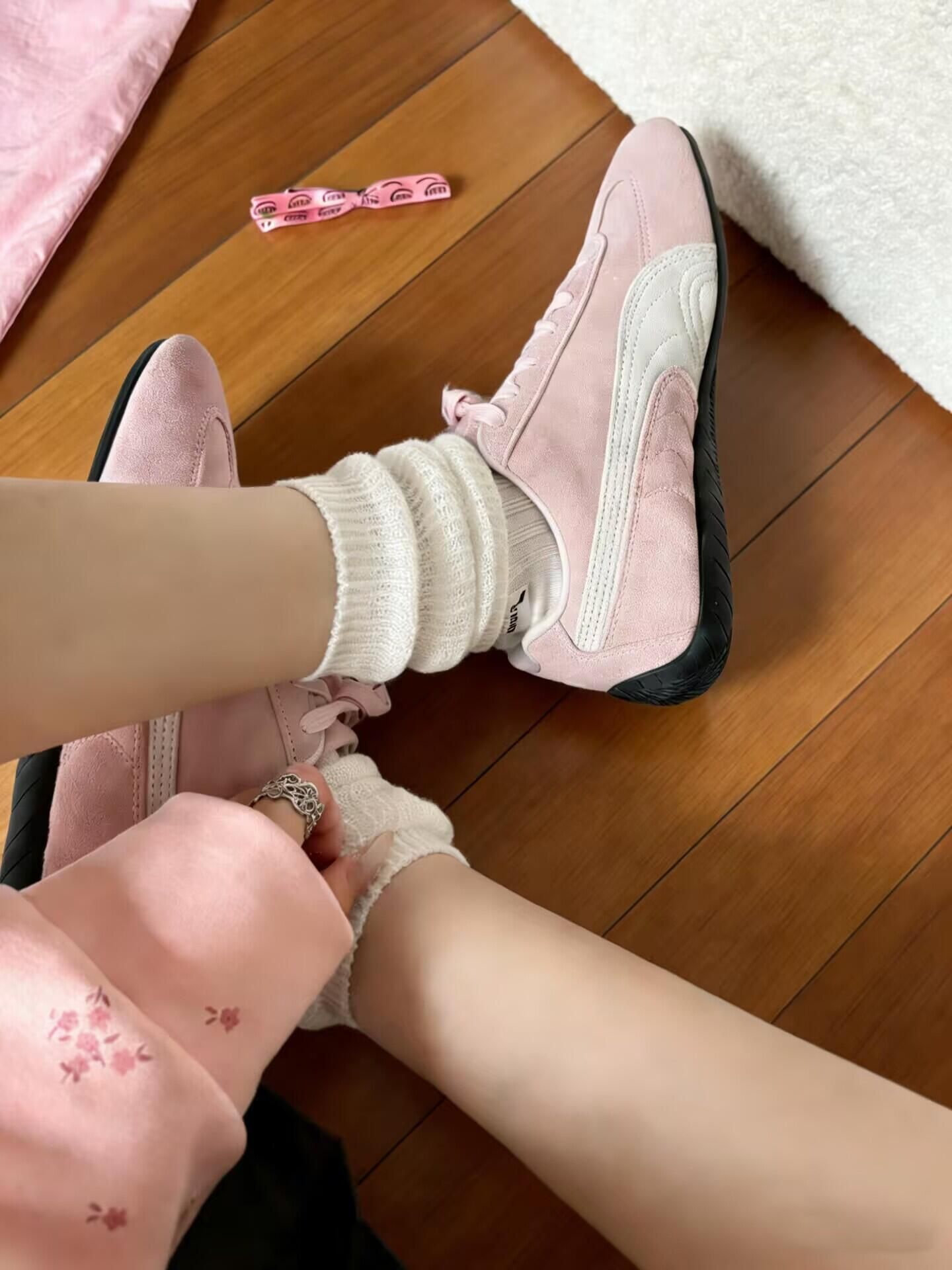 🌟经典复古赛车鞋型,黑麂皮+浅粉撞色真的戳中甜酷心巴!麂皮质感细腻,车线和鞋侧的PUMA Logo细节超精致,上脚显脚瘦显腿长,黑粉配色低调又吸睛,完全不挑穿搭风格。 🌟本来以为薄底会硬,结果上脚巨舒服!麂皮软乎乎的贴合脚型,鞋底有轻微回弹,逛街一下午也不累,通勤、上课、约会都能打,支撑性和轻便感平衡得刚刚好。