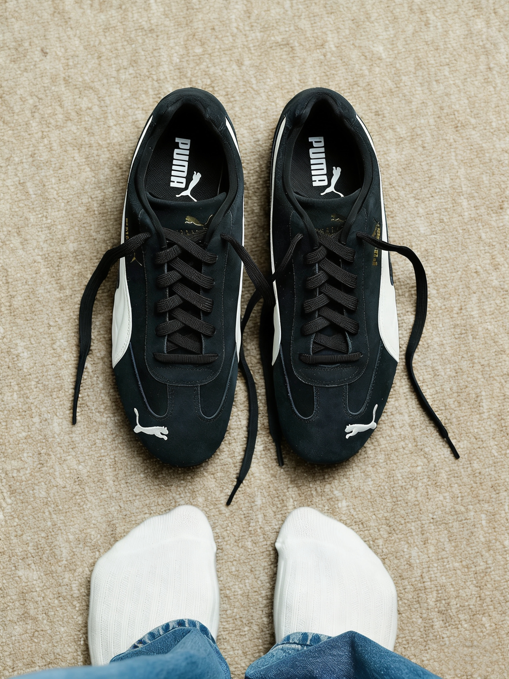 🌟黑麂皮+米白跑道Logo的组合太经典了,金色PUMA Logo点缀在鞋身,低调又高级,完全不会撞款。 🌟麂皮质感细腻到摸上瘾,车线和鞋型细节都很工整,复古赛车鞋的流线型设计还特别显脚瘦! 🌟麂皮鞋面软乎乎的,完全不磨脚,贴脚感满分。 🌟鞋底有轻微回弹,支撑性刚好,舒适度拉满!