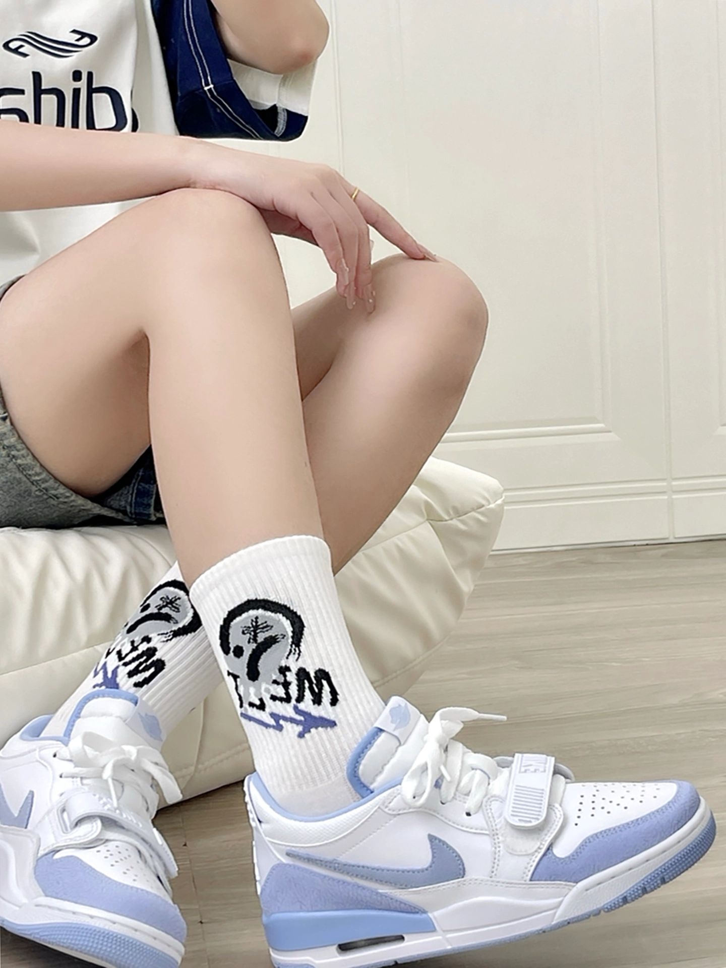 我今天穿新入的JOEDAN 312 baby蓝款出门啦☀️,和闺蜜去公园散步拍照~上衣浅粉短T,下装白色阔腿裤,脚踩彩色涂鸦袜,刚到就被闺蜜夸“鞋子好吸睛,整套穿搭超清新💗”。 鞋面是优质合成革,软乎乎的不硬,走了一小时也没磨脚😚。 不过白色部分容易脏,建议避开泥地,脏了用橡皮擦擦就行🧼。 尺码我37码正合适,瘦脚宽脚都能穿✅。 对啦,你们觉得这个配色搭牛仔短裙好看吗?来评论区聊聊呀👋!#秋冬跑...