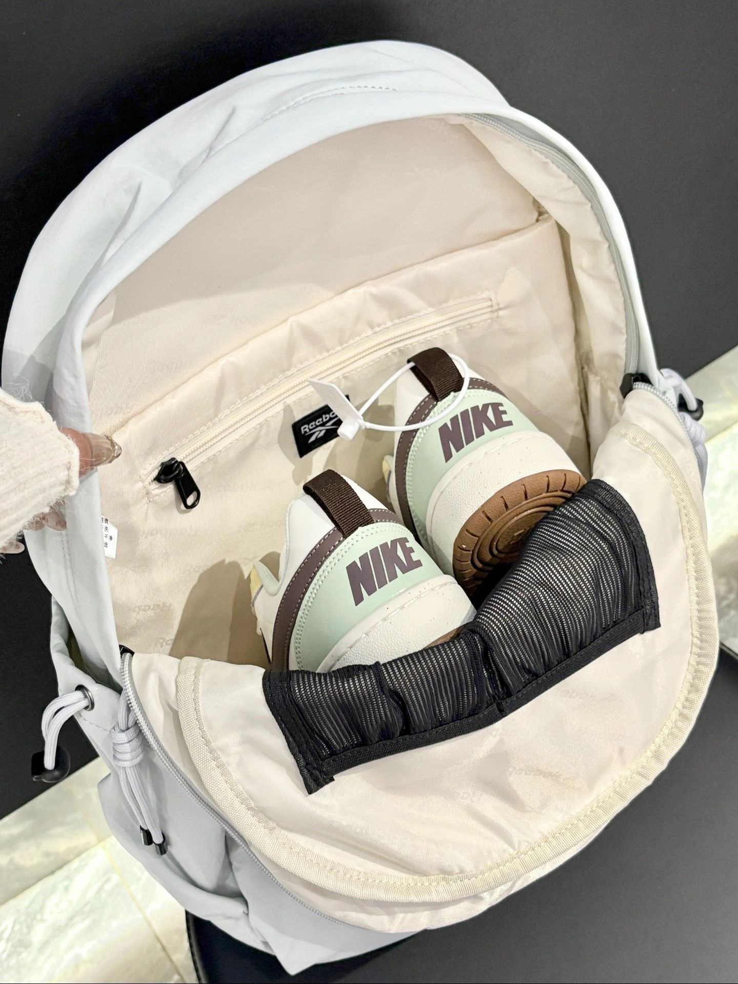我好喜欢我的新鞋子和新书包耶 nike薄荷绿和锐步baby蓝 两个如此清新的颜色看起来就好乖哦 双肩包的容量蛮大的,还有hin多隔层 我觉得粗去丸、通勤背它都蛮合适唉 #我不买包的fag又破了