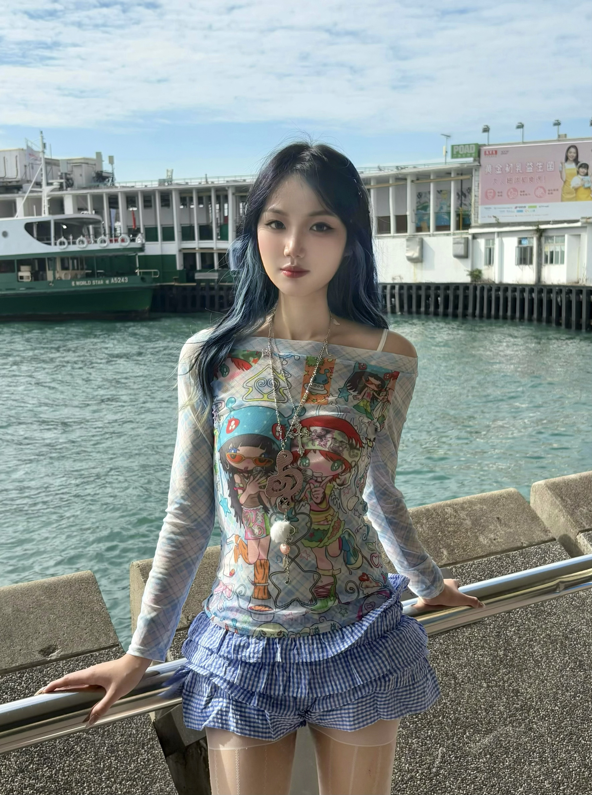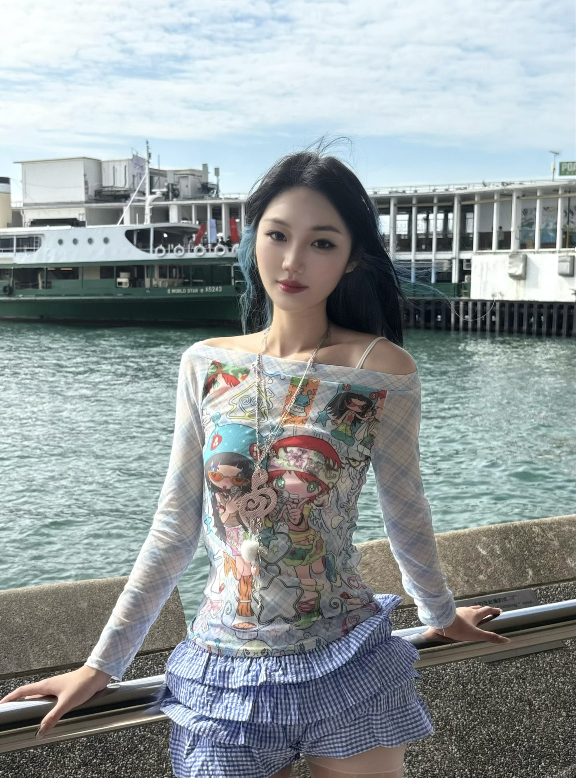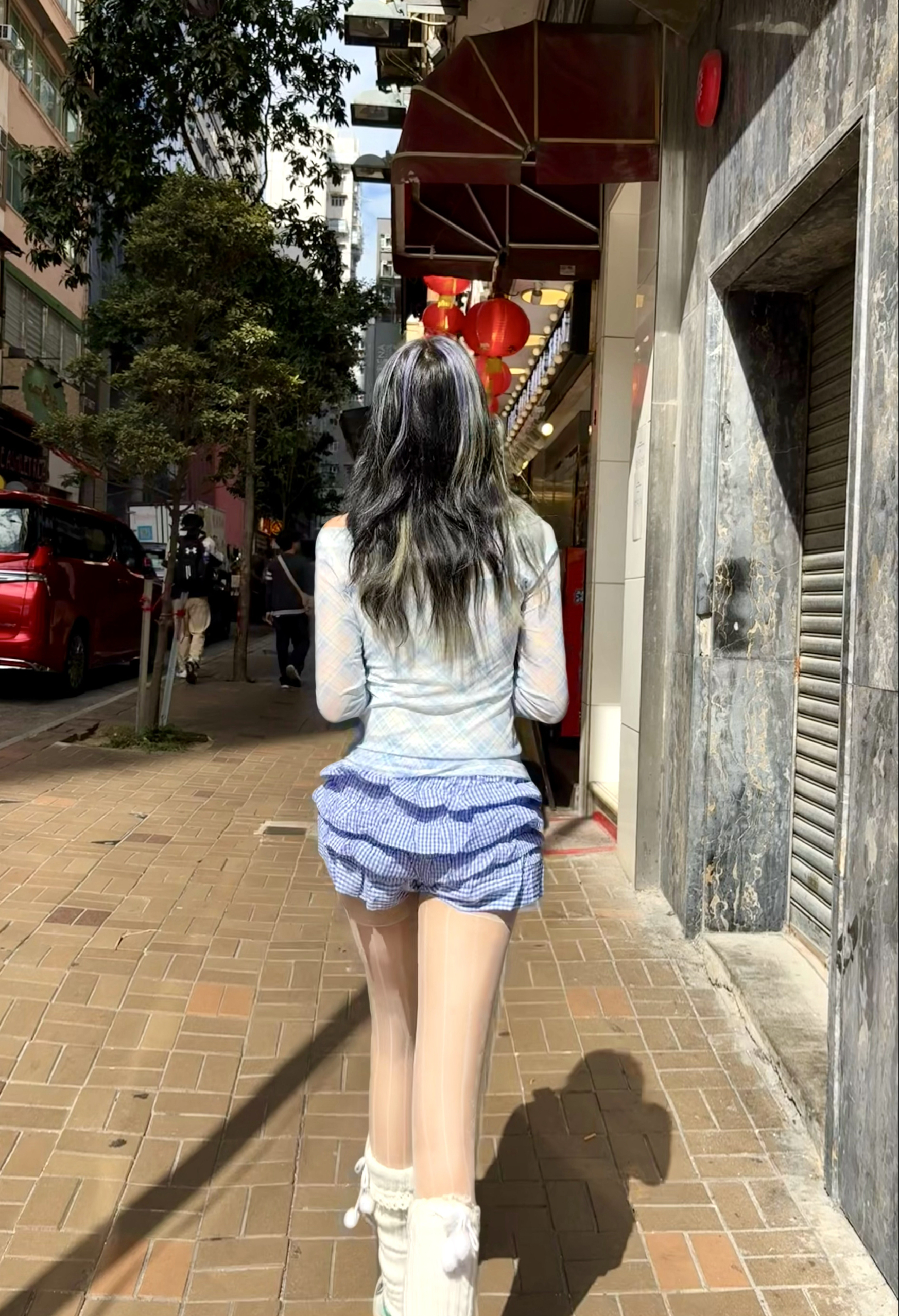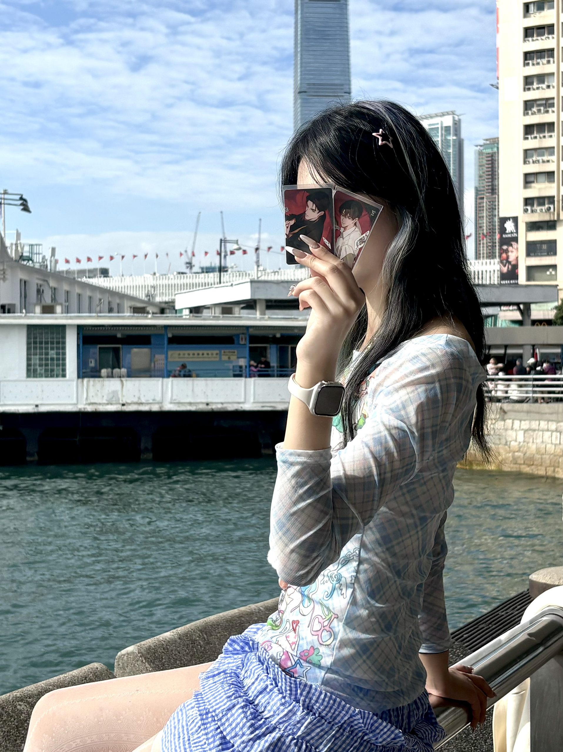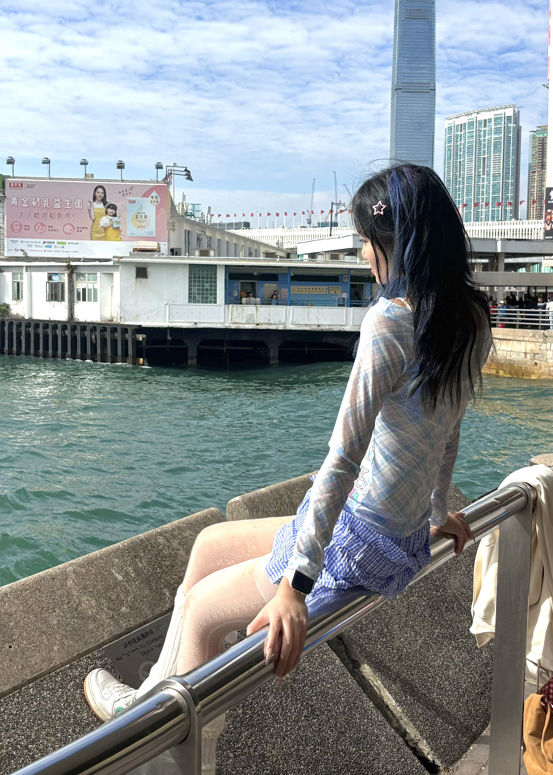在维港找到了神仙拍照点! 蓝天碧海+对岸的摩天大楼,随手一拍都是杂志大片感! 今天穿了蓝白配色的辣妹套装,印花网纱上衣自带透视小心机,配上低腰牛仔短裙,把好身材完美勾勒出来~ 香港的暖风吹得人懒洋洋的,这种松弛感穿搭和维港的适配度直接拉满! 姐妹们来香港玩一定要来这个机位打卡,绝对不踩雷!