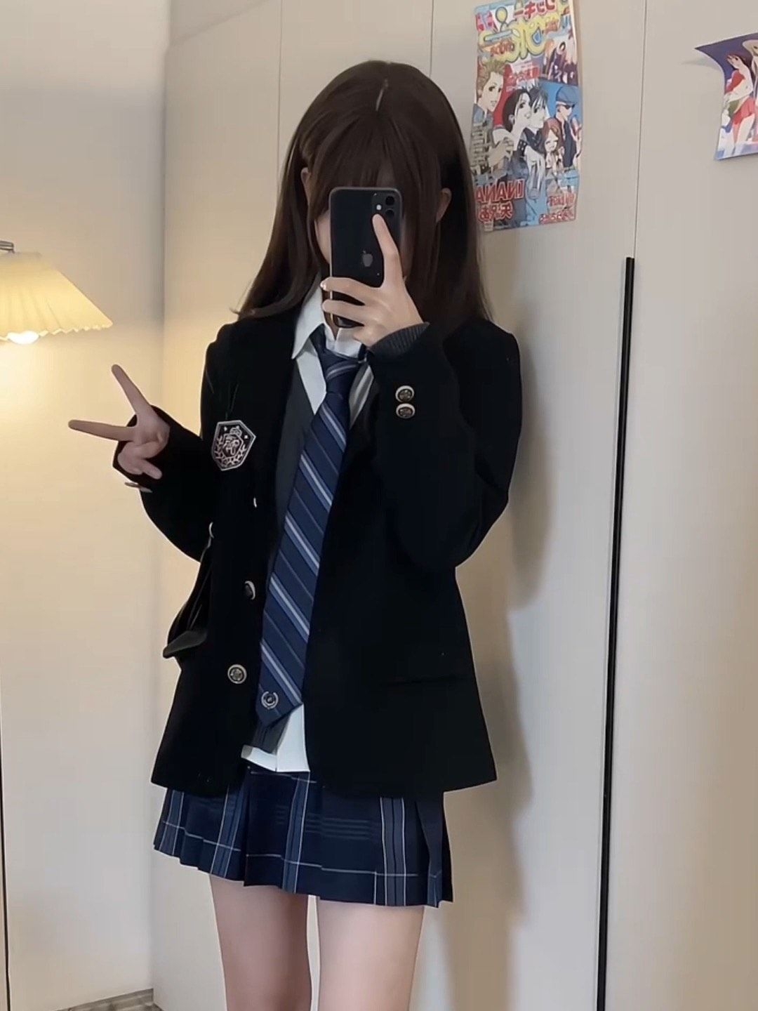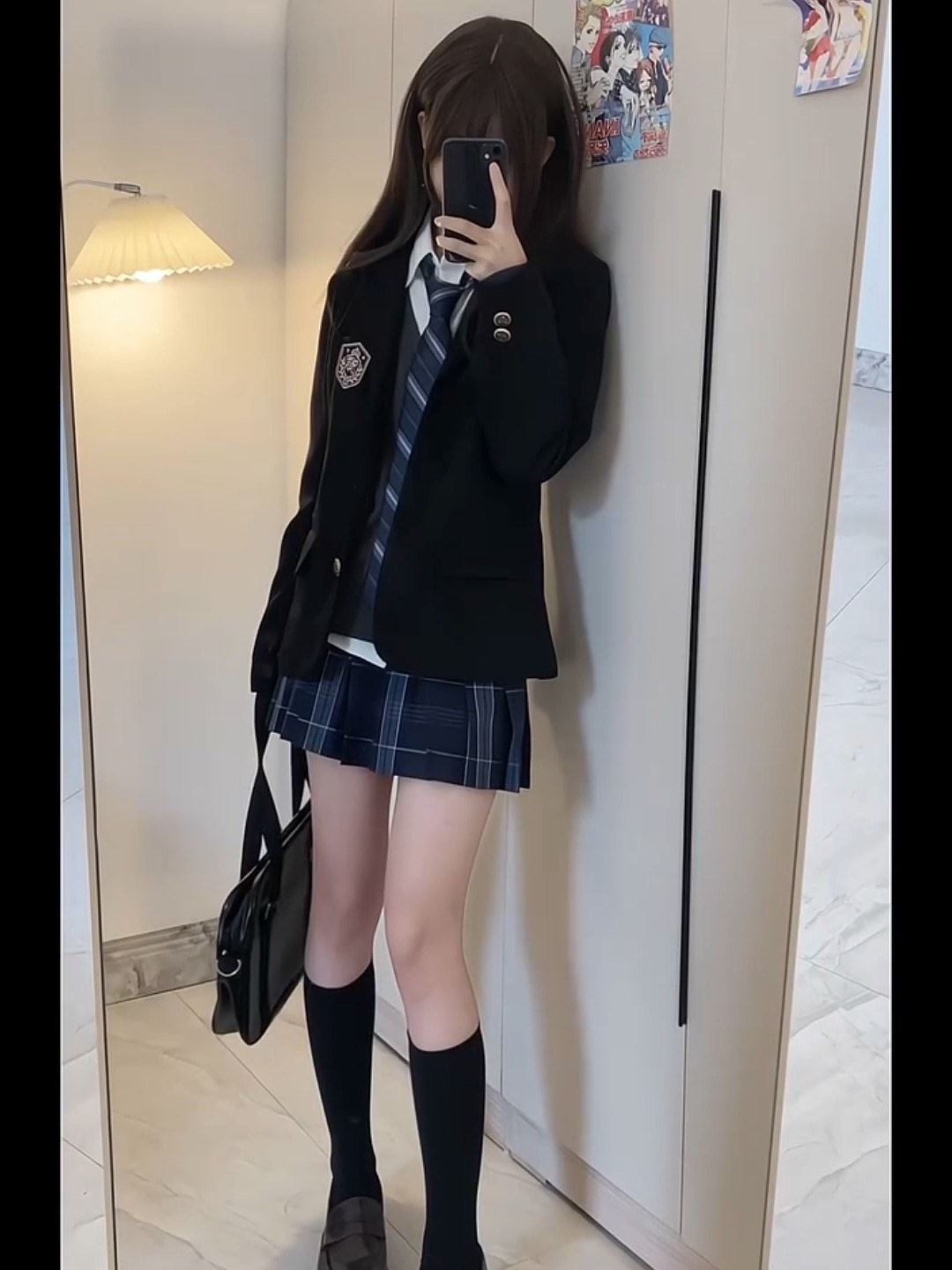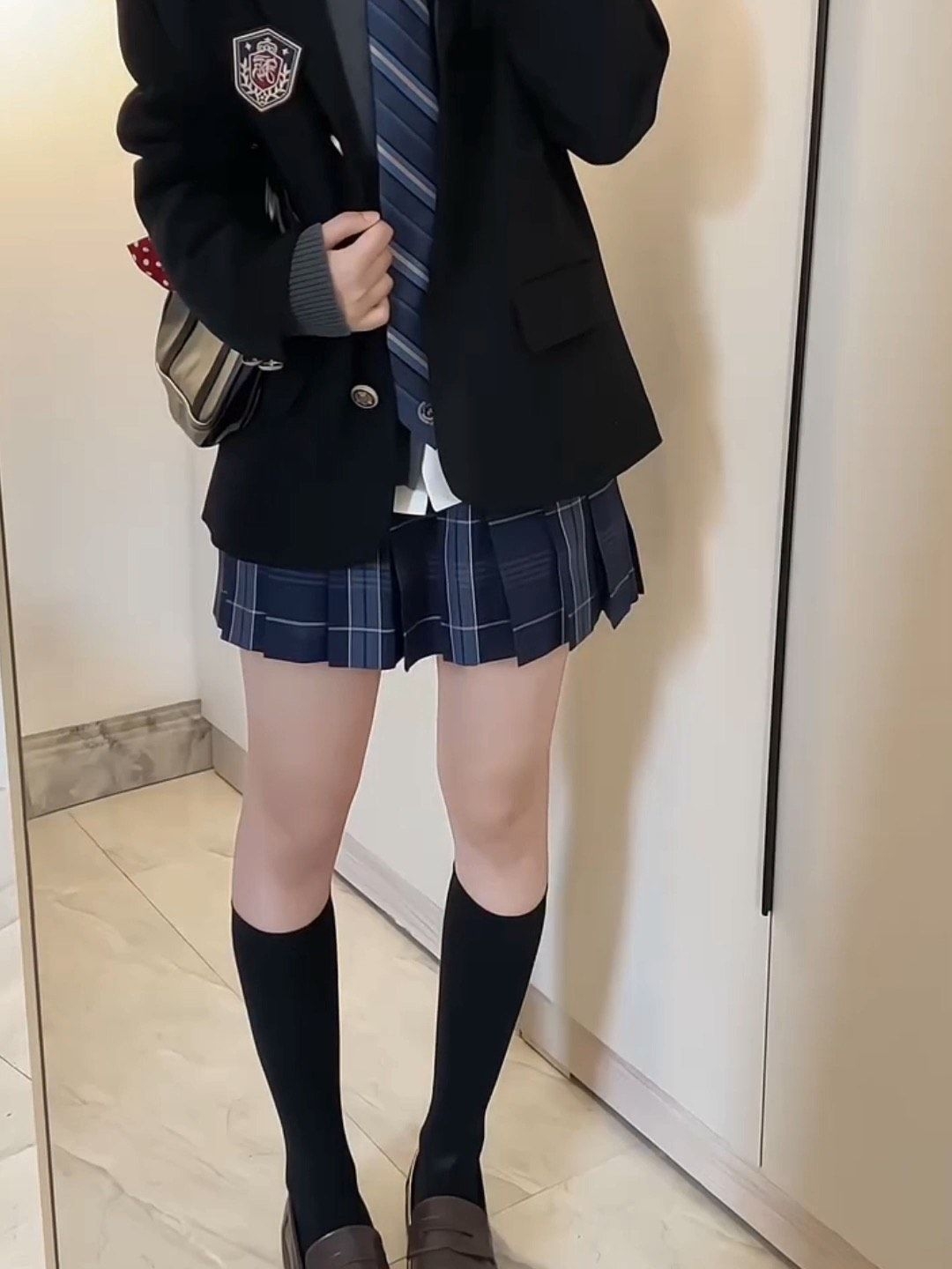黑西装的利落,蓝格裙的灵动,还有领带的细节,都在诉说着青春的故事。 在暖黄的灯光下,镜子里的自己,温柔又坚定。 原来,最好的穿搭,是让自己成为自己喜欢的样子。