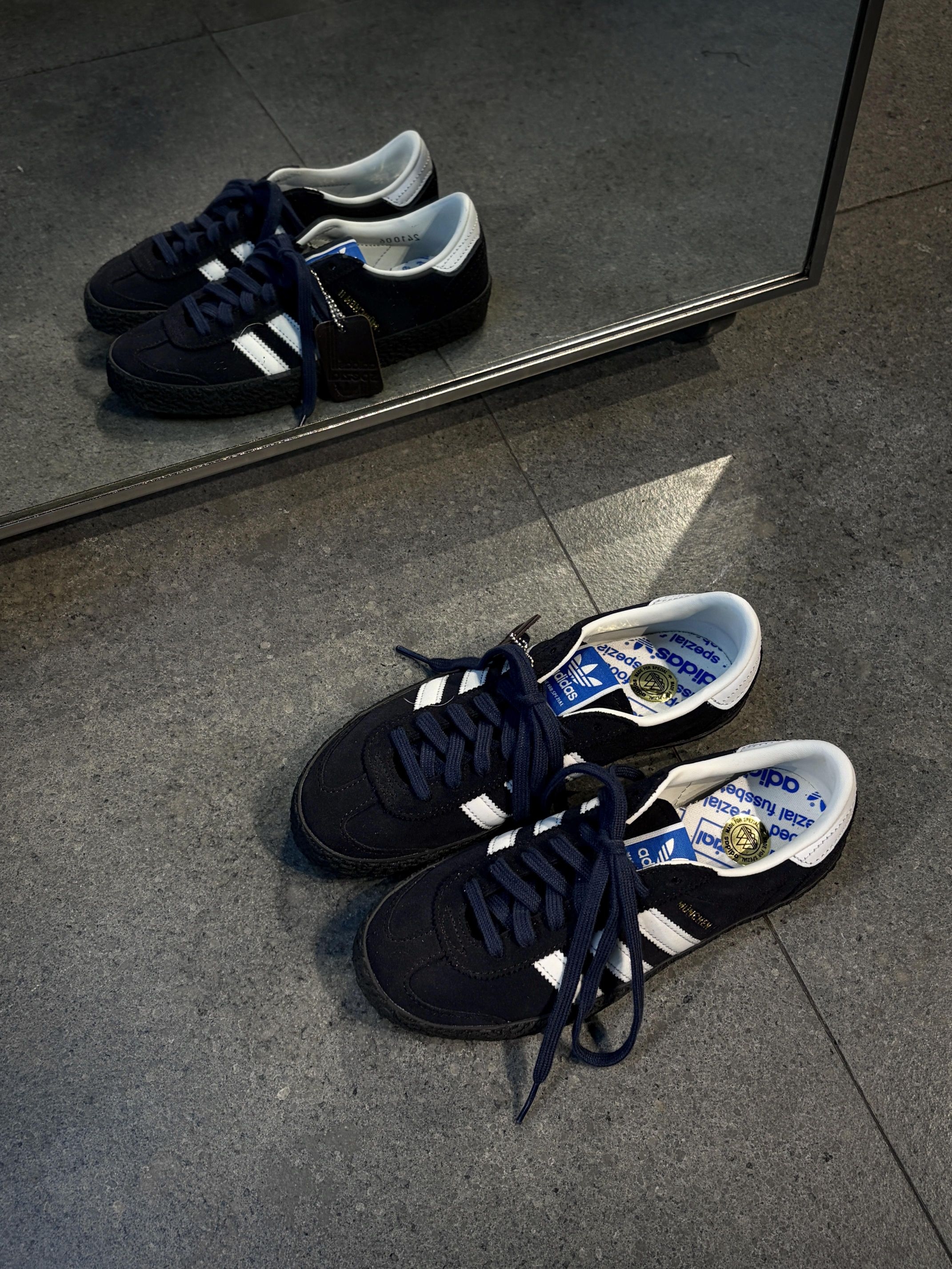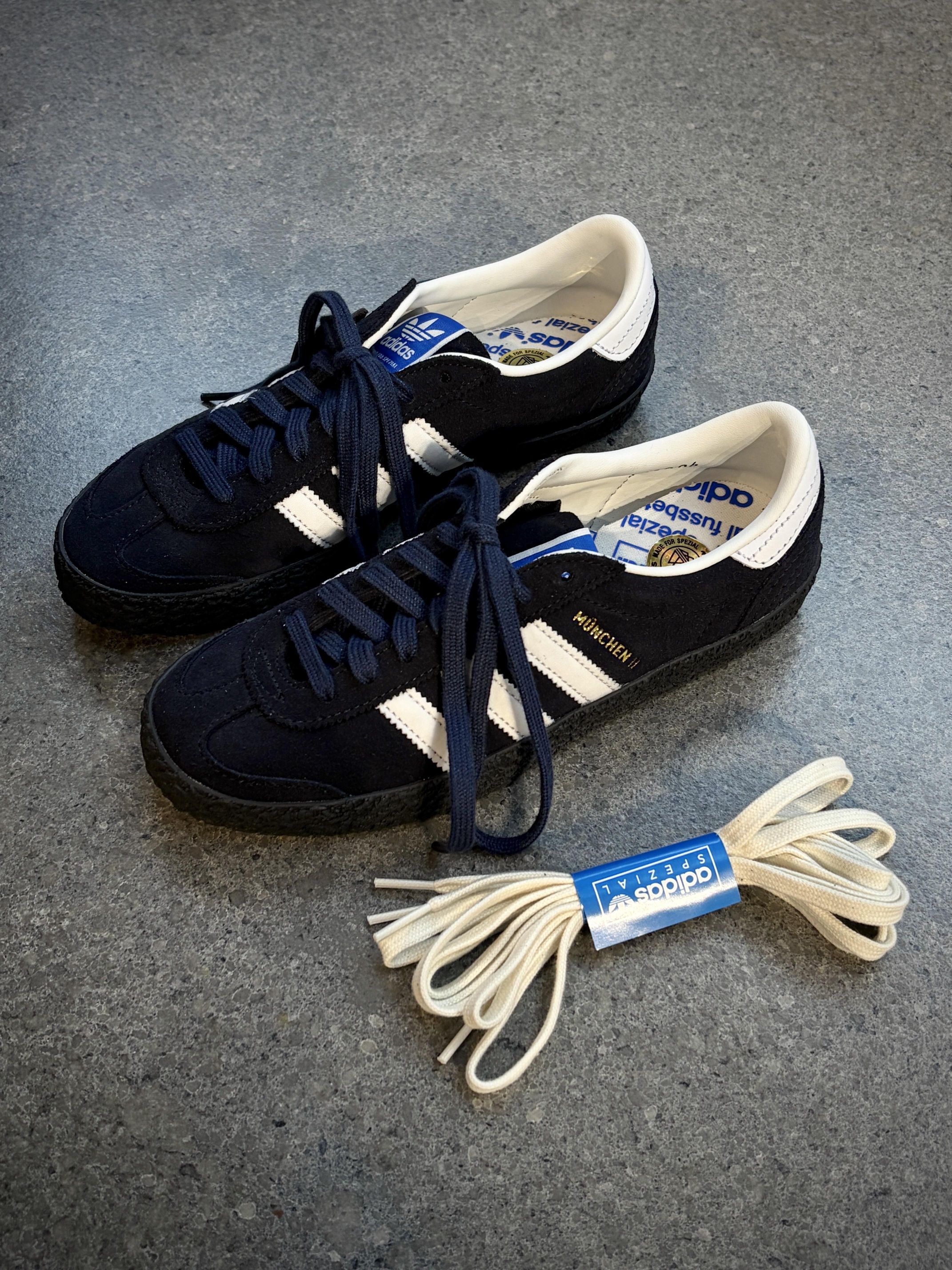 adidas Spezial Miinchen II ✨简直是复古风爱好者的梦中情鞋! 蓝黑色翻毛皮搭配白色三条纹,低调又有质感。鞋舌上的蓝色logo和鞋侧的金色Miinchen II字样,细节满满,每一处都彰显着复古的魅力。