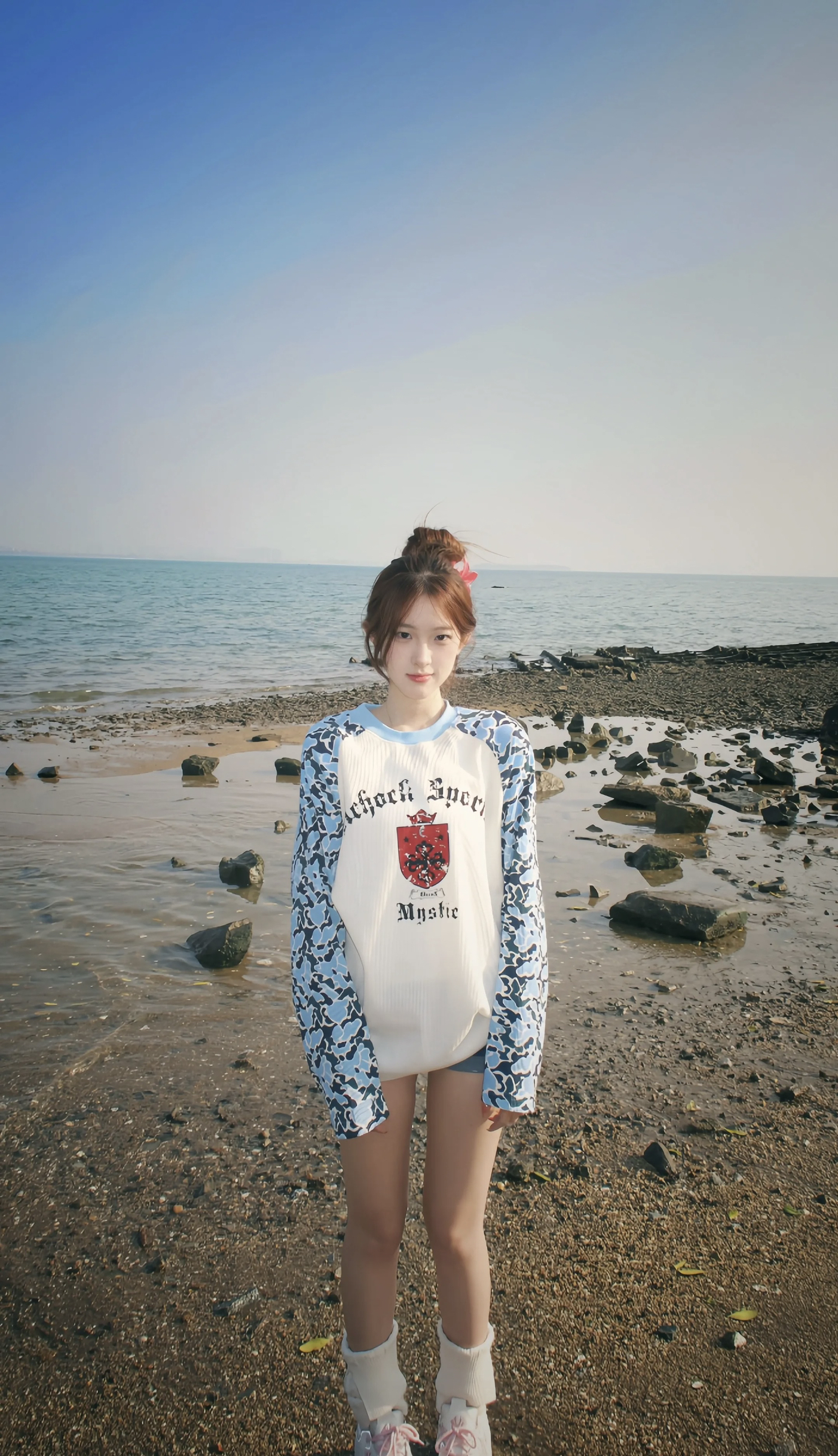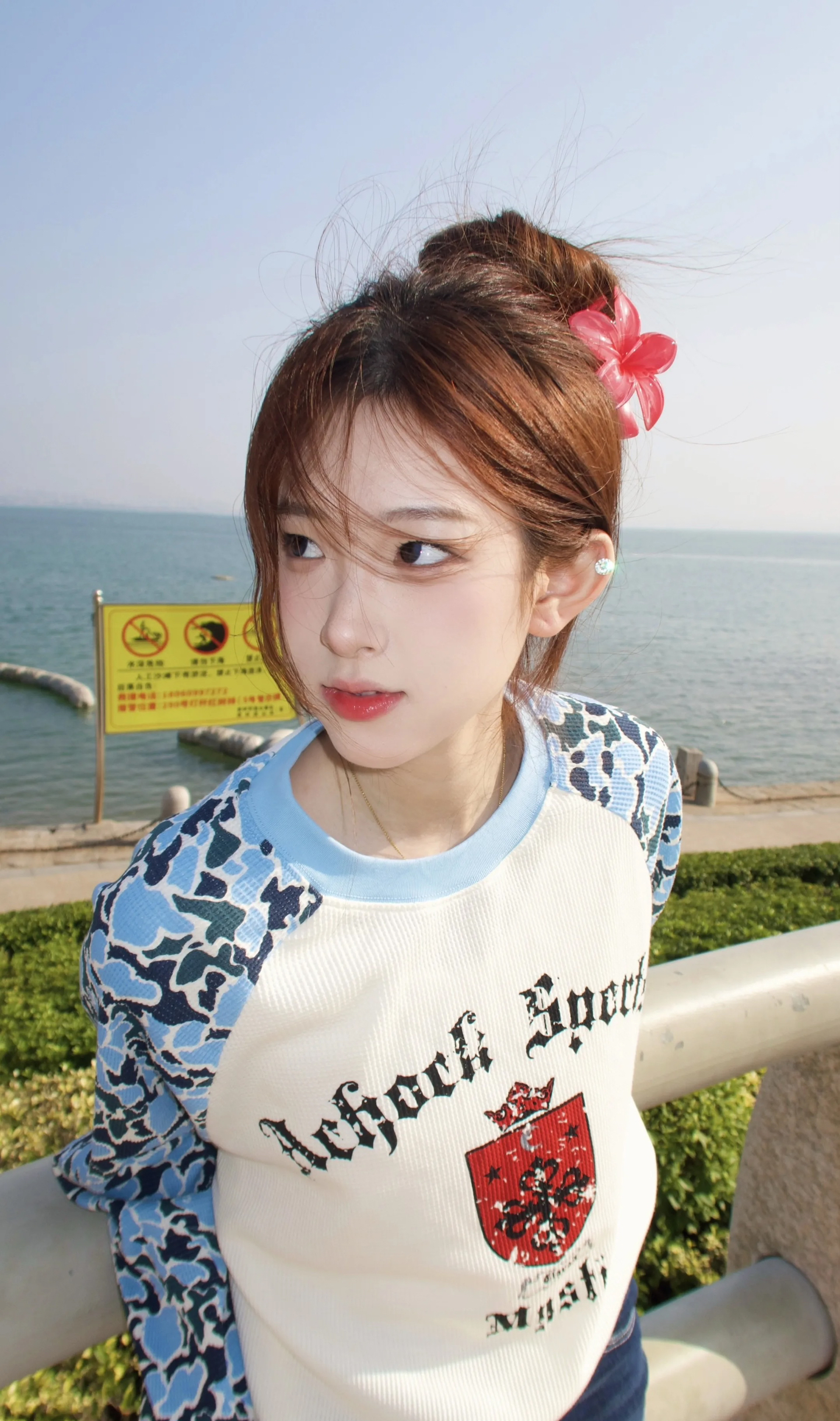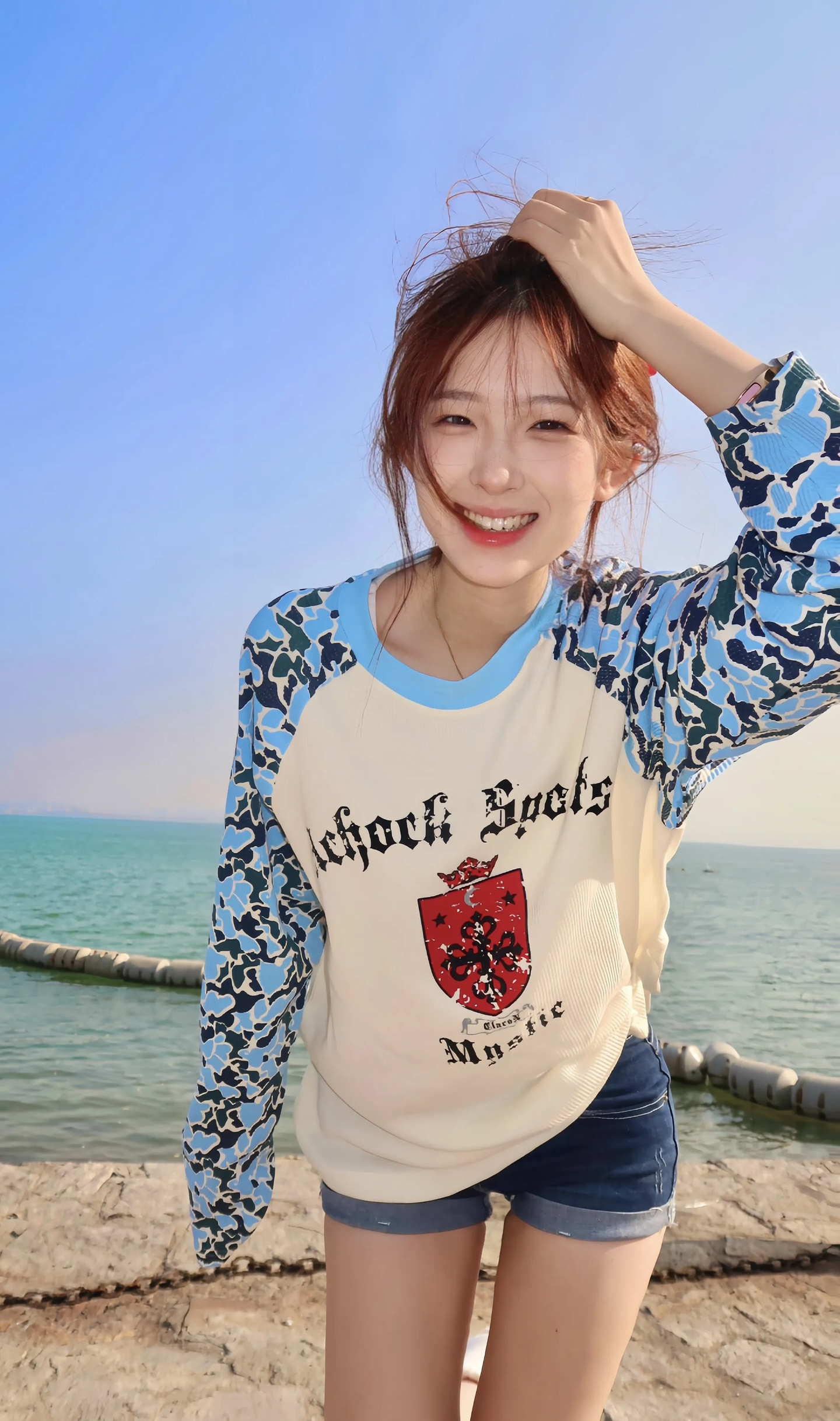 今天穿的这件A chock美式复古拼接上衣,真的是我的心头爱!蓝白迷彩撞色袖子超吸睛,胸口的复古徽章印花又带点学院感,华夫格面料软fufu的还很透气🥳