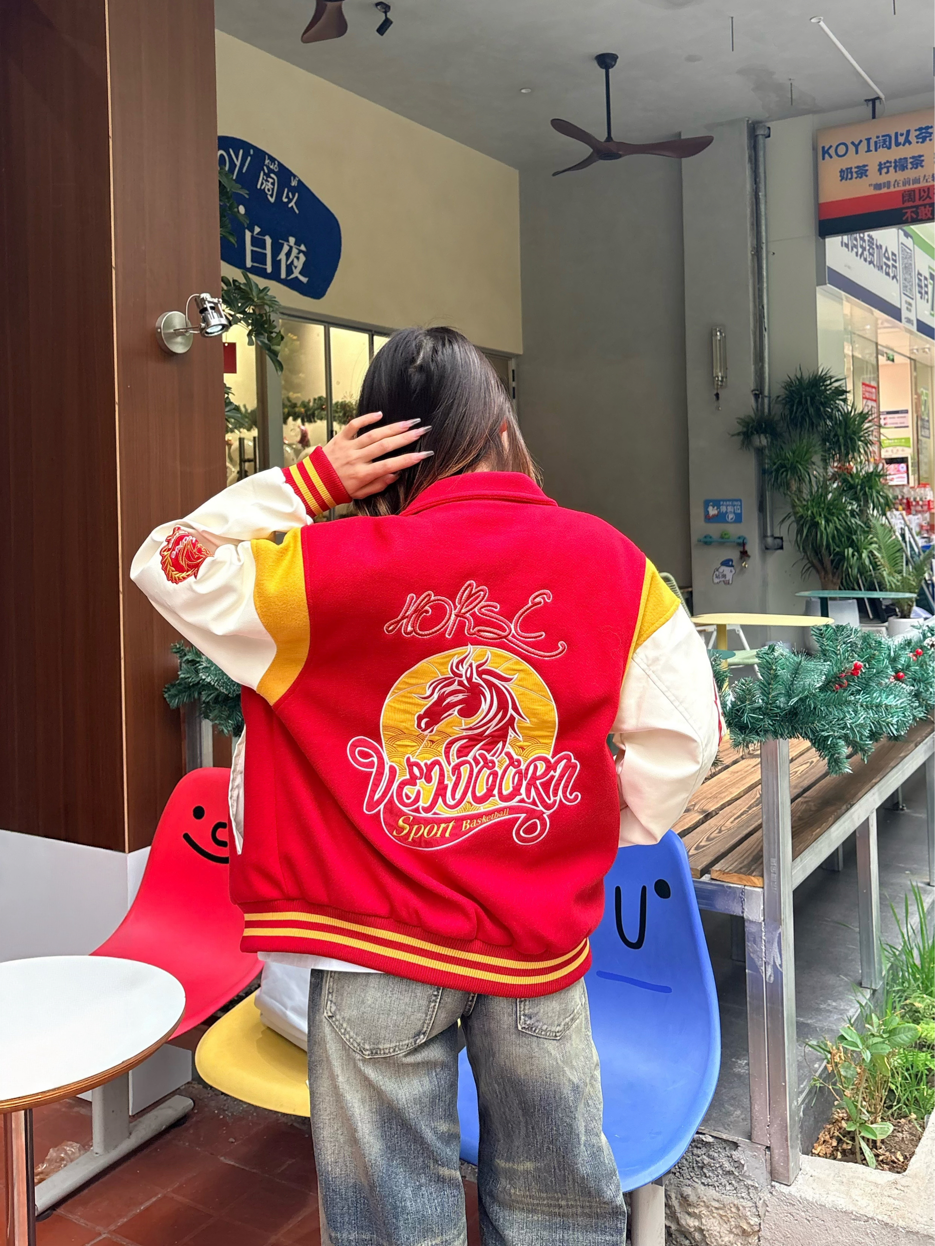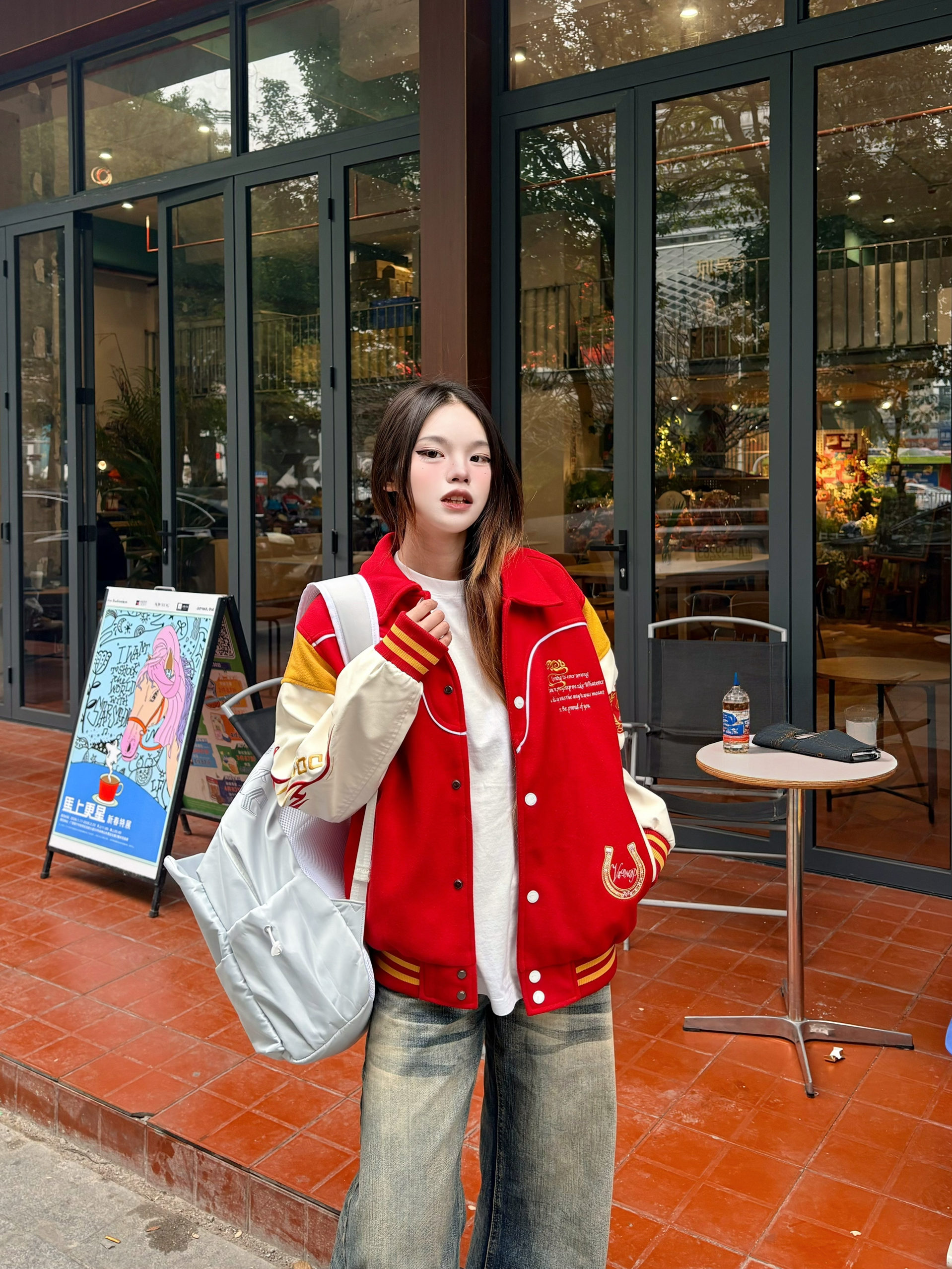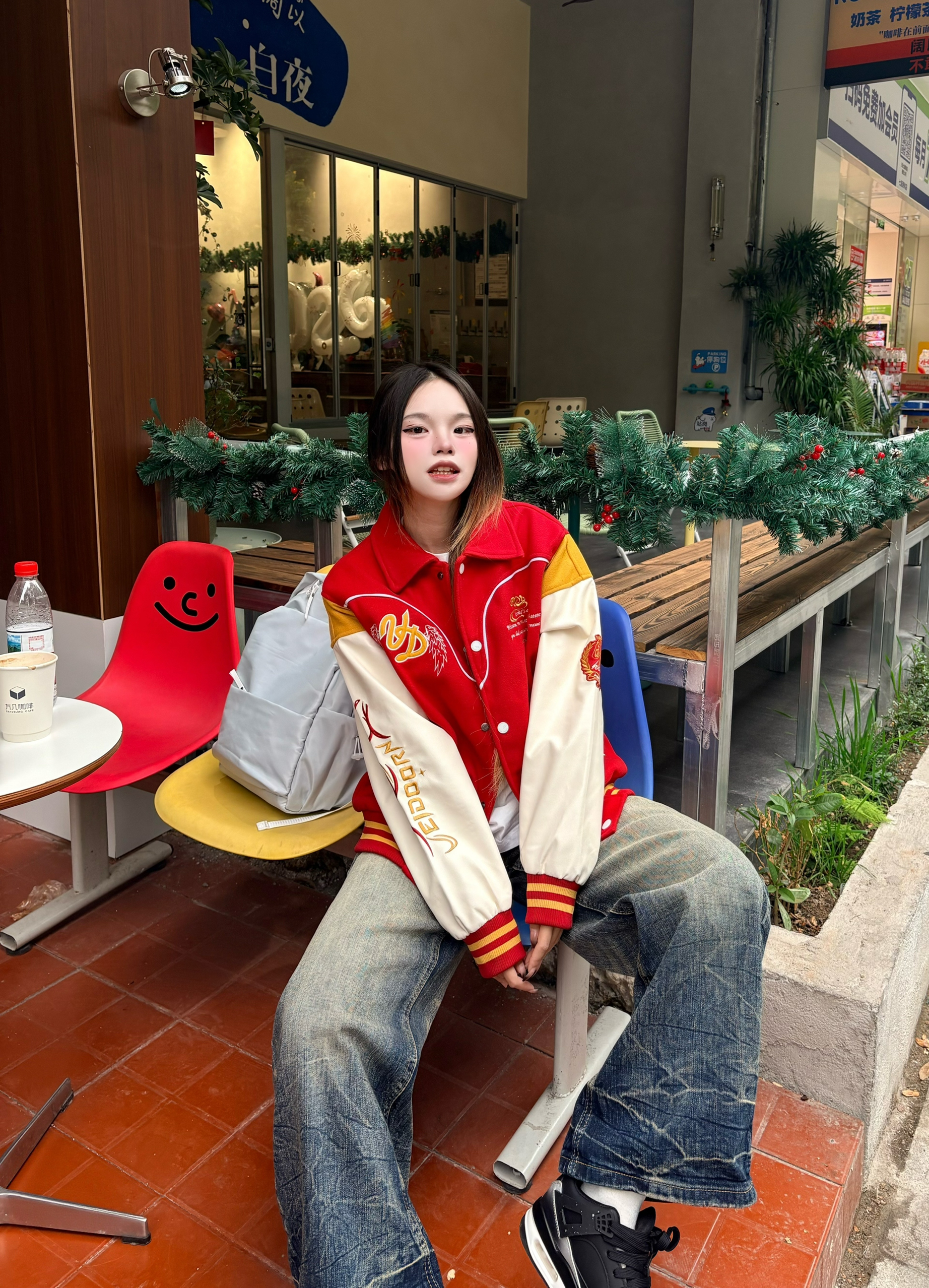✨ 这件红金配色的棒球服真的戳中我 后背的骏马刺绣又飒又有年味,红+米白+黄的拼接复古感拉满。 搭配做旧阔腿牛仔裤+黑球鞋🖤 不管是街头出街还是咖啡店打卡都超吸睛。 新年穿它,回头率和好运一起爆棚 🧧 我165/96 穿的m码