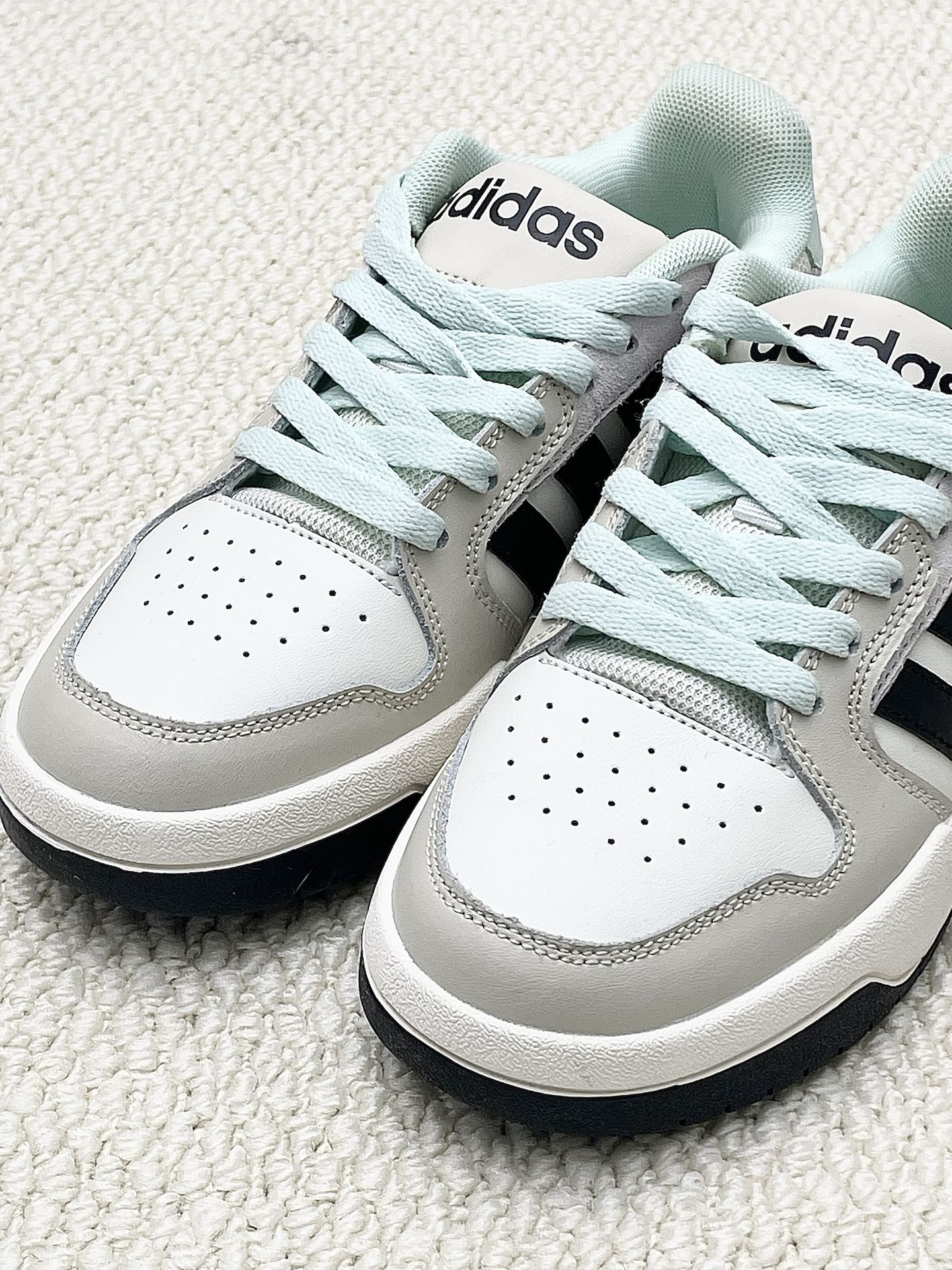 adidas介双板鞋真的入我心坎里了 灰白黑三种配色看起来简约又复古 鞋头采用透气孔设计透气性好,鞋面毕竟是皮革夏天穿可能会有点脚闷 上脚我觉得还蛮舒服的不掉跟,鞋底不算硬一天下来也没觉得累脚