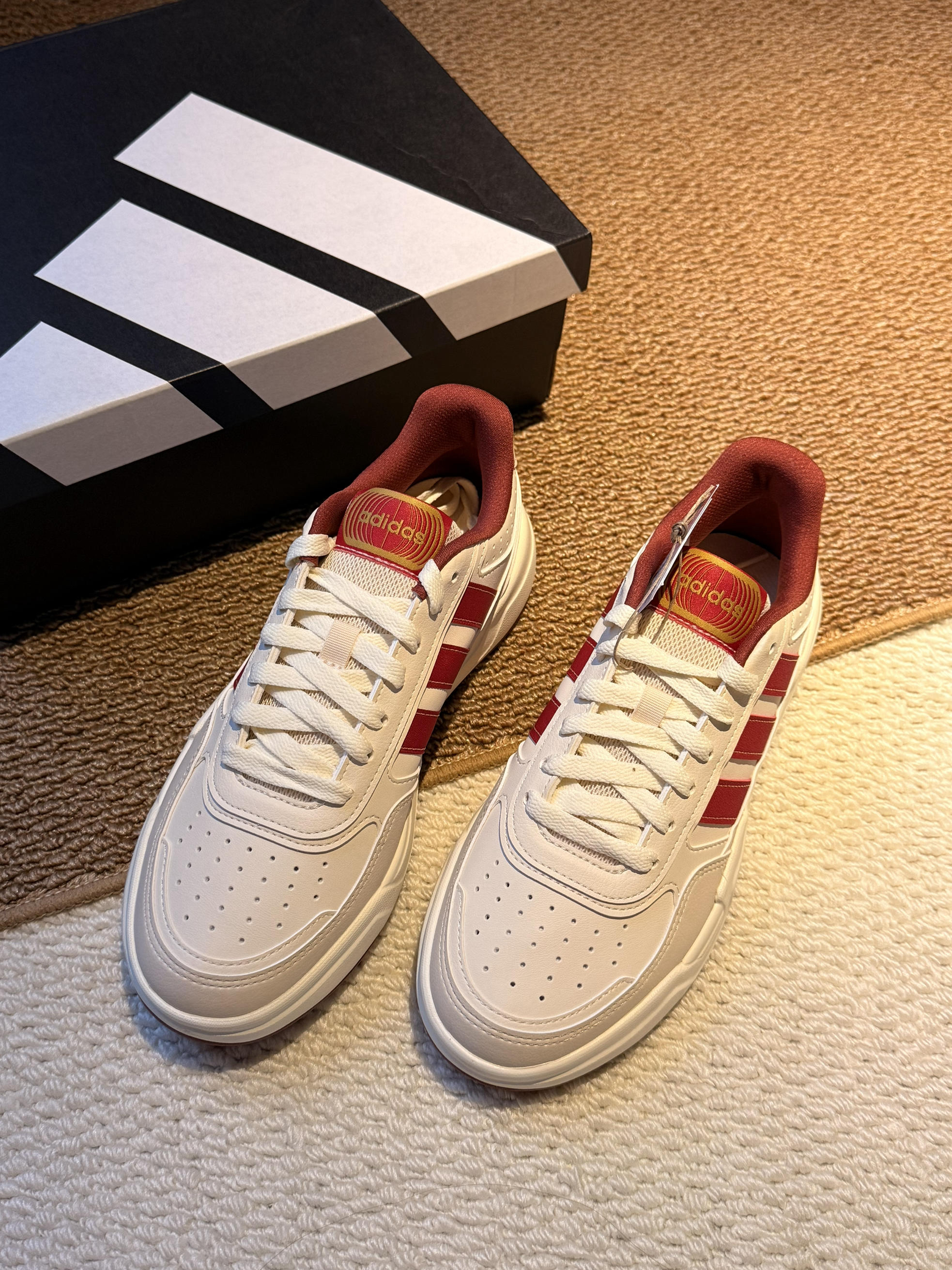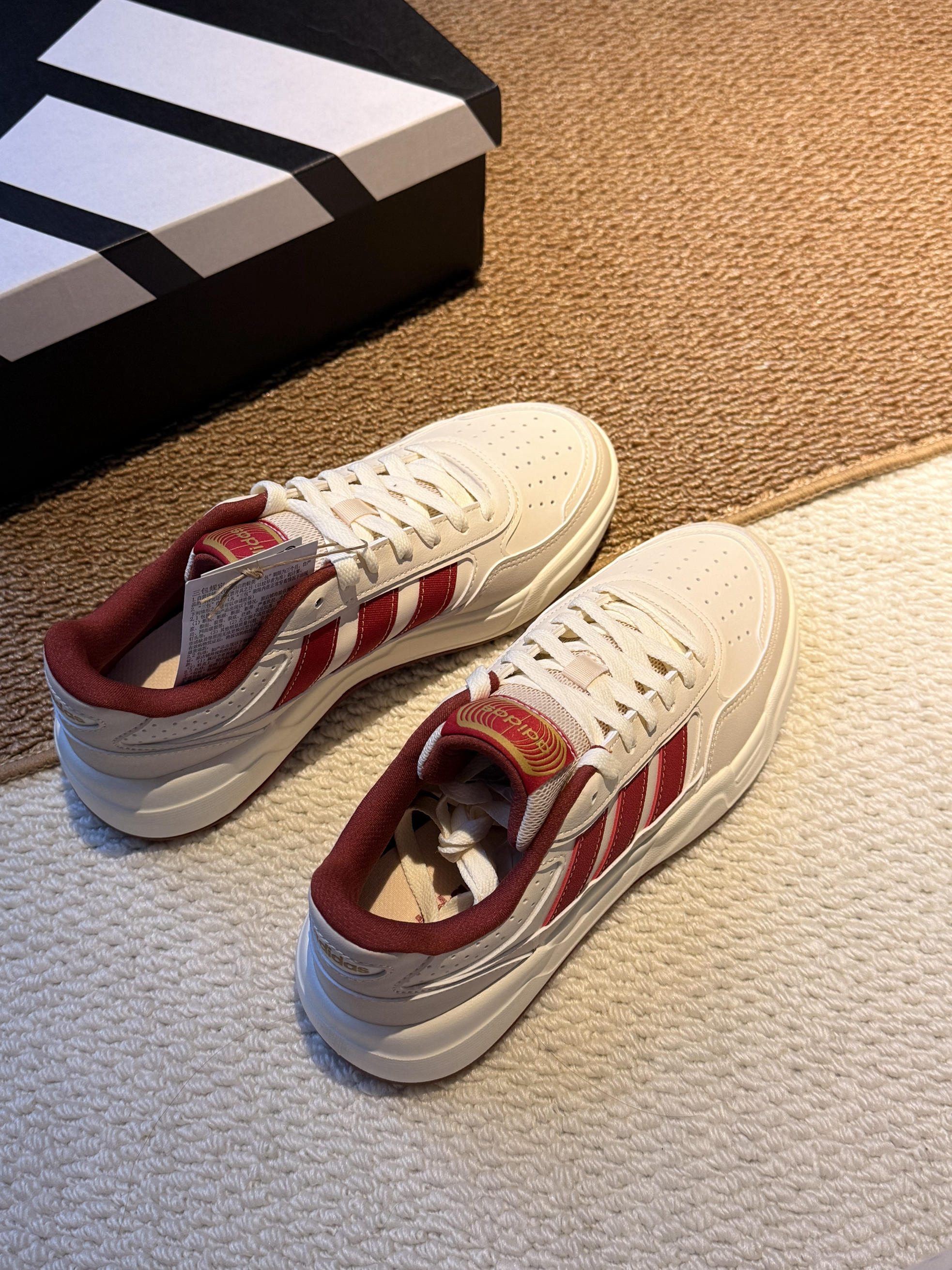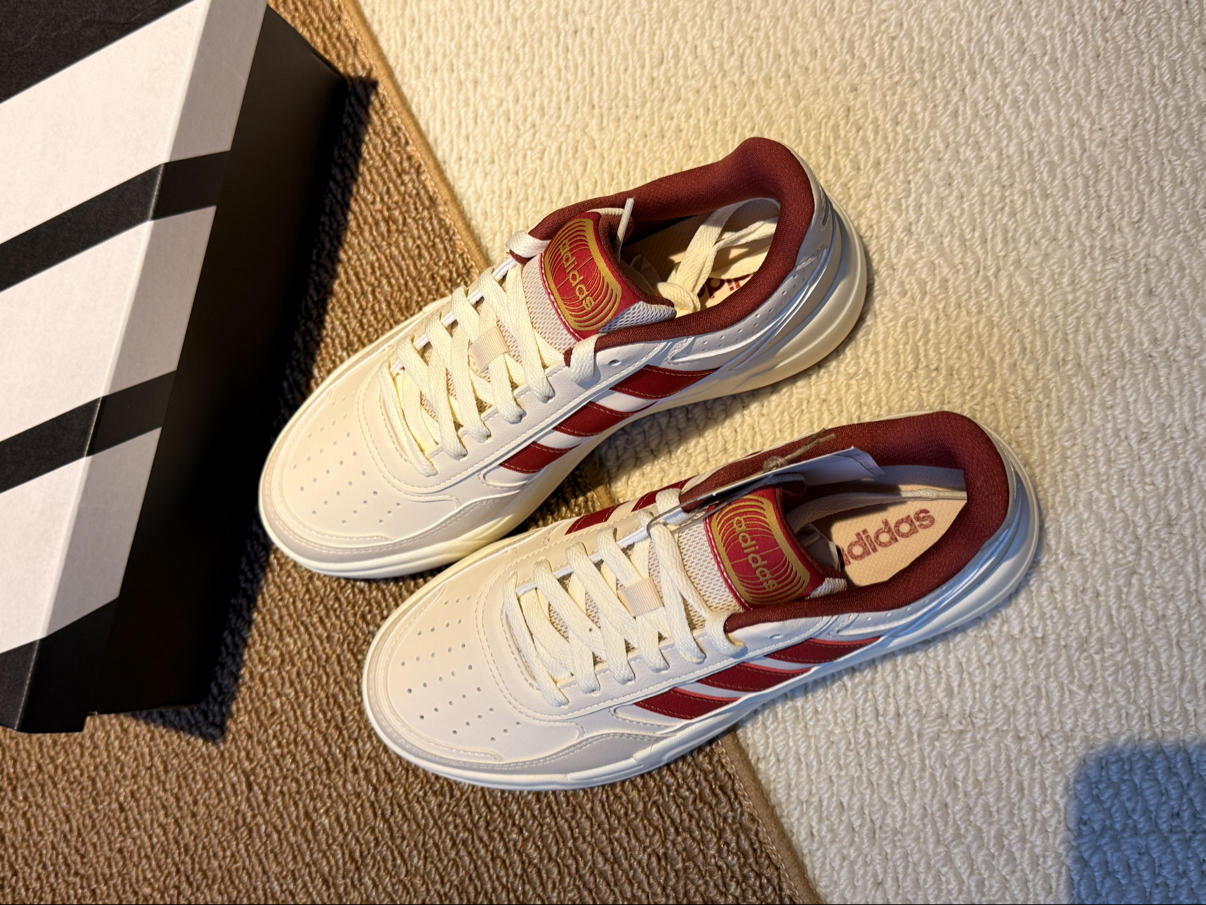 刚入的这双阿迪新年限定,实物比图片还要好看! 拿到手第一感觉就是质感超棒,米白鞋身配酒红三条杠,再加上鞋舌的烫金logo,那种过年的喜庆氛围直接就拉满了。 我平时穿37码,这双码数很正,上脚之后脚感软乎乎的,厚底大概有3cm,悄悄增高还不累脚,到时候走亲戚一天下来都不会觉得磨脚。 搭大衣或者牛仔裤都超适配,我爸都说这鞋看着就喜庆,讨个“步步高升”的好彩头。新年穿新鞋,这双真的是把年味和舒适...