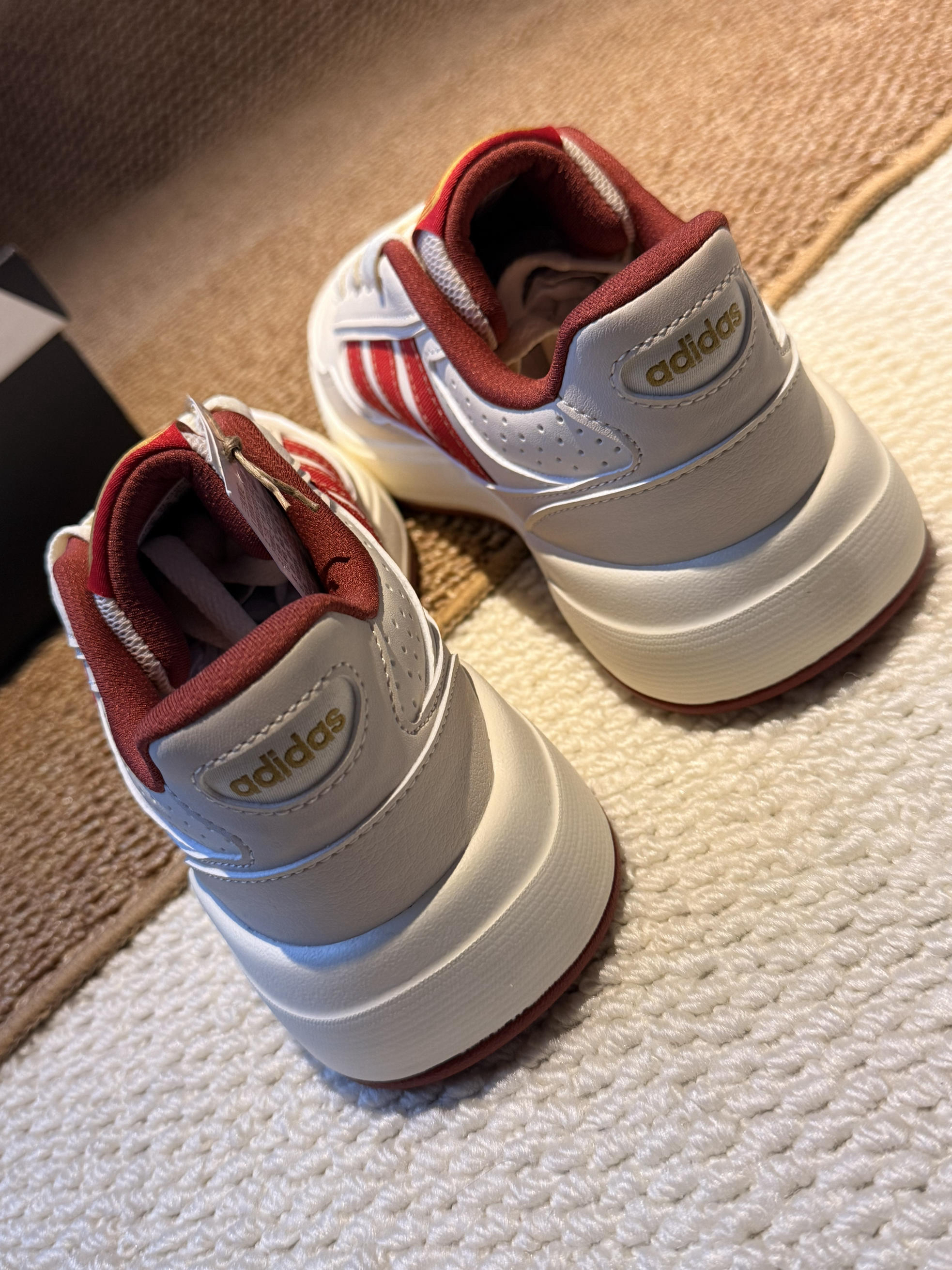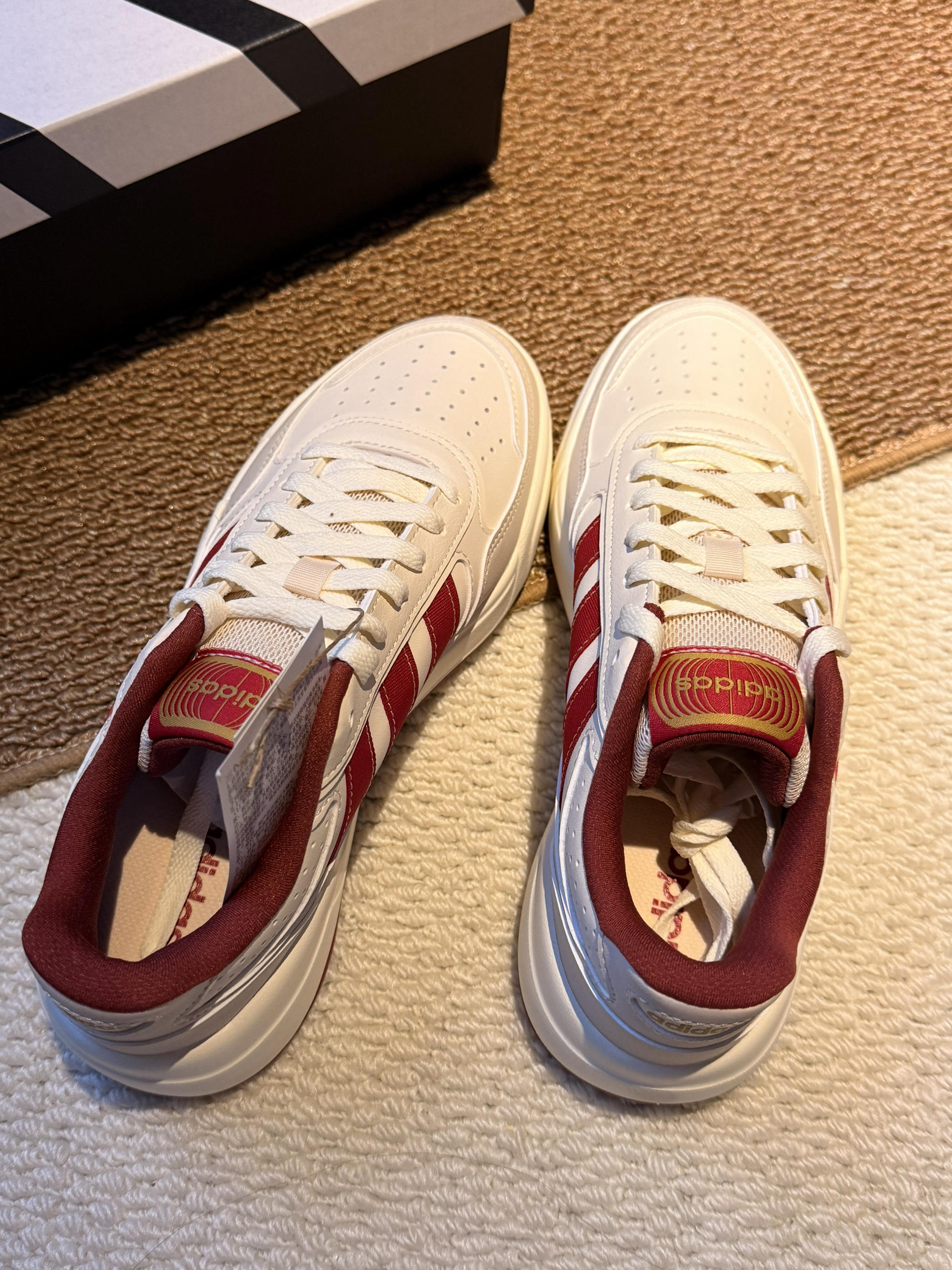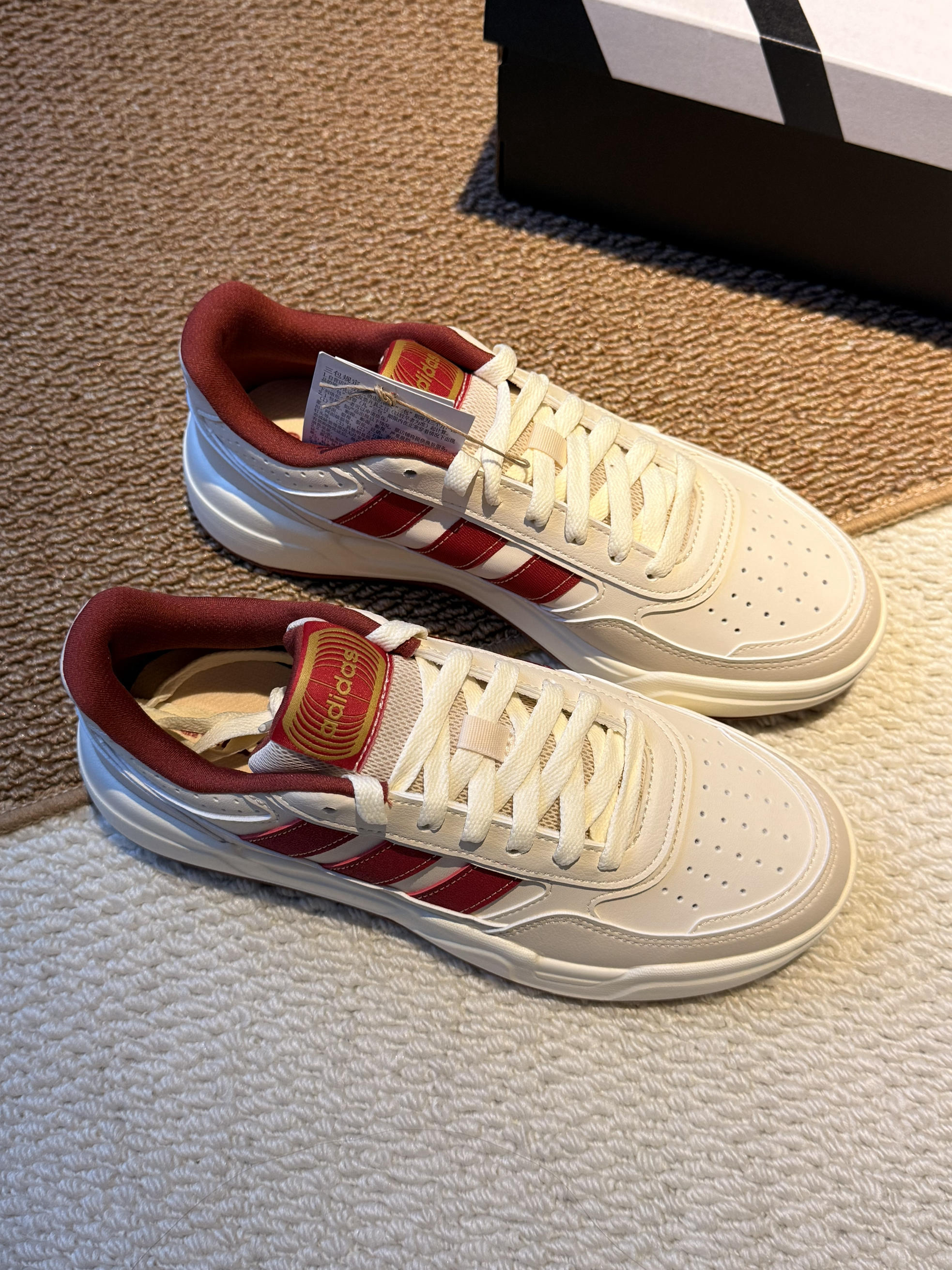 刚入的这双阿迪新年限定,实物比图片还要好看! 拿到手第一感觉就是质感超棒,米白鞋身配酒红三条杠,再加上鞋舌的烫金logo,那种过年的喜庆氛围直接就拉满了。 我平时穿37码,这双码数很正,上脚之后脚感软乎乎的,厚底大概有3cm,悄悄增高还不累脚,到时候走亲戚一天下来都不会觉得磨脚。 搭大衣或者牛仔裤都超适配,我爸都说这鞋看着就喜庆,讨个“步步高升”的好彩头。新年穿新鞋,这双真的是把年味和舒适...