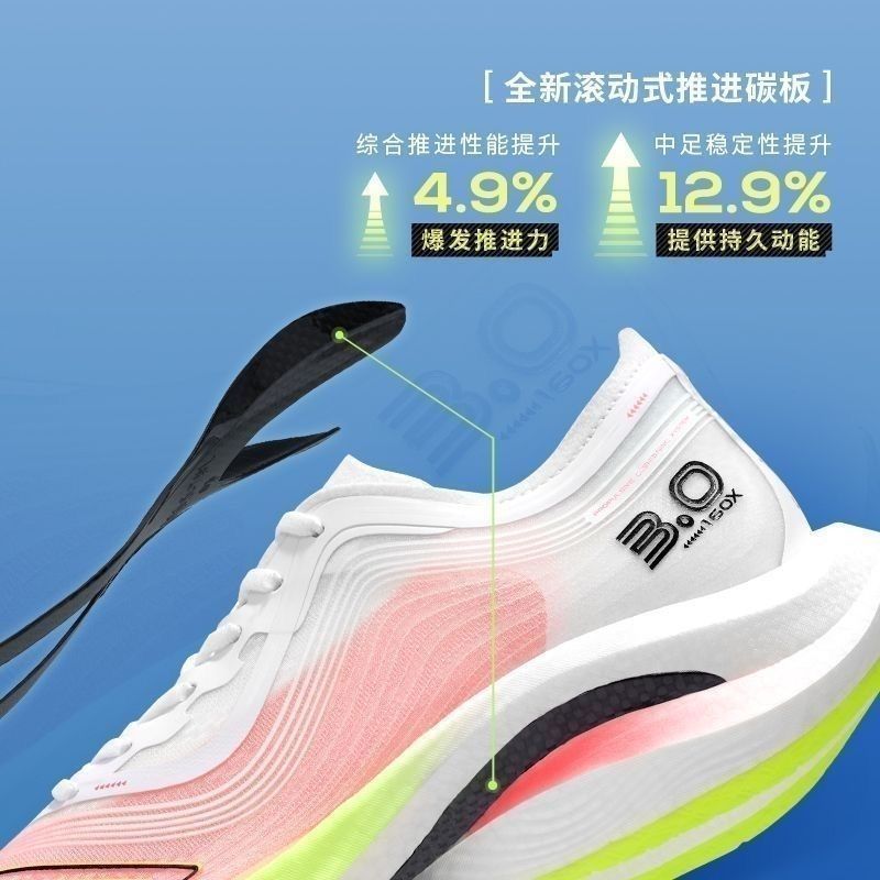 跑马人的破风神器终于来了!特步160X3.0竞速碳板跑鞋,17年马拉松专业积淀打造的国产顶流,从专业赛场到大众进阶,一双解锁速度与舒适的双重体验,不管是冲全马PB、练田径间歇,还是日常高强度拉练,脚感直接拉满! 全掌异构碳板+动力巢PB超临界中底直接焊死推进力,8°前掌上翘+85%超高回弹率,每一次蹬地都像踩在弹簧上,蹬伸效率提升15%,每公里轻松省3%体能,30公里后依旧不卸力,再也不怕后半...