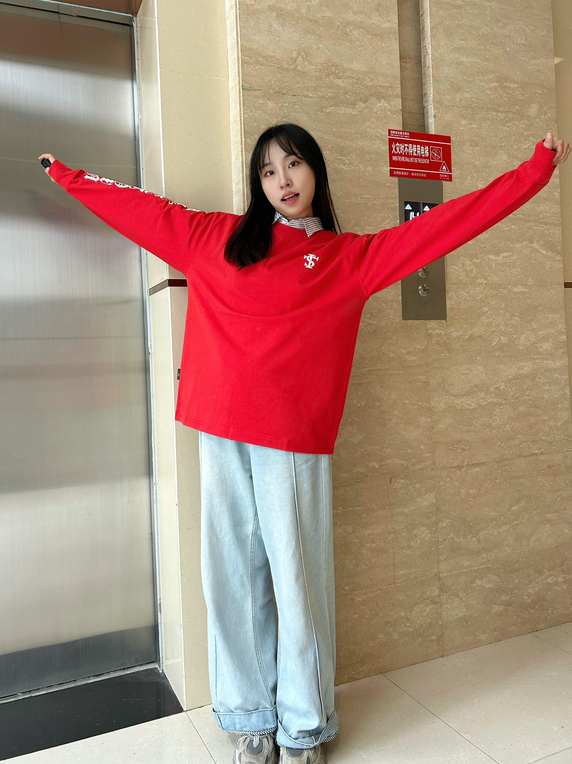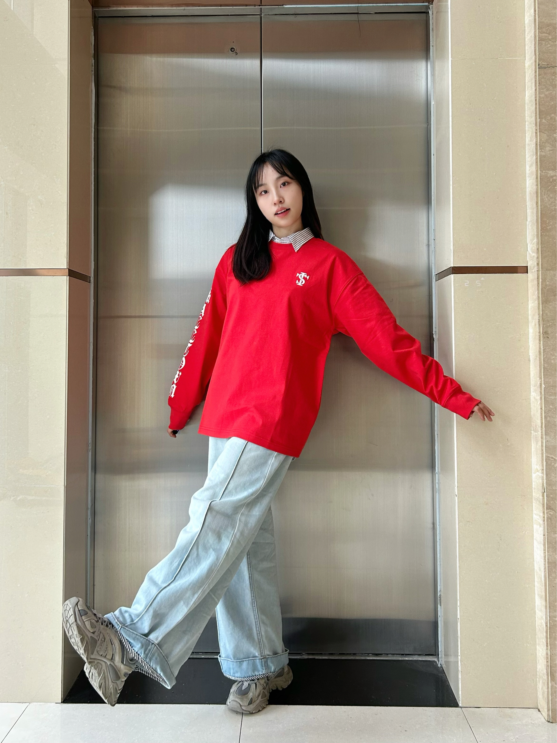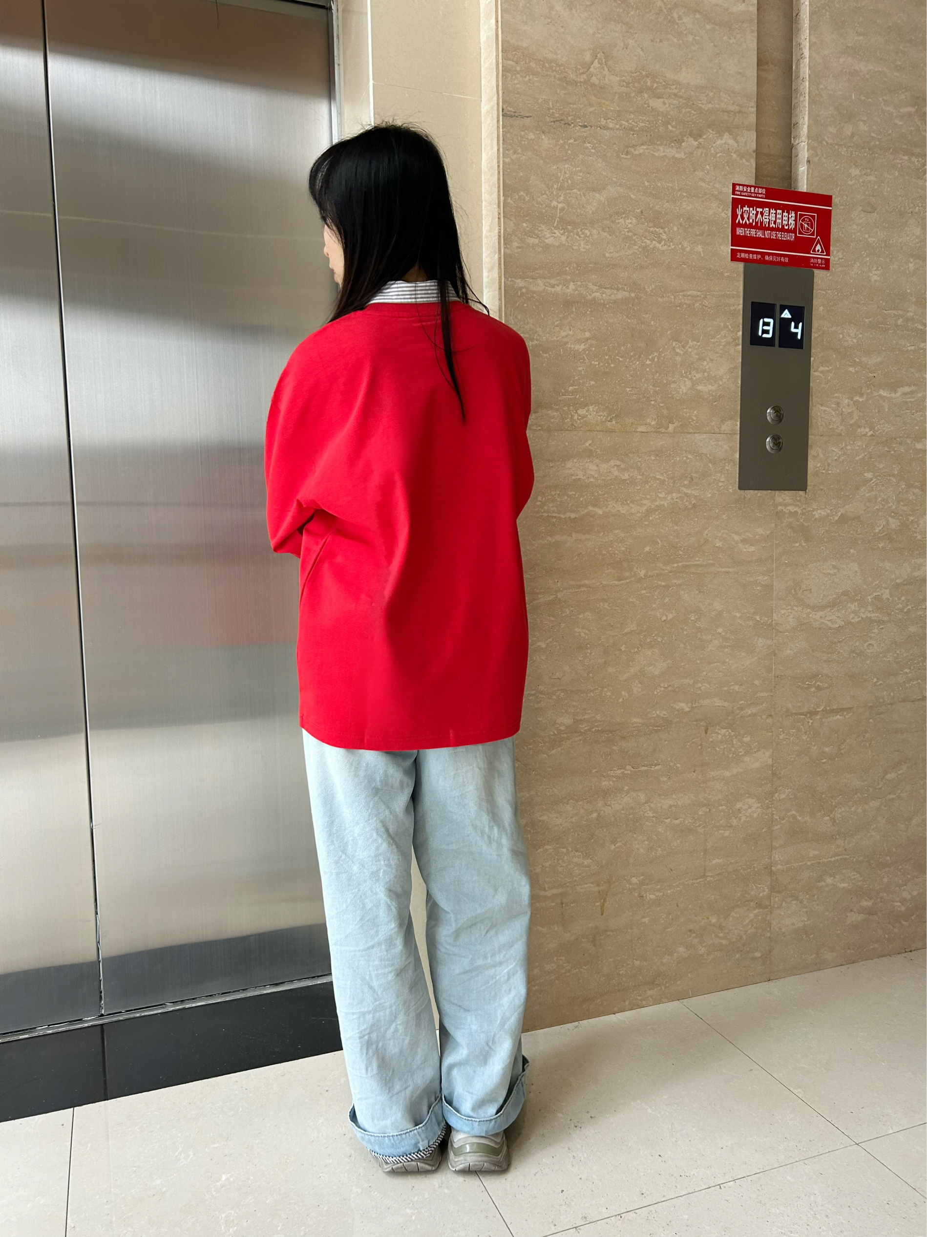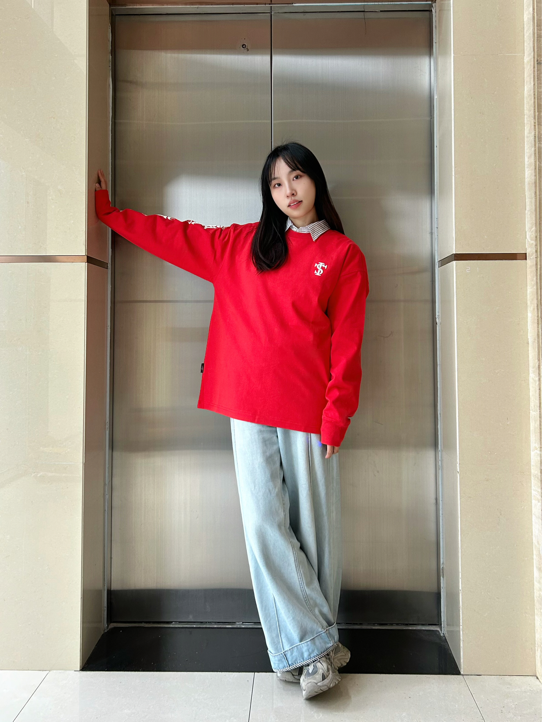 这件STK红色T恤穿上还挺提气色的 胸前的字母刺绣做工细致, 红色正得刚好。 我搭配了浅色水洗牛仔裤和老爹鞋 街头复古感满满。 日常穿一点小俏皮又很舒服 当内搭也好看。