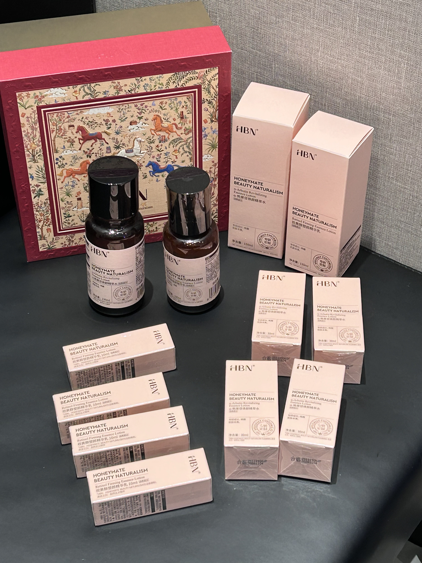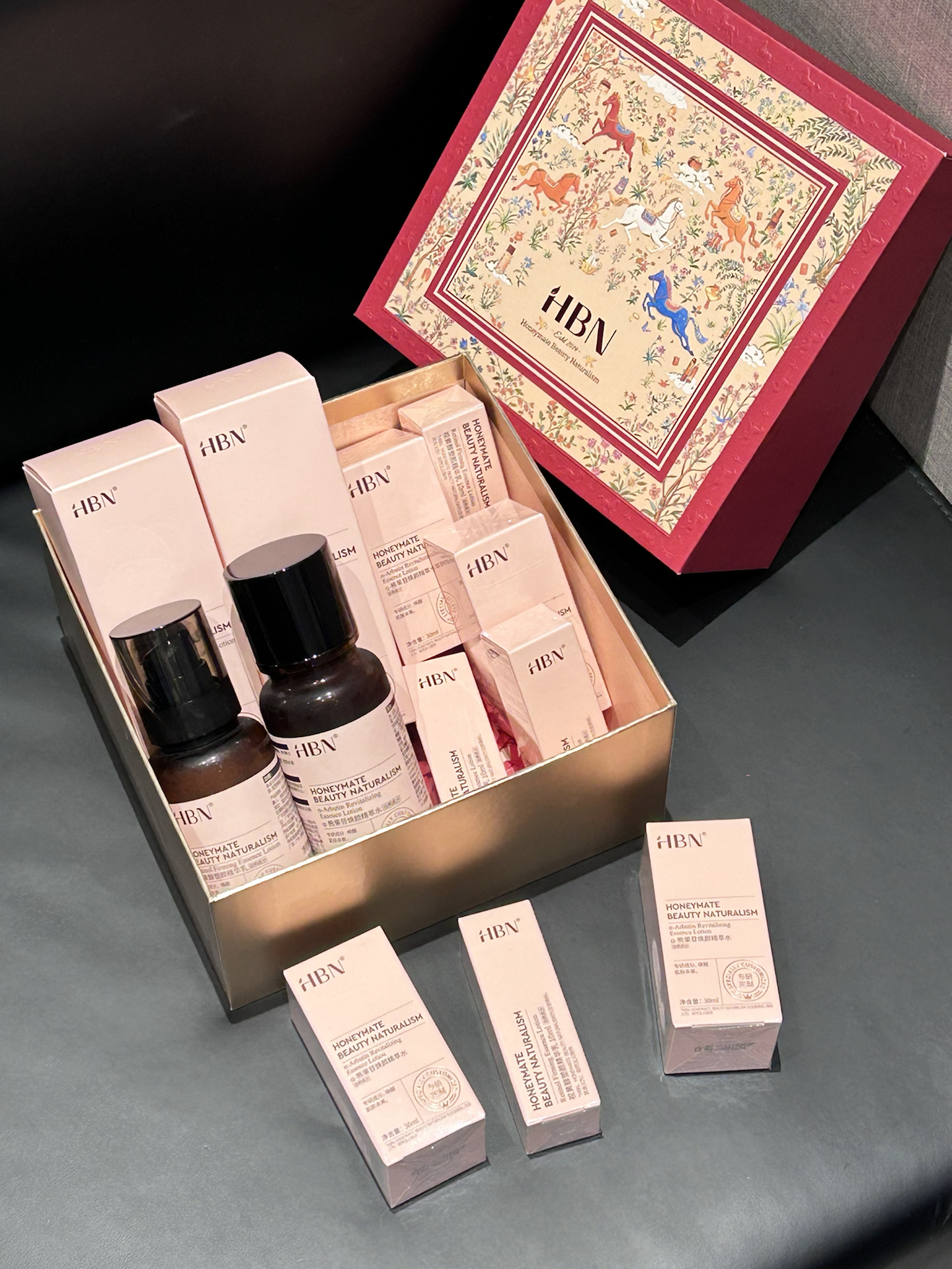 就是HBN的介个新年限定礼盒 新年红+烫金的礼盒 包装上还印有五匹骏马 我觉得好有信念的仪式感啊 里面不仅有水乳还有好多小样 水乳就很适合我这种熬夜党用 试了下发光水的质地清爽 上脸轻轻按压很好吸收 熬夜之后我还会用它来湿敷 精华乳的质地轻盈 保湿力我觉得够的 温和淡纹它真的有两下子 最近一直在坚持使用 皮肤感觉嫩嫩哒 礼盒包装新年拿来送人很有心意耶! #心动礼物局 #新...
