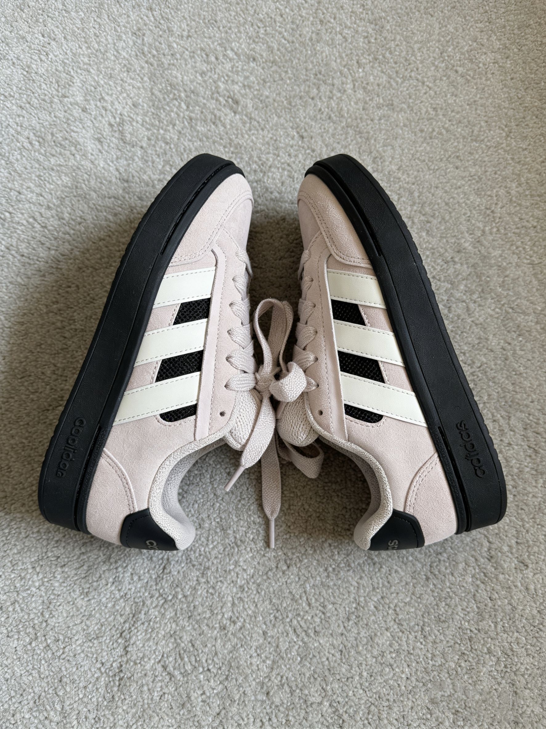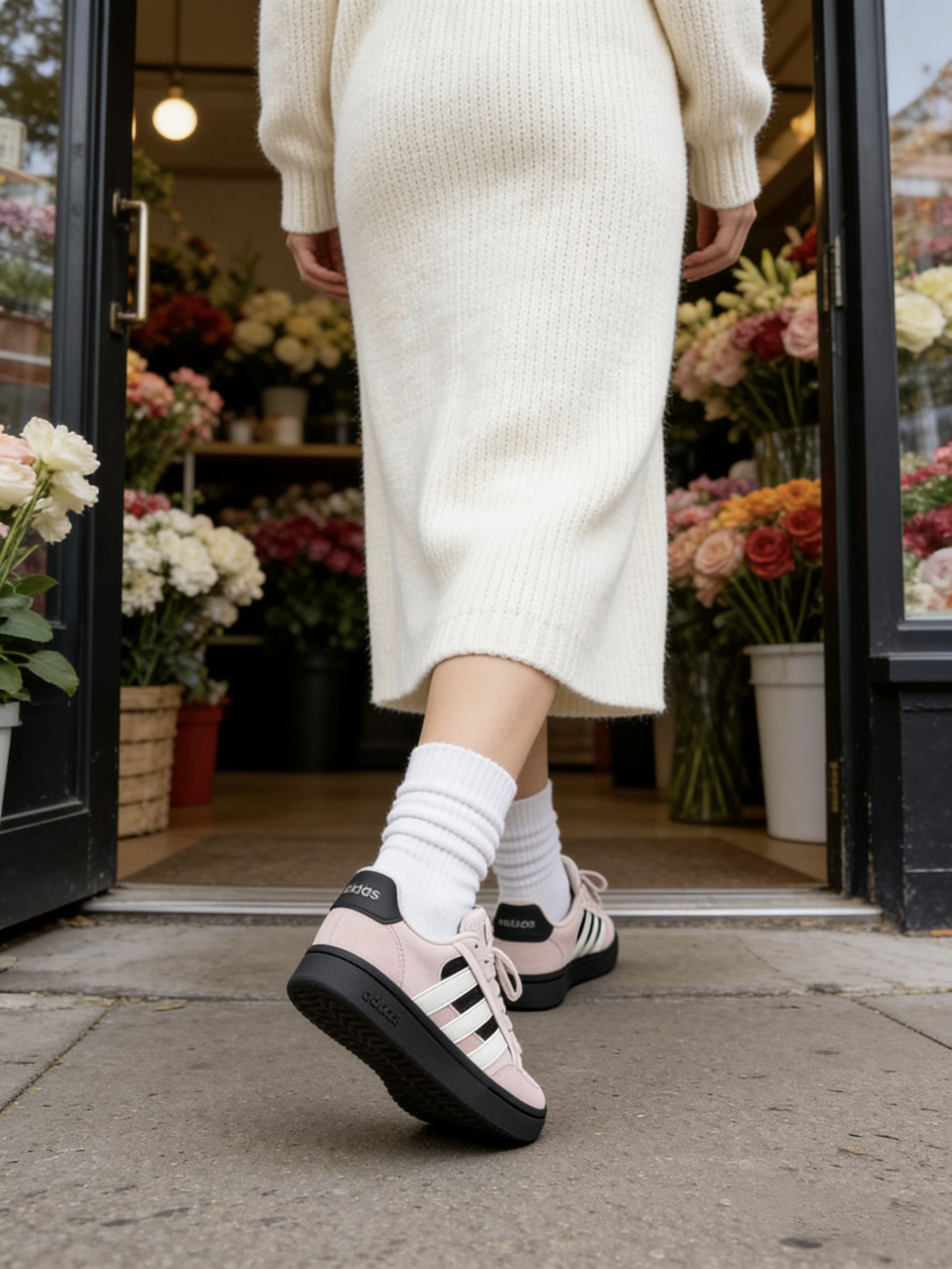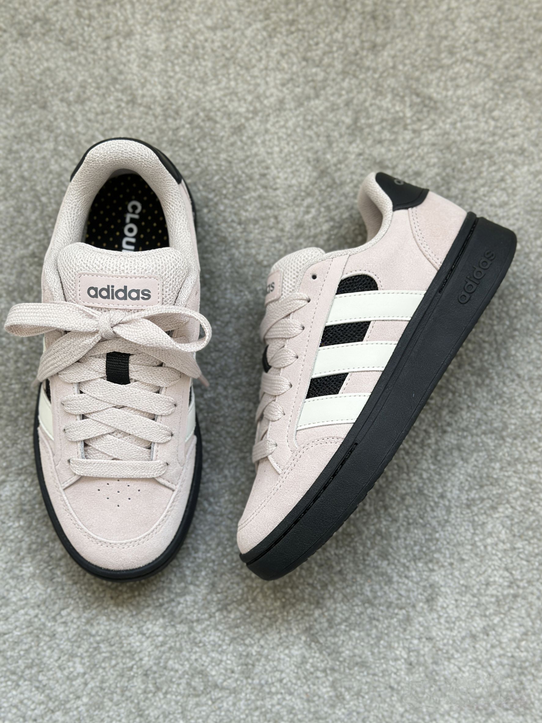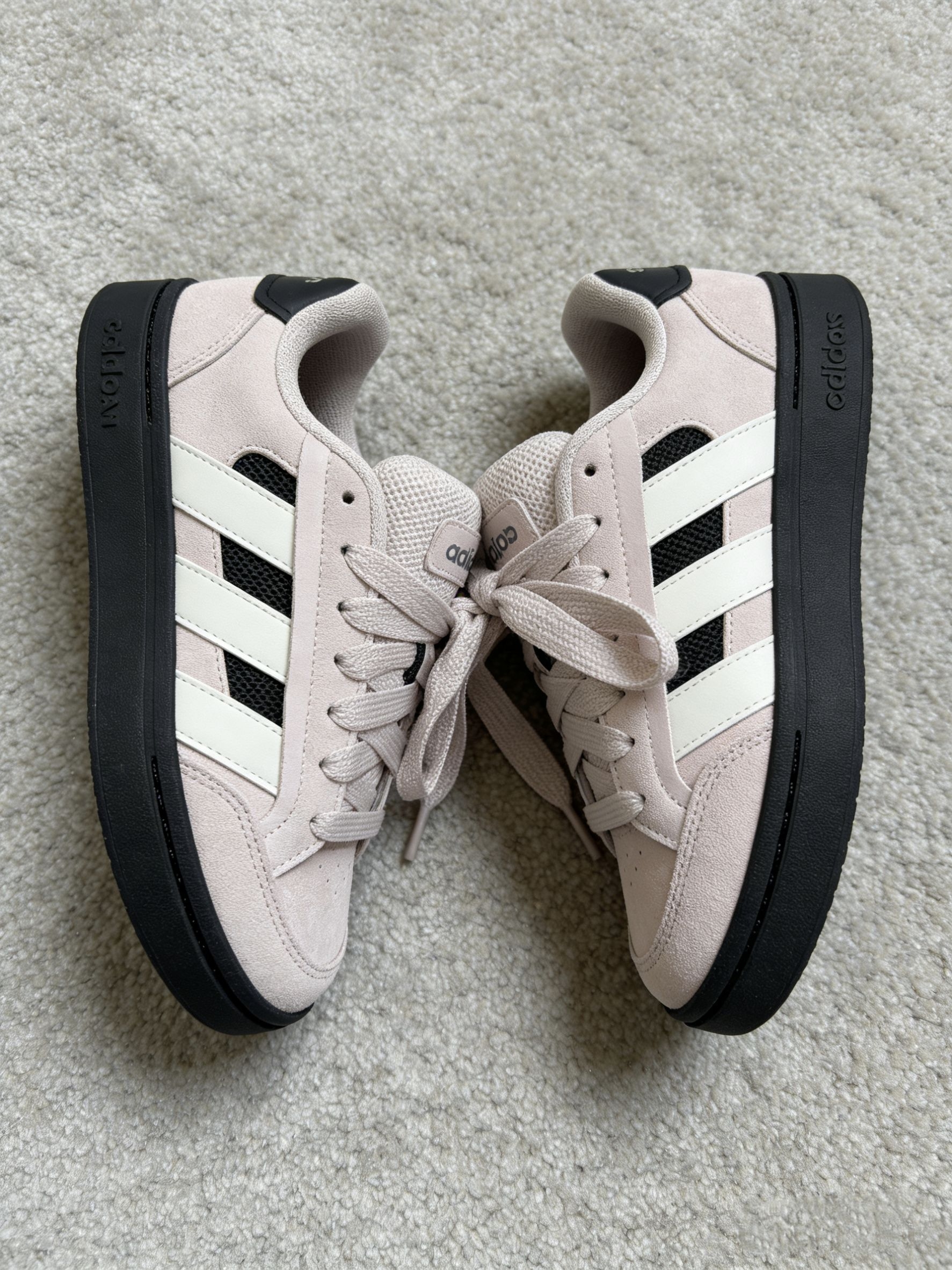 我新入的这双阿迪板鞋也太乖了吧,一眼就被这个紫粉色戳中了,带点灰调的低饱和感,温温柔柔的完全不扎眼,穿在脚上超温柔~ 我摸了摸鞋面是麂皮的,绒绒的巨有手感,宽宽的同色系鞋带我都懒得仔细系,随便绕两下松松散散的,就很有软萌的感觉,鞋身还有点黑白小撞色的细节,悄悄添了点利落劲,我真的超爱这种小设计✨ 我上脚试了好久,鞋底软弹弹的,走起来一点不费劲,逛半天街脚也不觉得累,而且这个鞋型是微微收窄的...