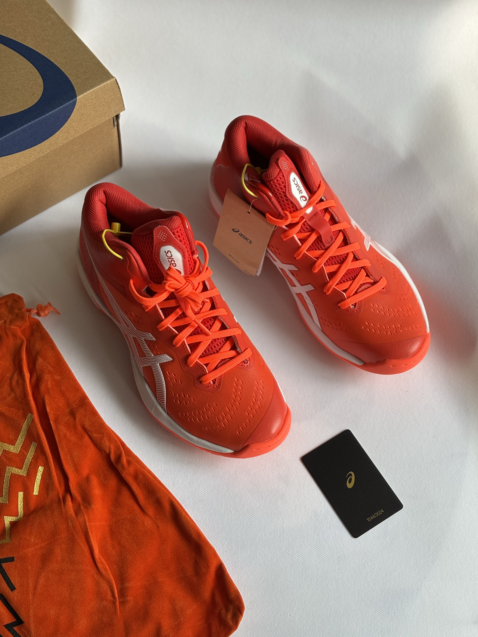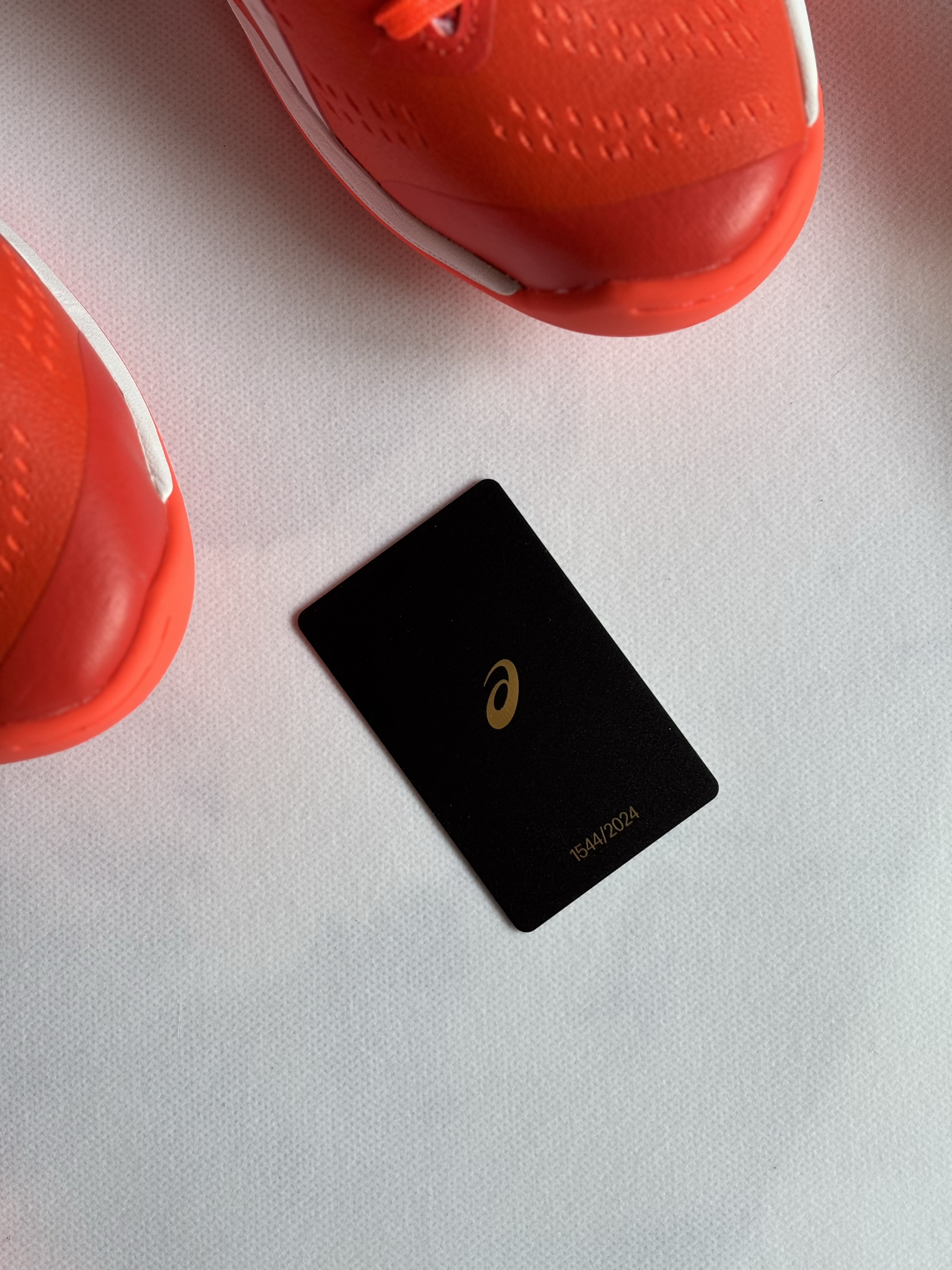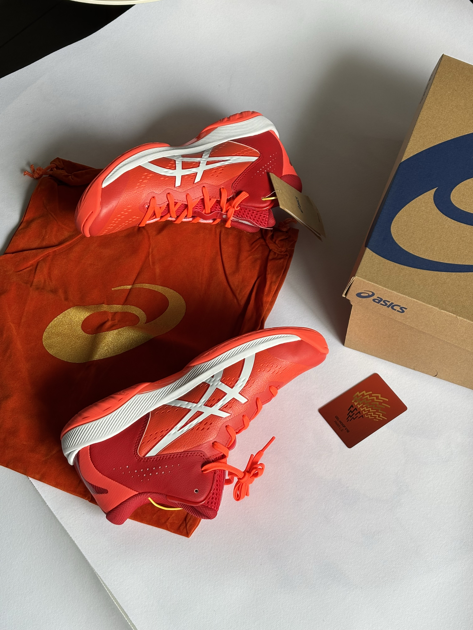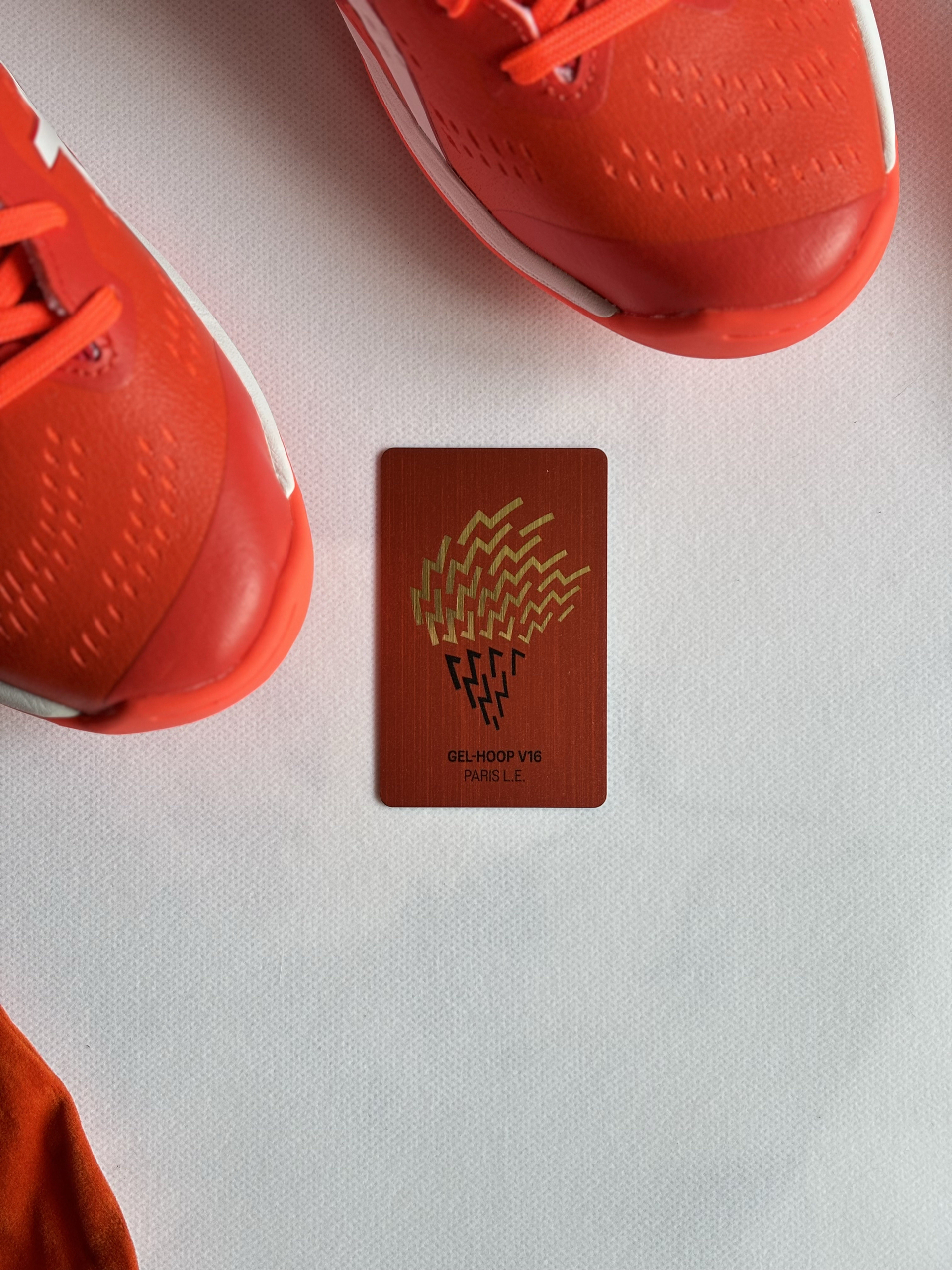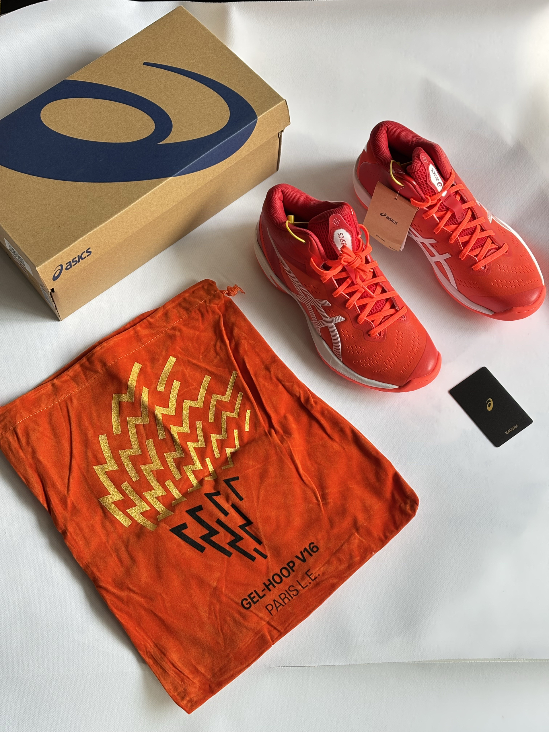 这双鞋是亚瑟士GEL-HOOP V16巴黎限量套装,全球仅2024双,只有橙红配色,也是契合了巴黎时尚大胆的城市风貌。 每双都有专属编号收藏卡,是专为室内篮球打造的中帮实战鞋,也是球鞋圈里“可穿可藏”的热门选择,也是日本国家队的训练指定用鞋之一。