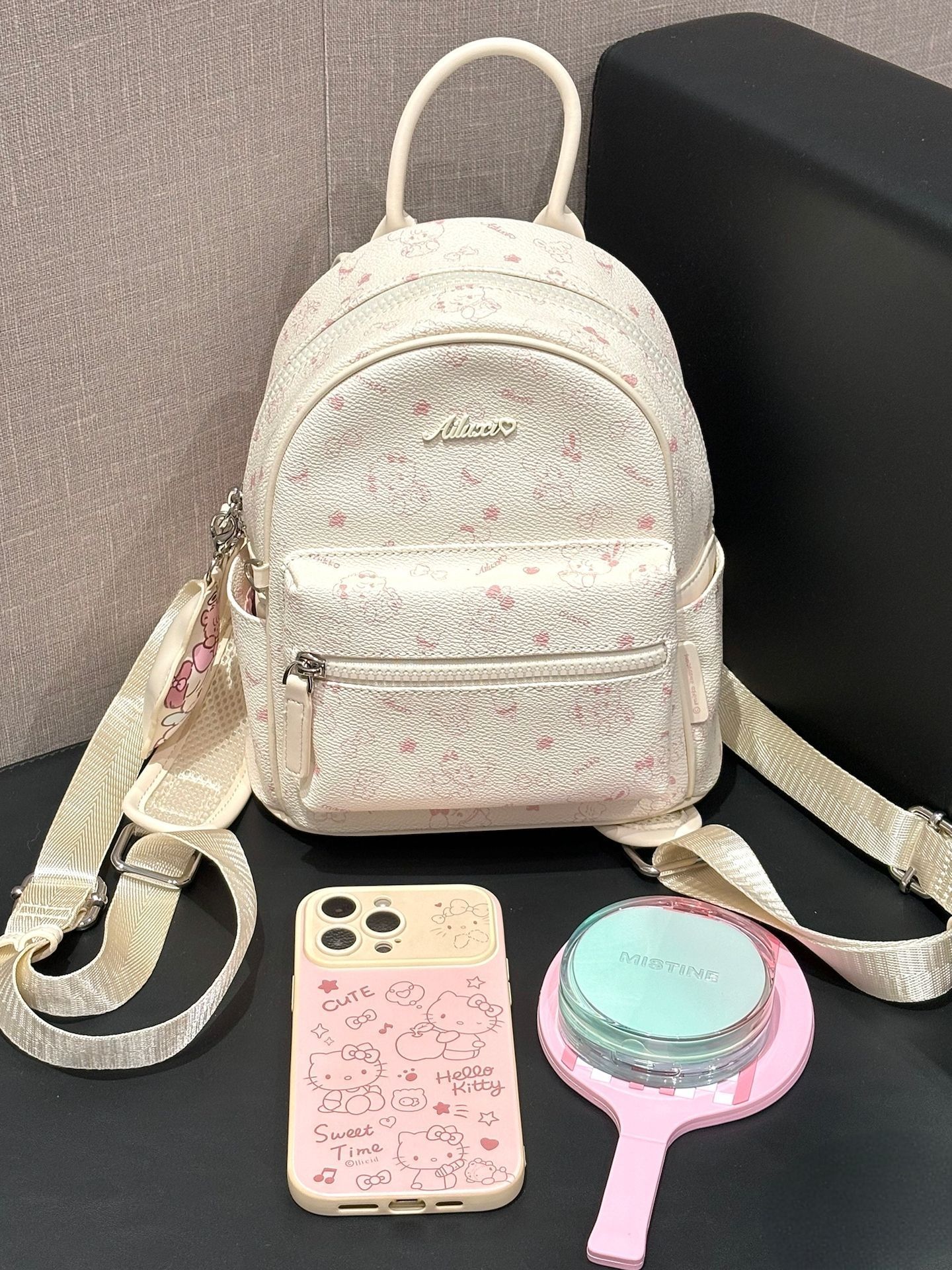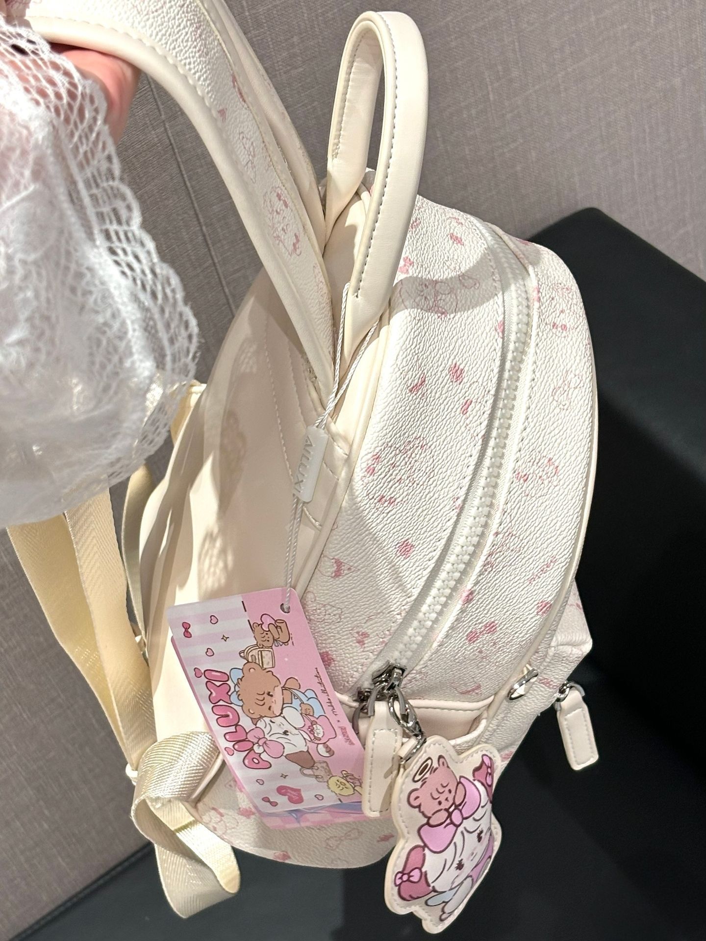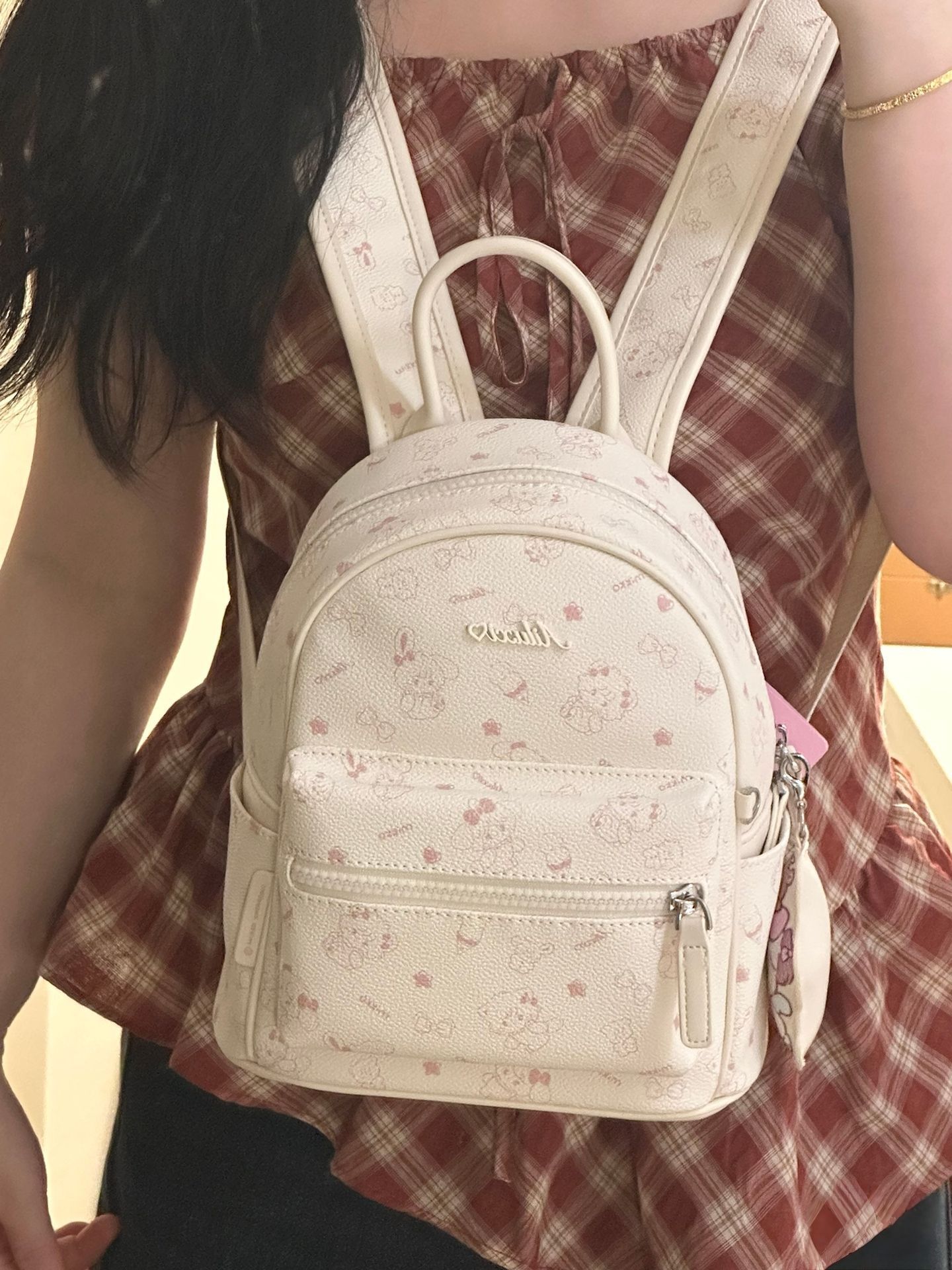 颜值在线:低饱和度的粉白配色不挑人,印花细节精致,背出去不容易撞款,自带温柔氛围感。 轻便百搭:包型小巧但容量够用,日常放手机、钥匙、粉饼等小物完全没问题,既能双肩背也能单肩斜挎,适配不同穿搭场景。 侧边的卡通挂件和粉紫标签是点睛之笔,让整体更有童趣感,喜欢可爱风的女生会特别爱这种小设计。