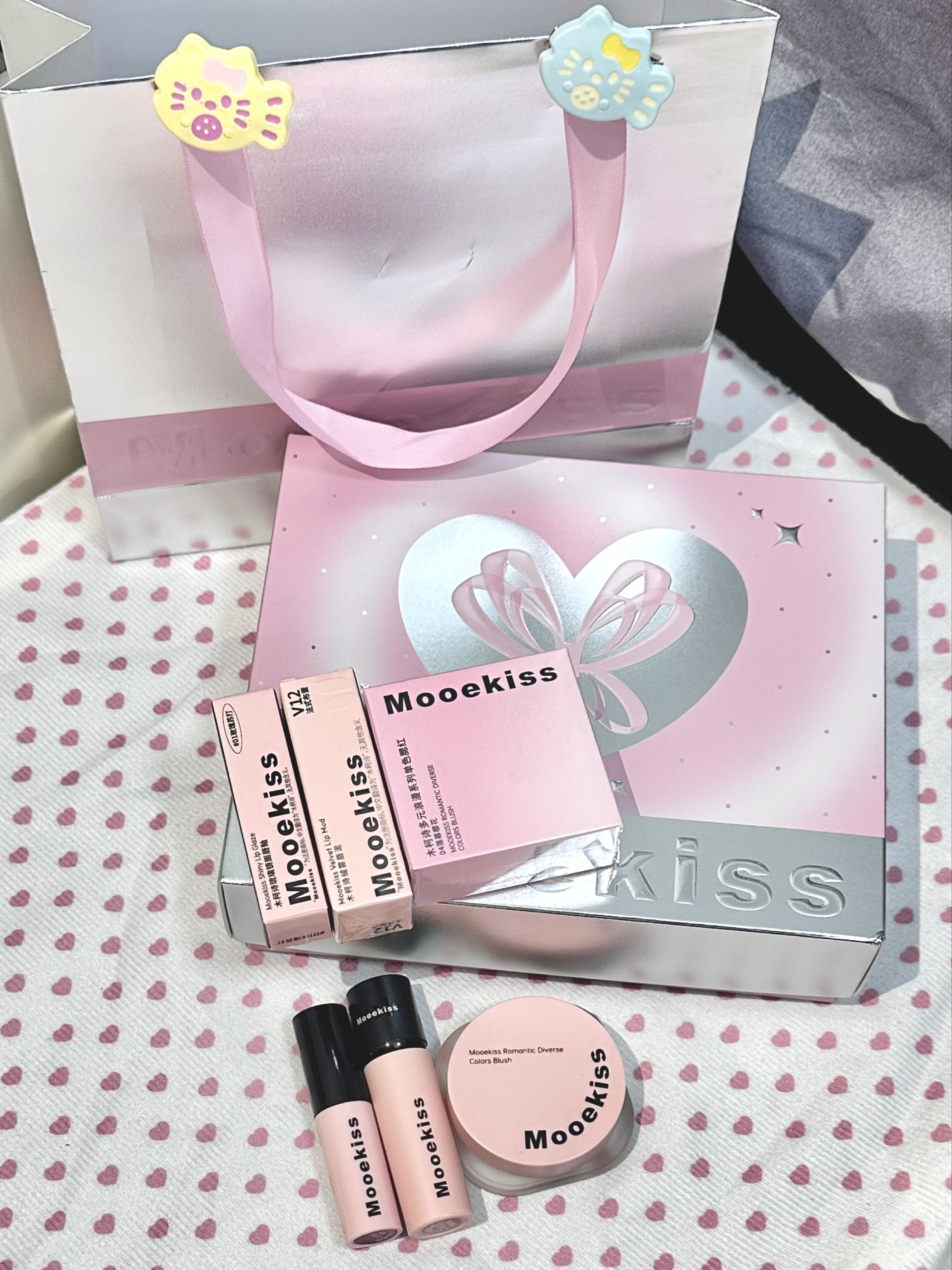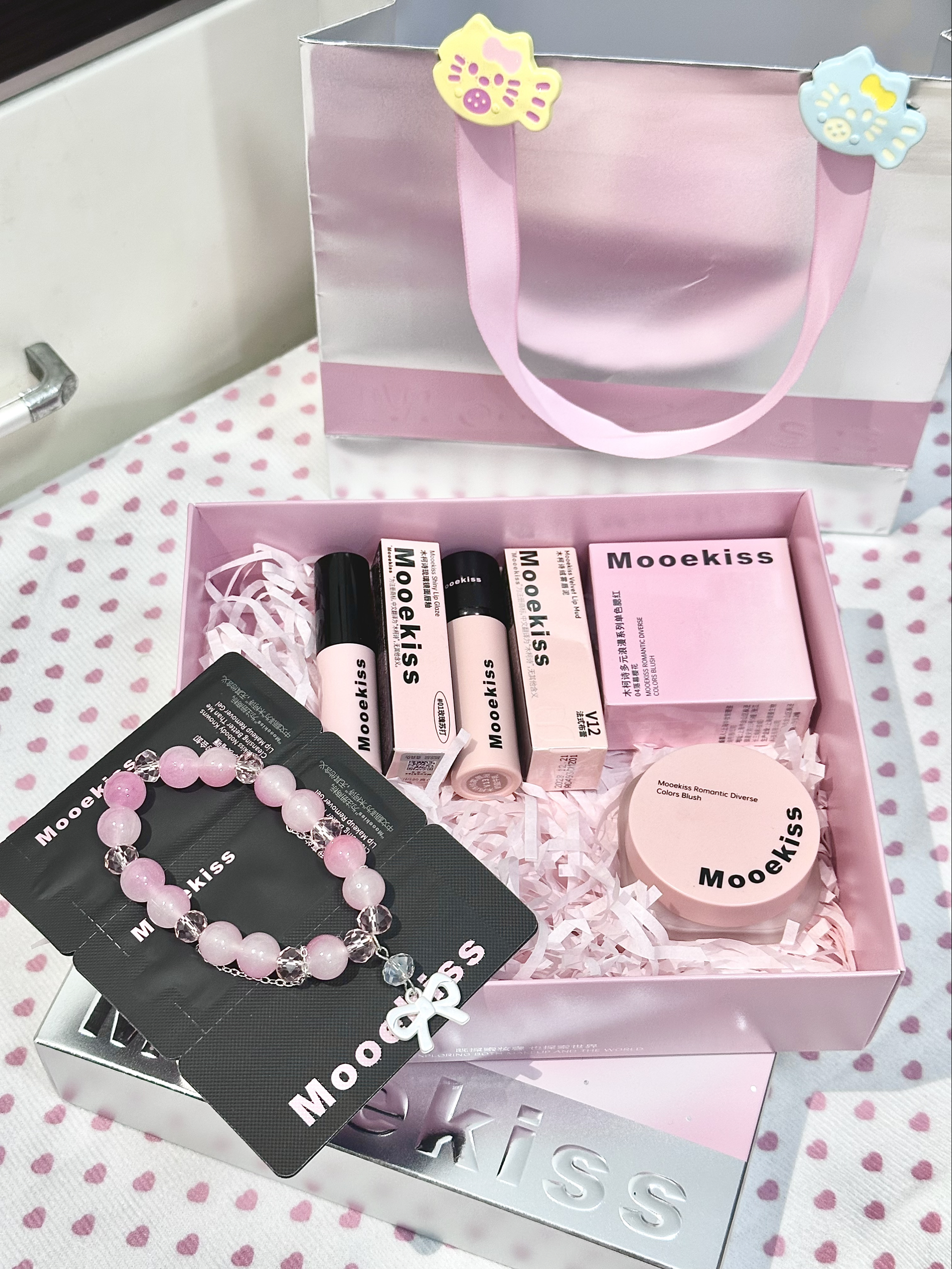 粉嫩的蝴蝶元素包装,尊的像个小公主一样 木柯诗你的副业是漂亮礼盒吧 这一套是他家的甜蜜时刻礼盒A款 里面是两支热门色号的的唇釉 一个雾面哑光一个水光镜面 上嘴都很显嫩,黄皮友好 还有一罐漂亮的樱花粉腮红 低饱和的颜色,上脸重了也不突兀 还给赠送了一串漂亮的蝴蝶手串 粉粉亮亮的的好美呀 平价又实用的一套,我先用上了