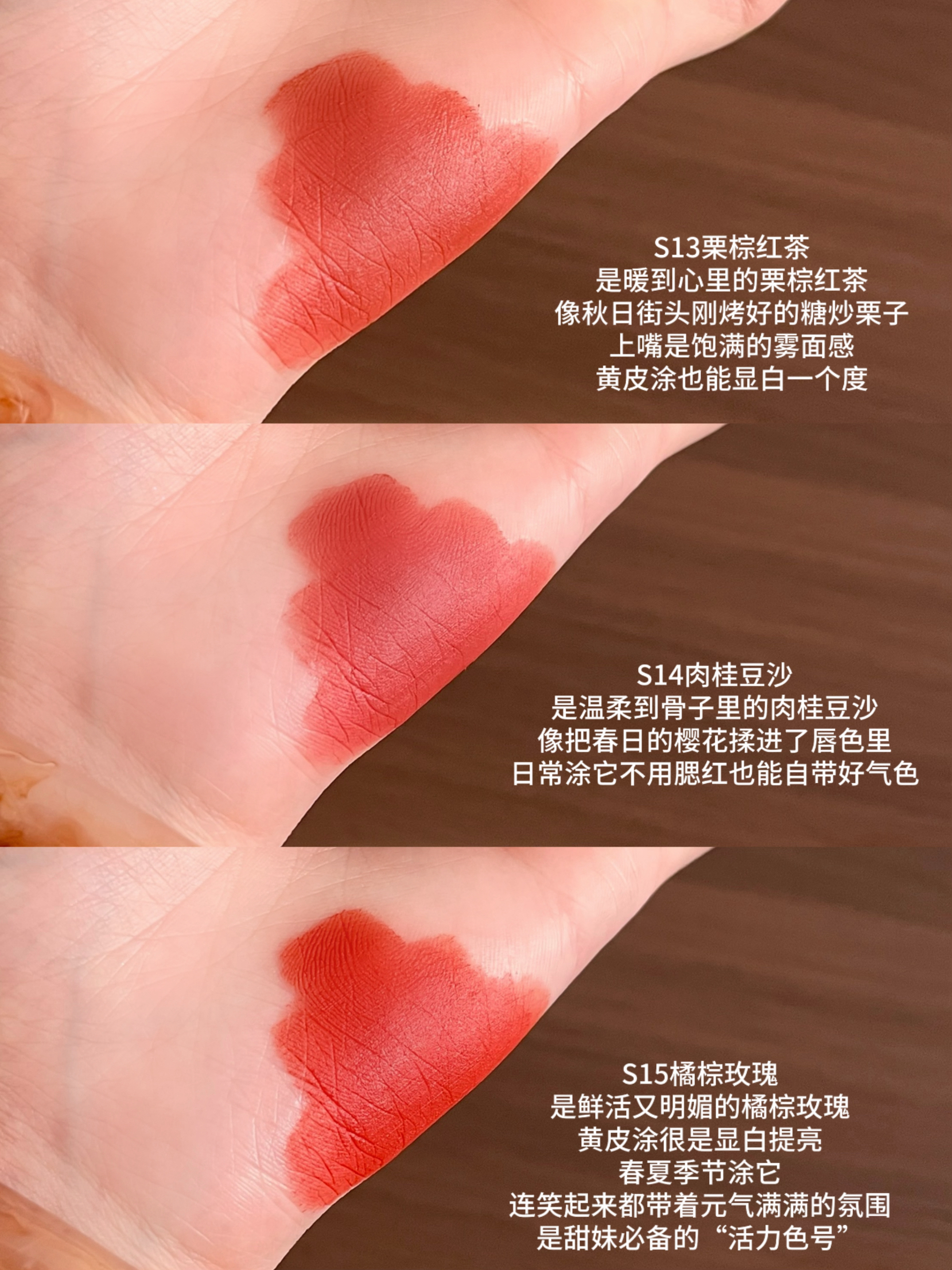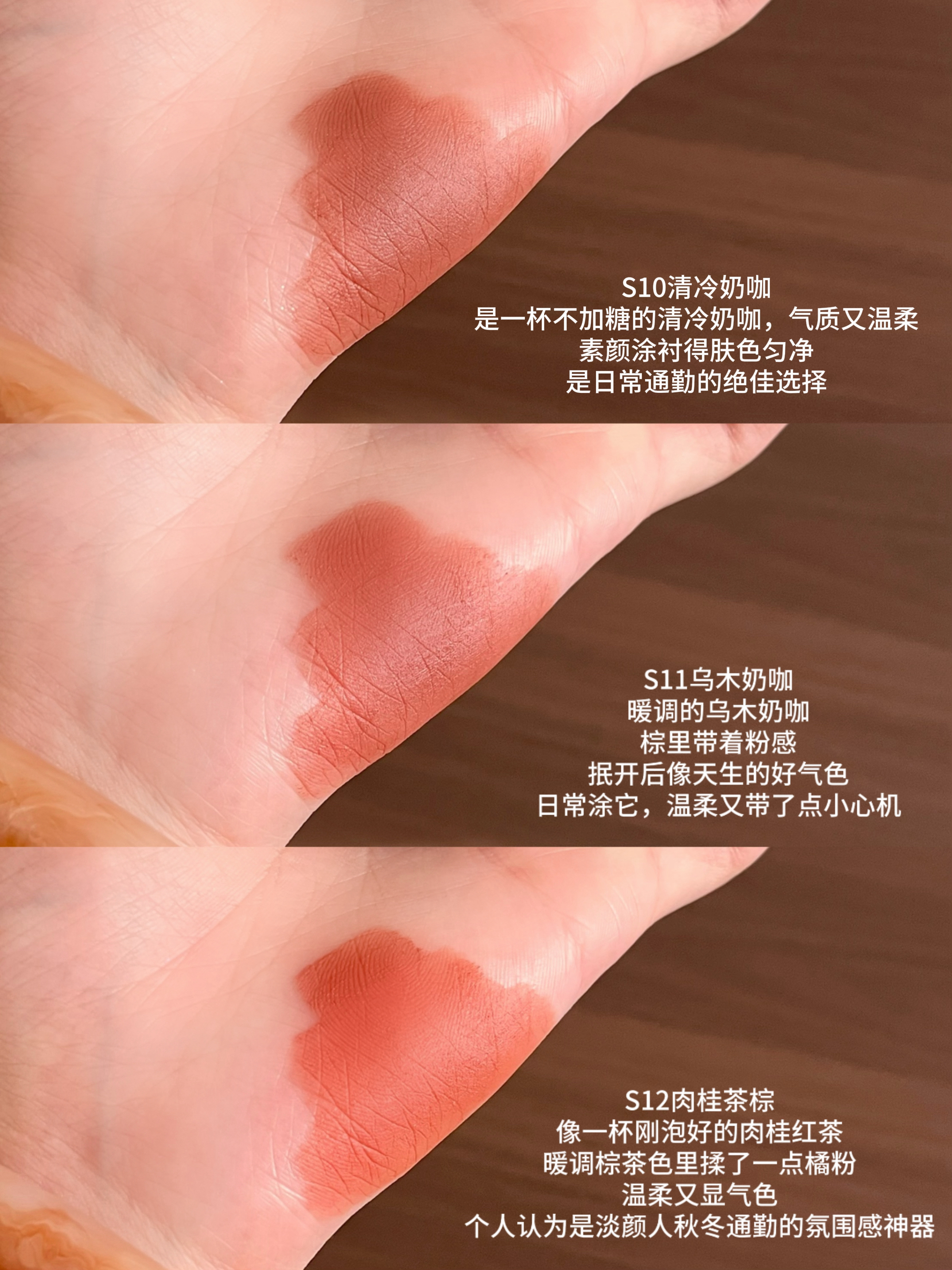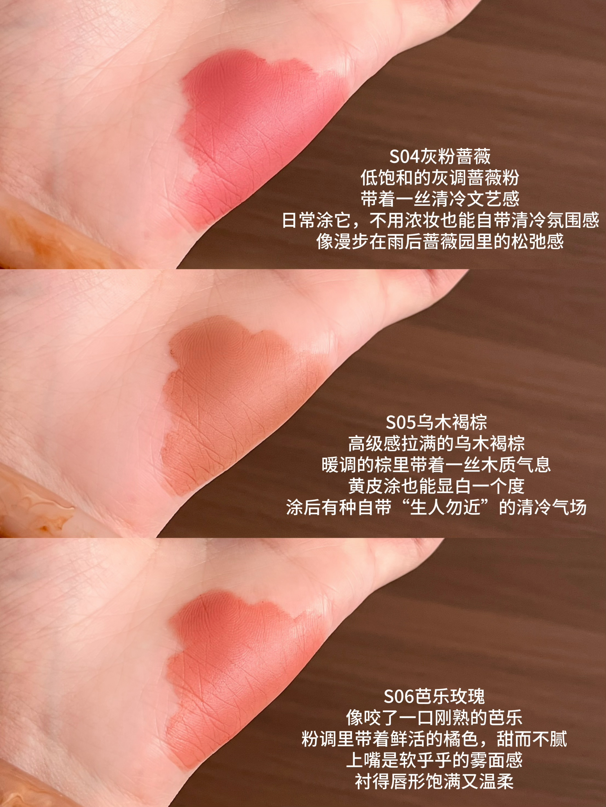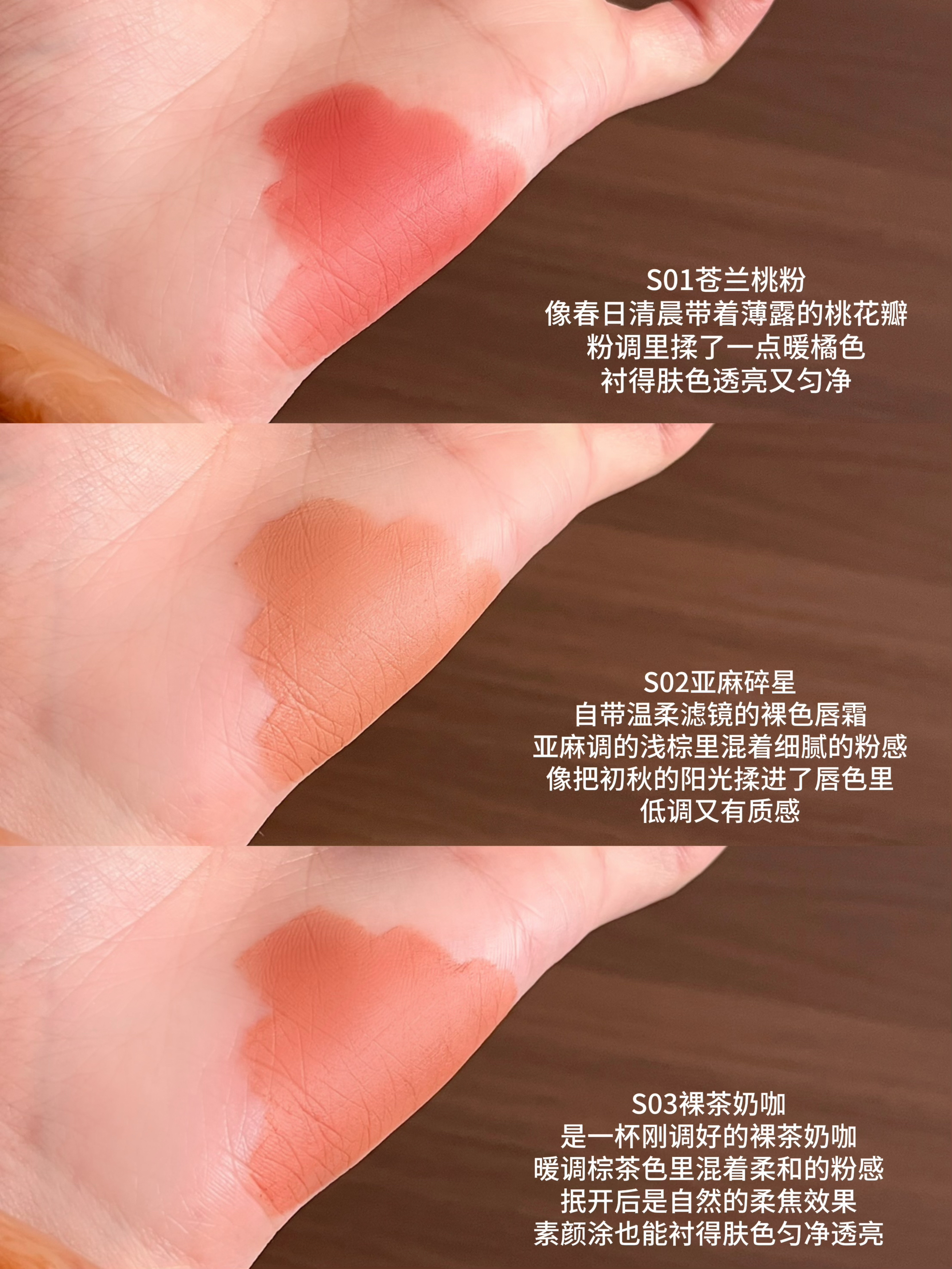 当初被它家详情页上的色号疯狂种草 买回来一试居然毫无色差!! 每个颜色用后更是戳中本人心巴上 抹开是霜转雾柔焦质地,触肤柔软用着很是丝滑 一支即能做唇霜还能当作腮红眼影来用 色调调的很好,每一支都能衬得妆容干净匀亮气色佳 哪怕卸后也不会给嘴唇增添负担 当初中了邪似的all in了所有,今天给大家来一整套试色合集 每一支都是带有不同感觉的漂亮裸 还在观望不知道如何选什么色号的可以看过来 全是自然光试...
