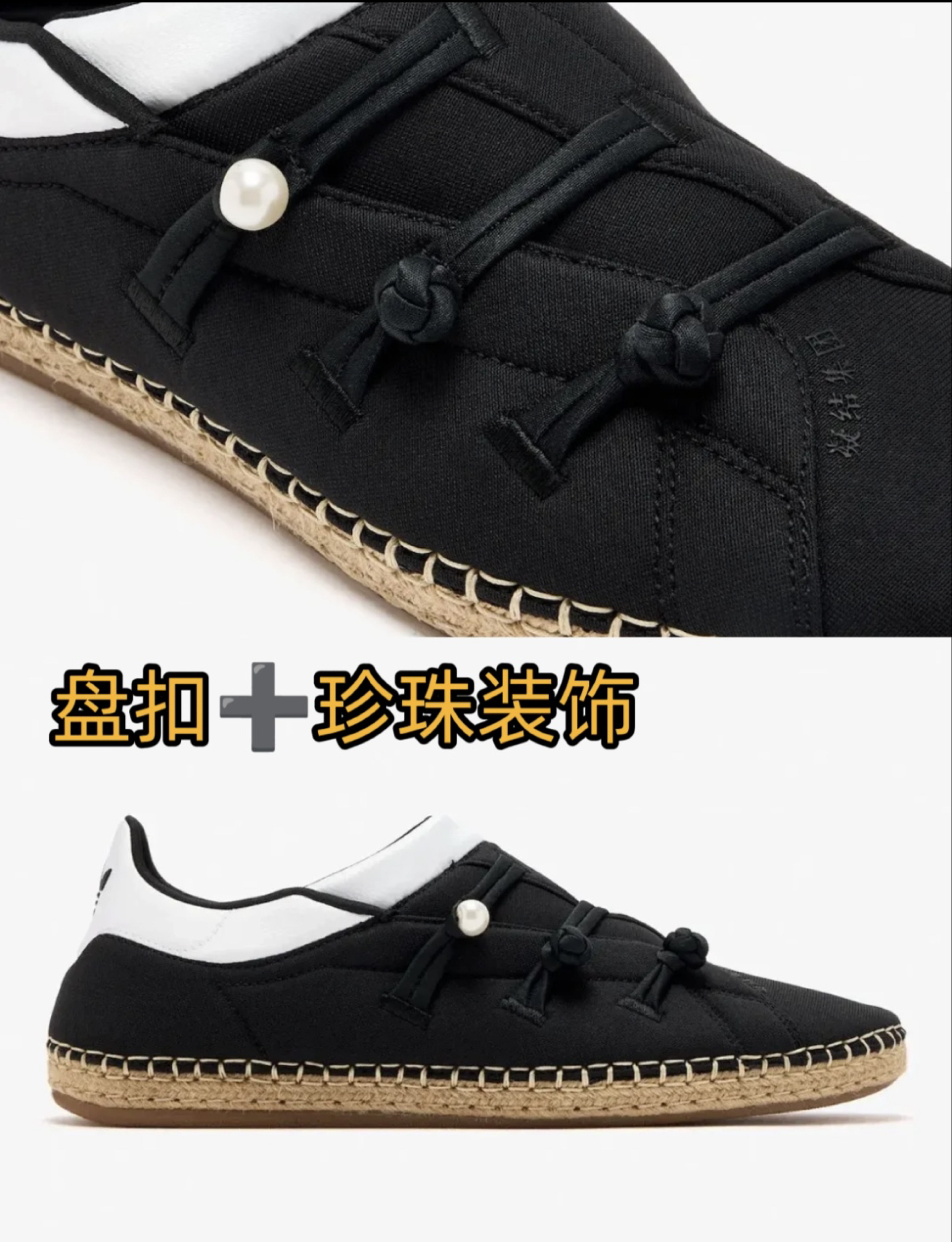 刚刷到这双联名泄露图~😆 冠希哥的CLOT和adidas新联名Qi Flow,果然又回到了他超爱的“老北京布鞋”命题,熟悉的配方但味道完全不一样! 不过这次的质感真的很戳人~整体鞋型看着特别松弛柔软,我一眼就盯紧了侧边!没想到居然用汉服同款盘扣做闭合,旁边还缀了颗小巧的珍珠✨ 单这个小细节,就把东方的精致与闲适感拉满了,可不是单纯模仿外形那么简单~ 鞋面是简约的黑色调,搭配带有复古粗糙感的草...