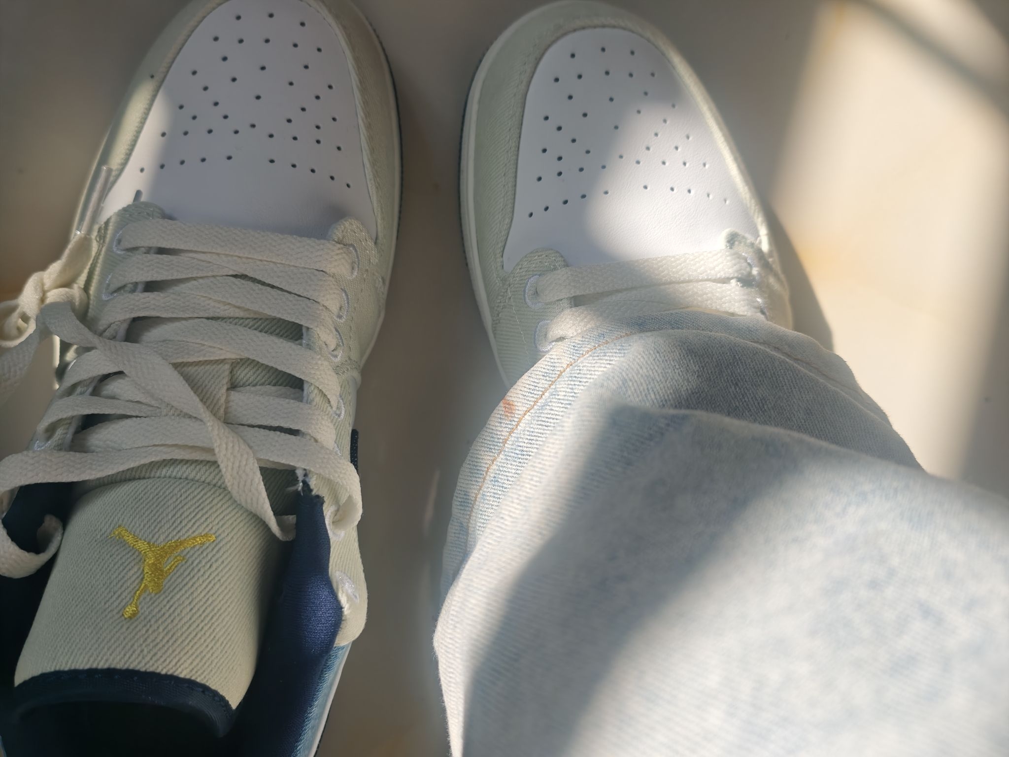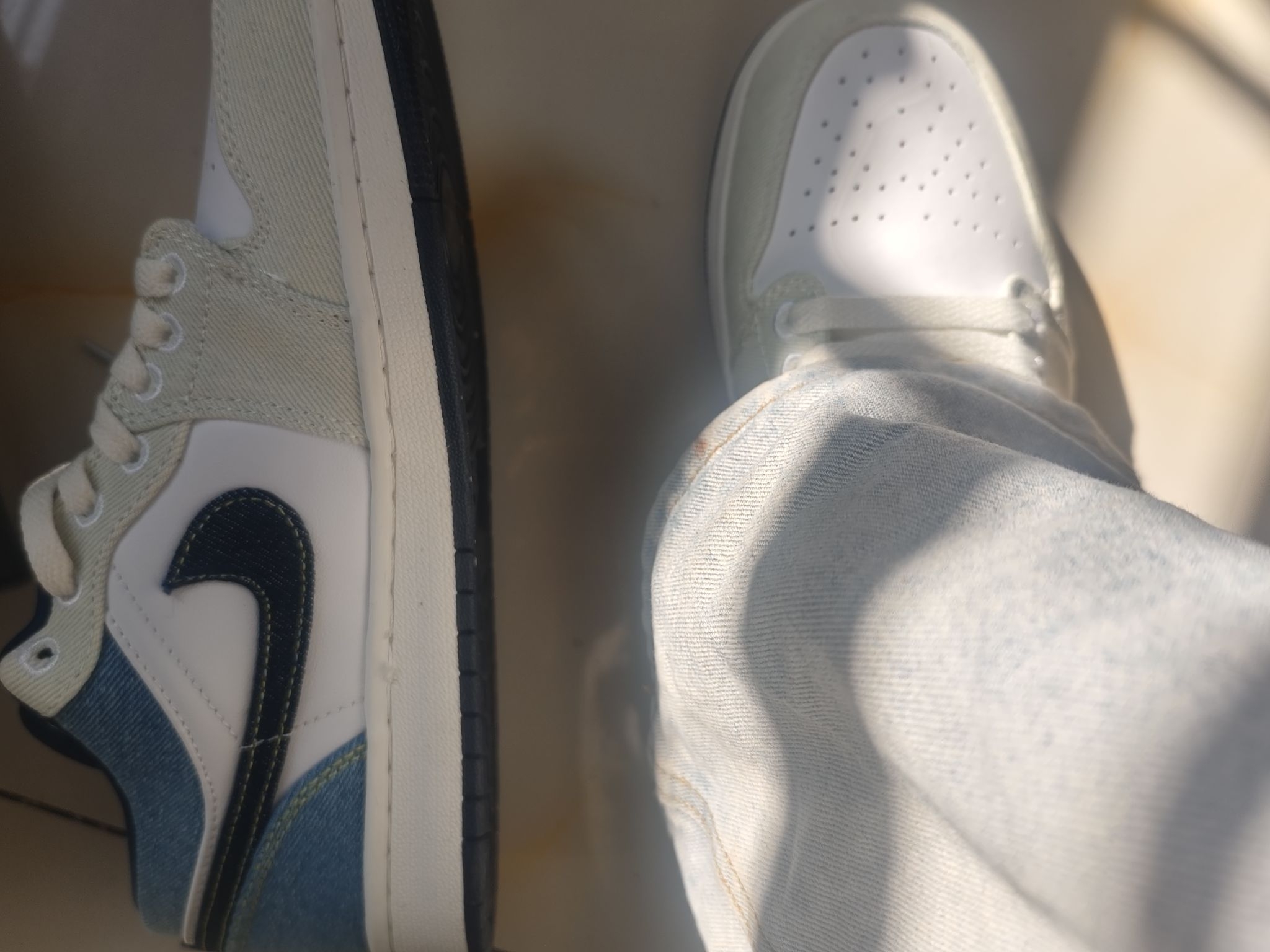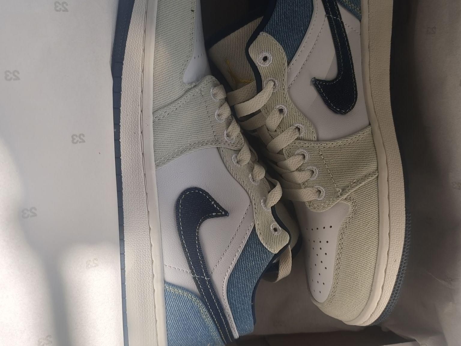 兄弟们,刚拆箱的热乎图来了!从得物收到这双AJ1 Low“牛仔奶白”时,我连包装都没舍得扔——鞋盒+阳光+牛仔蓝,这氛围感直接拉满! 📦开箱第一秒:这鞋在发光! (左滑看开箱实拍!) 打开鞋盒那刻我惊了:奶白皮革+渐变牛仔布,在阳光下像刚从棉花糖机里捞出来的!浅蓝牛仔布带点做旧的毛边,深牛仔蓝的Swoosh标用黄线车缝,像牛仔裤上的补丁,复古到骨子里。连鞋盒里的雪梨纸都印着“23”,细节控直...