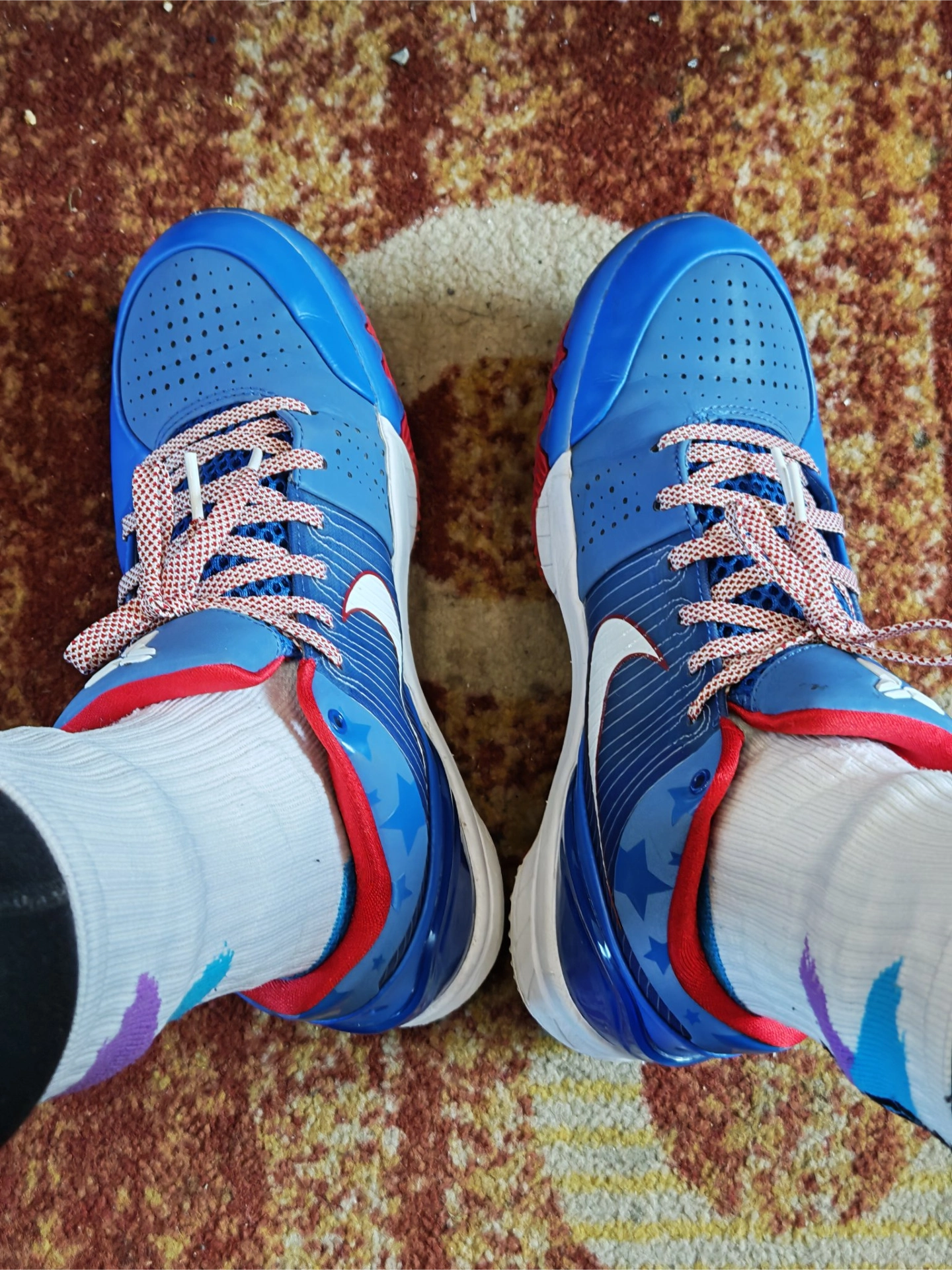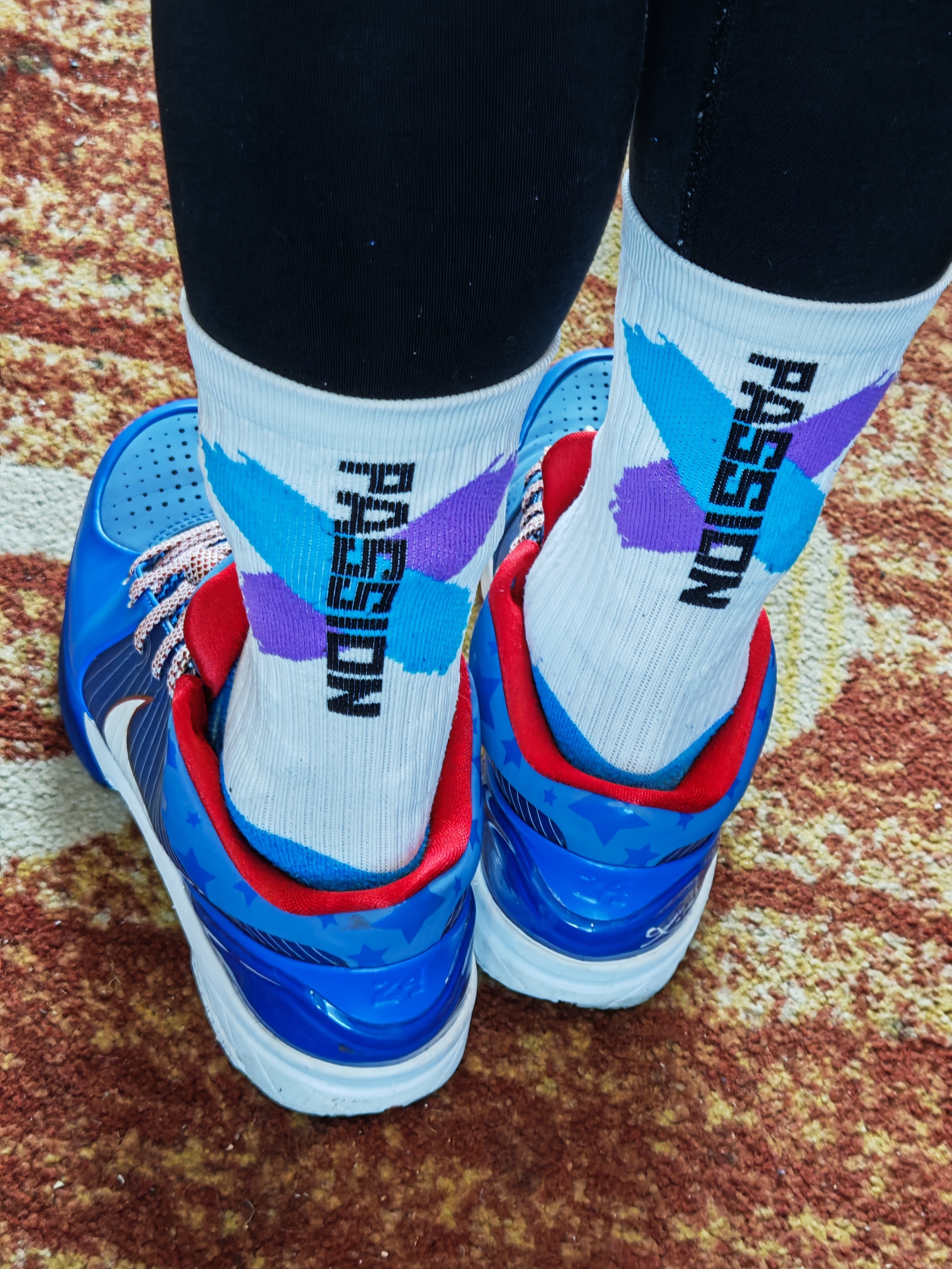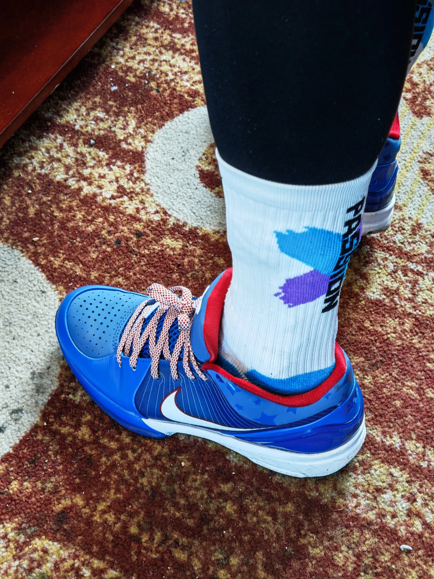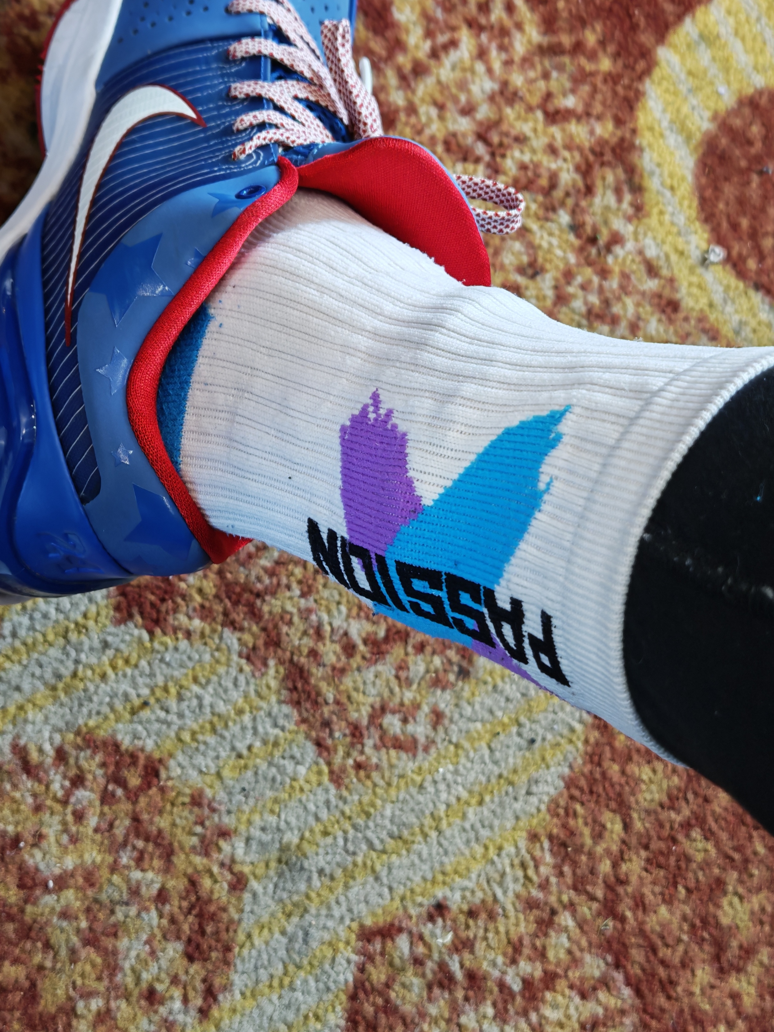 今天的#鞋袜搭配计划 ,袜子的主色湖蓝、浅紫,和科比4费城的鞋身蓝、内衬红紫调完美同色系,没有一点违和感,不是硬凑色,是鞋袜同色同源,视觉上连成一体,远看近看都像“原配套装”,完全没有穿搭割裂感,比纯白袜、乱配色高级太多。 #球袜搭配篮球鞋 #球鞋不够袜子来凑 #维动篮球袜 #颜值超高的篮球袜鞋