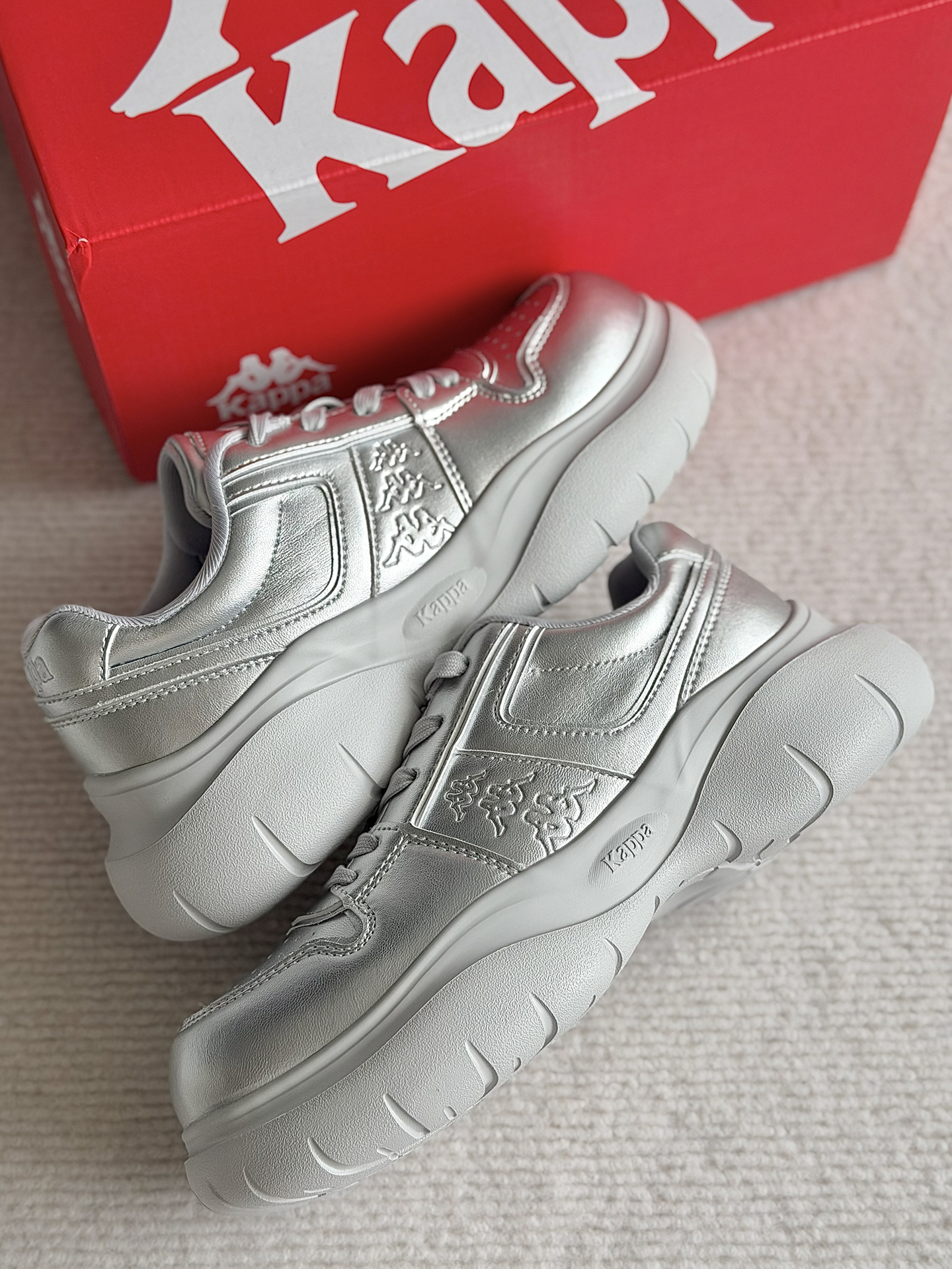 Kappa的这双厚底面包鞋 液态银的配色超吸睛的! 厚底的设计 穿上它能悄悄增高还不累脚 搭配牛仔裤或者裙子我觉得好好看的 通勤逛街穿一整天都很舒适 #kappa #背靠背 #Kappa情人结 #送对礼物好事成双 #马年限定穿这双