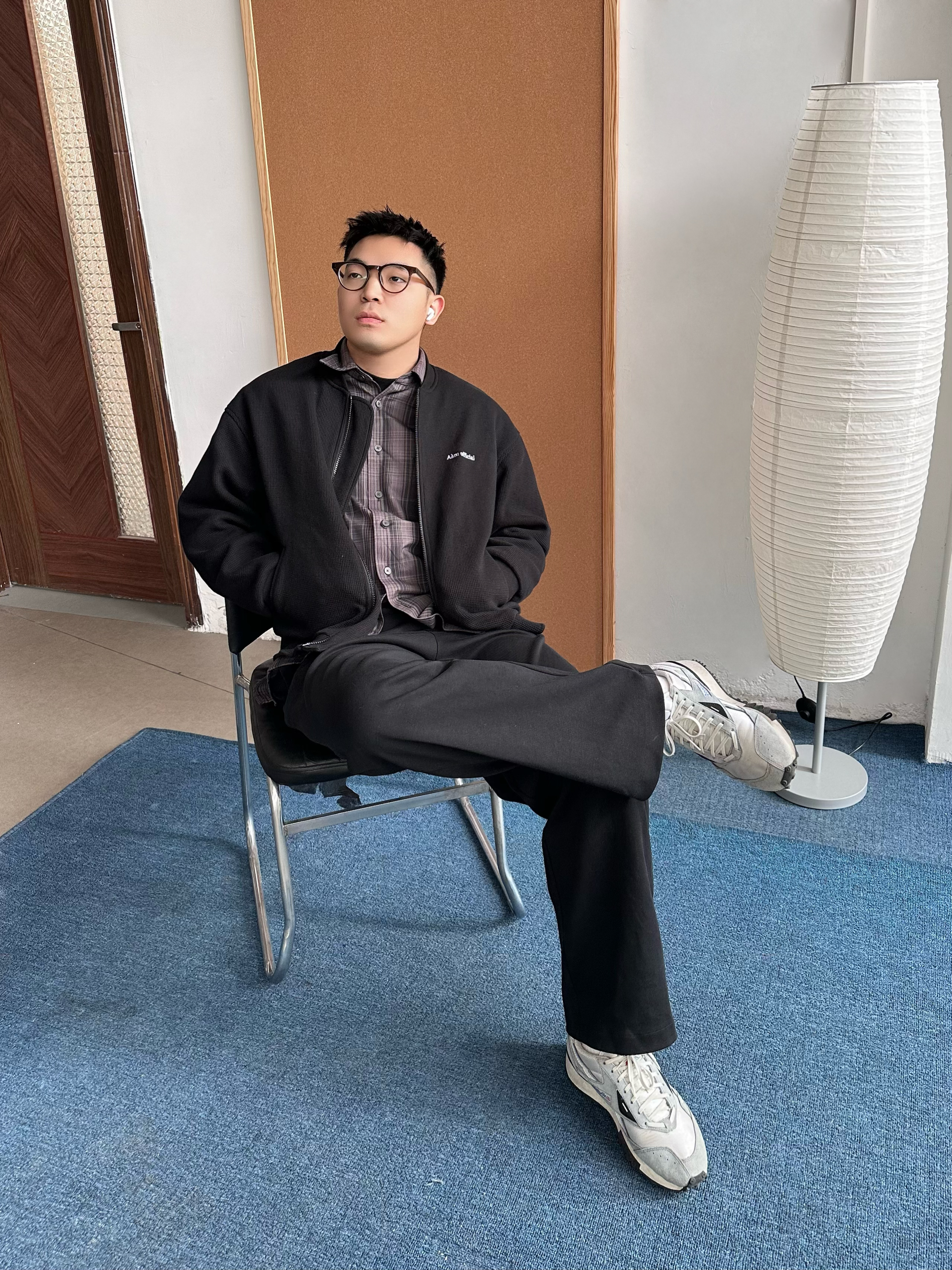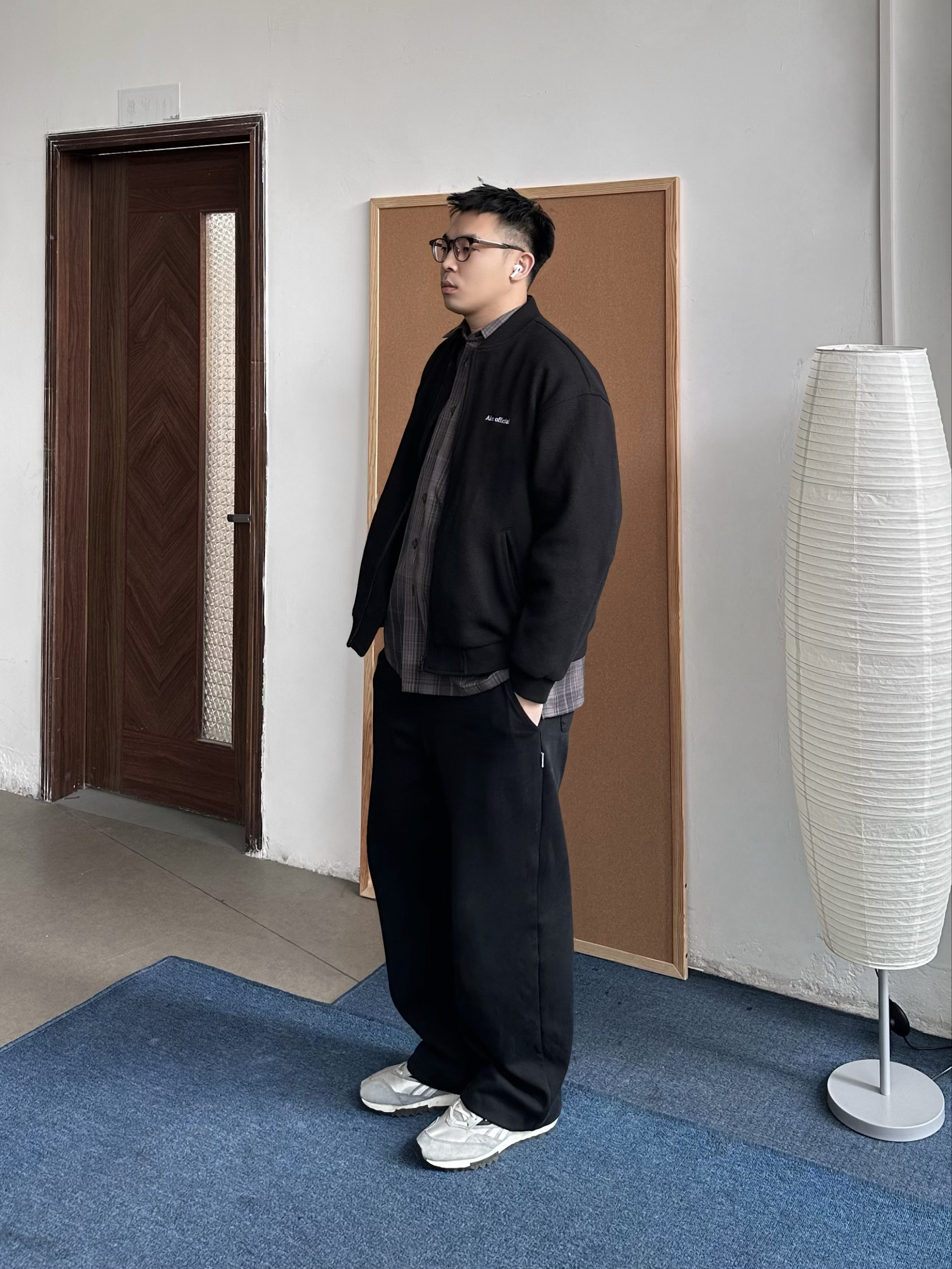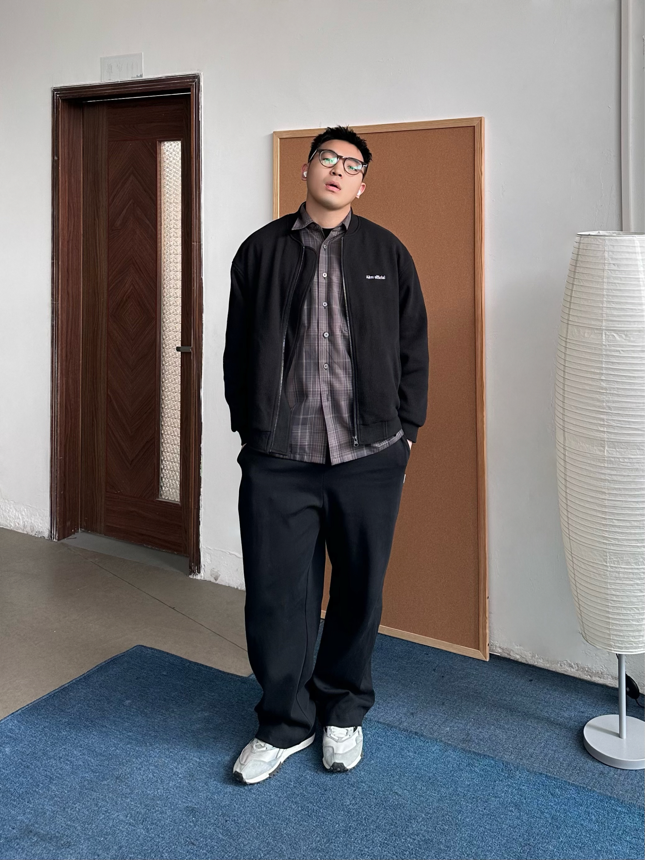 👔 内搭:深紫色衬衫其实很加分,藏在黑色里若隐若现,不会太张扬,细看也有层次。 🧥 外搭:选择黑色华夫格外套,在于质感在线,比普通黑外套更有纹理。 👖 下装:黑色卫裤走一个舒服路线,整体偏休闲,懒人穿也没压力。 👟 鞋子:浅蓝色慢跑鞋就是点睛,新年穿新鞋刚好提亮,全身黑也不会闷。