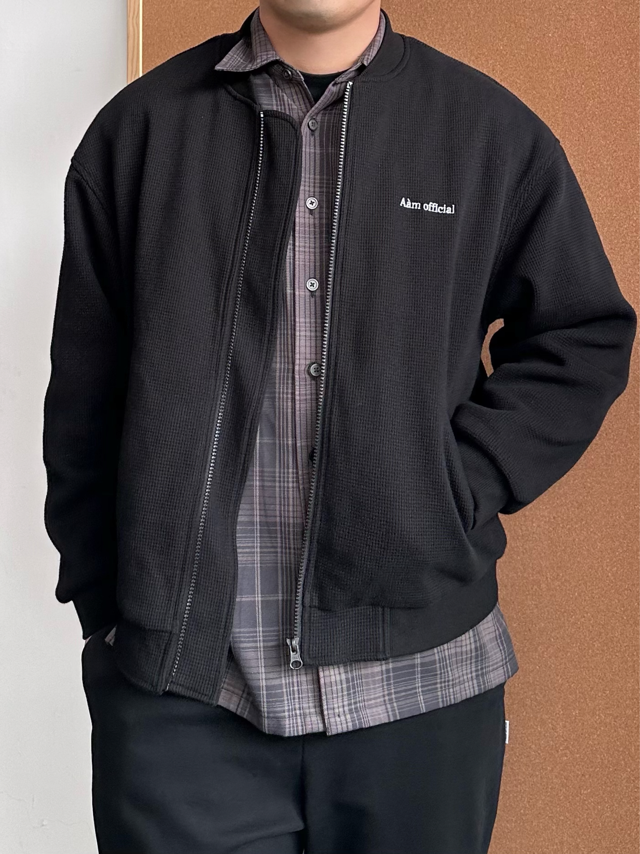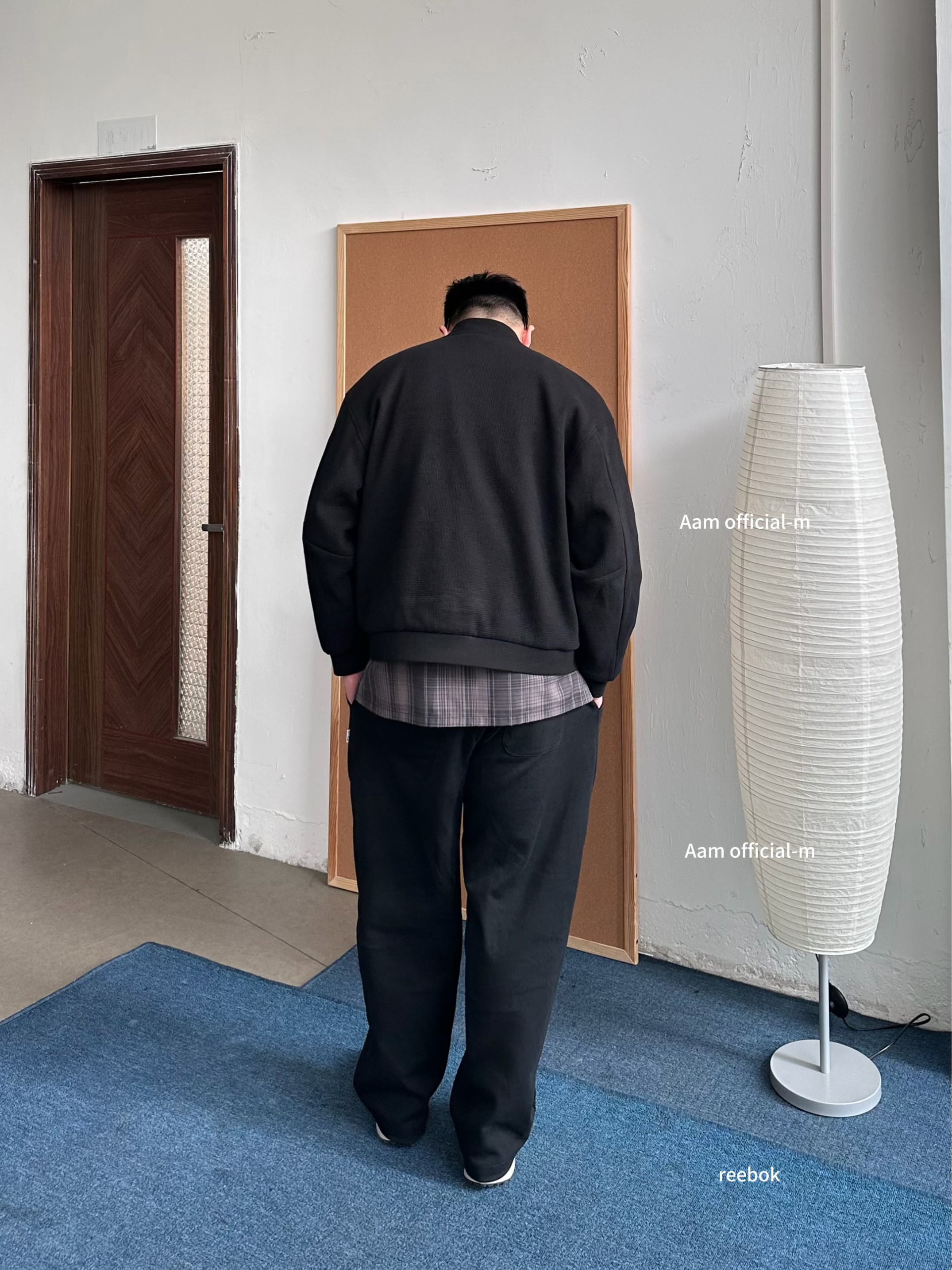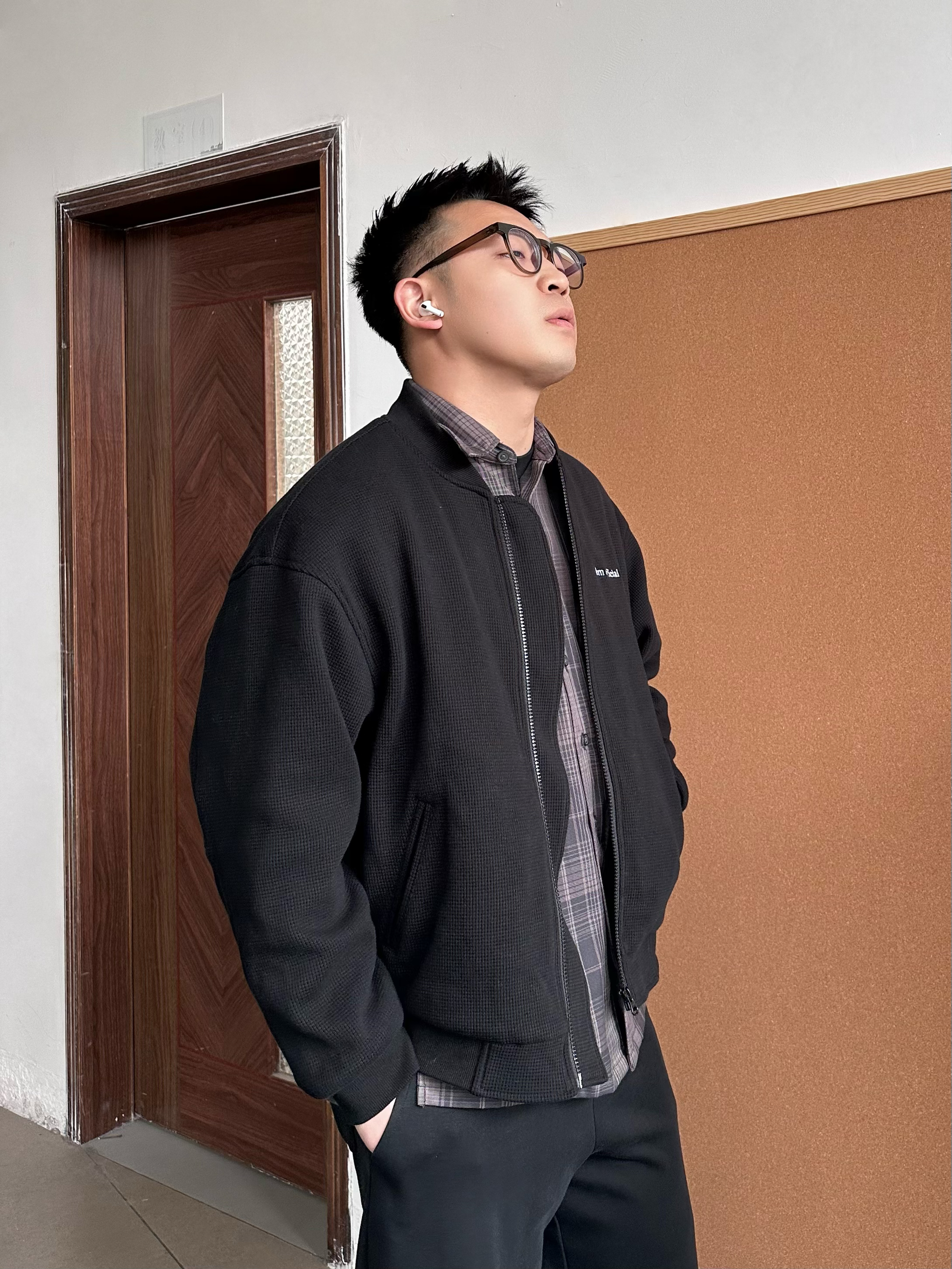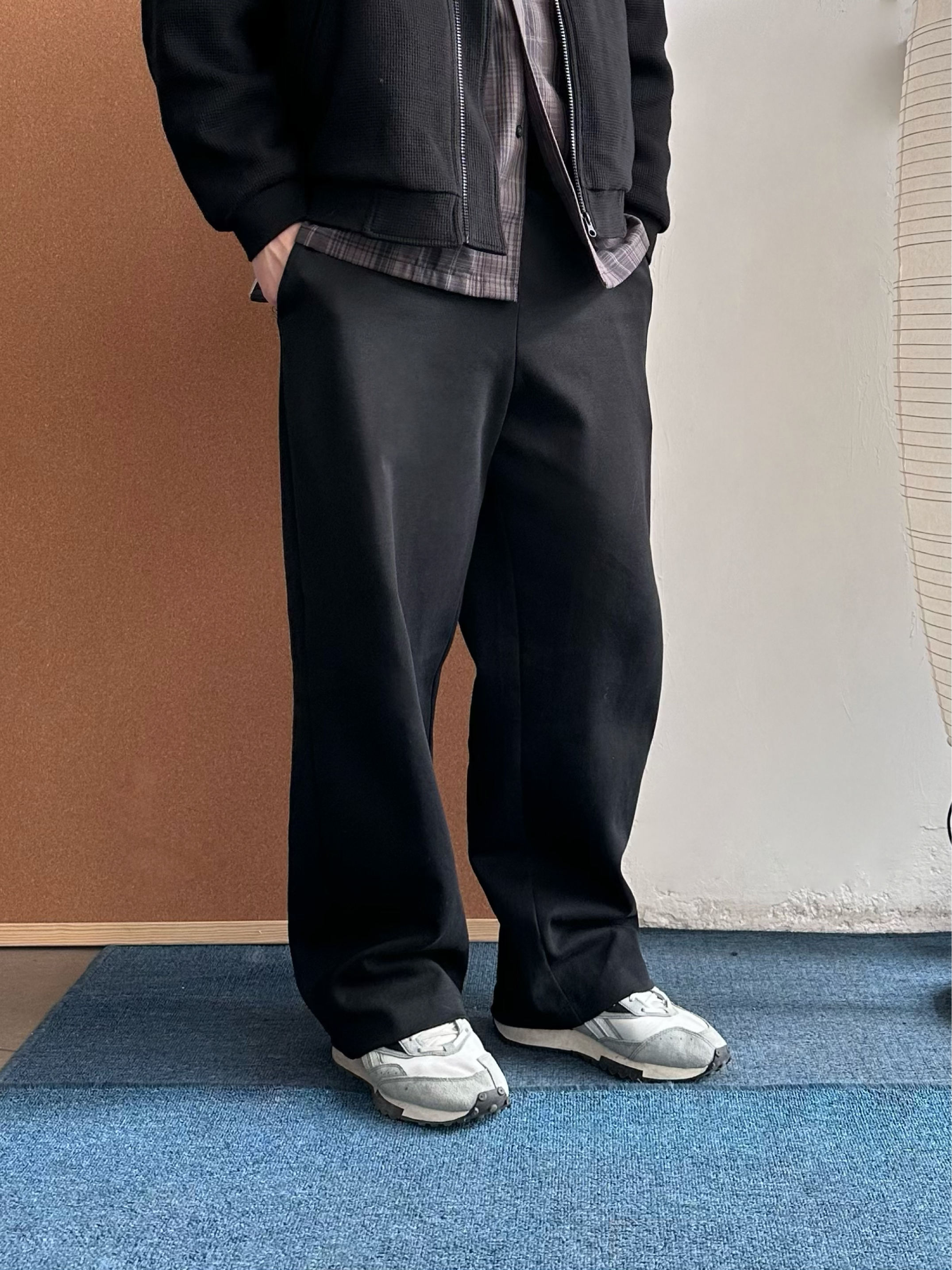 👔 内搭:深紫色衬衫其实很加分,藏在黑色里若隐若现,不会太张扬,细看也有层次。 🧥 外搭:选择黑色华夫格外套,在于质感在线,比普通黑外套更有纹理。 👖 下装:黑色卫裤走一个舒服路线,整体偏休闲,懒人穿也没压力。 👟 鞋子:浅蓝色慢跑鞋就是点睛,新年穿新鞋刚好提亮,全身黑也不会闷。