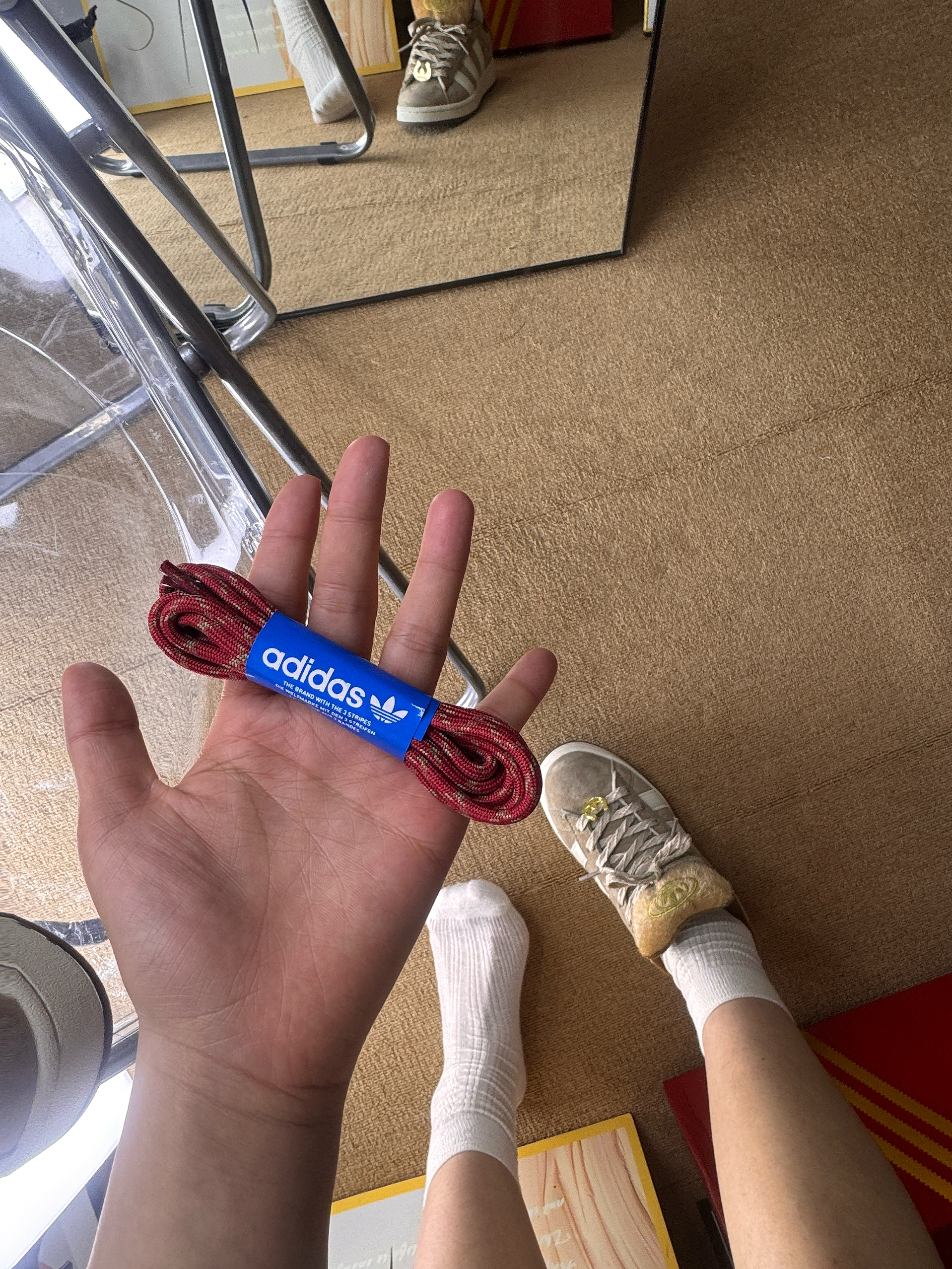 让自己在新的一年里穿得舒适又不失新年氛围 我入手了这双阿迪达斯马年限定麂皮鞋 鞋身是偏棕的焦糖色调,鞋头处的金色小挂钩质感十足,低调中透着贵气。 鞋底稍微偏硬,但由于鞋型比一般运动鞋略宽,走起路来还是很舒适。后跟的设计也很特别,左右脚采用了不对称的图案,让鞋子更具细节感。 这双鞋还附赠了一副红色鞋带,非常喜庆。我还没来得及换上,打算等到春节的时候再系上,应景又好看。