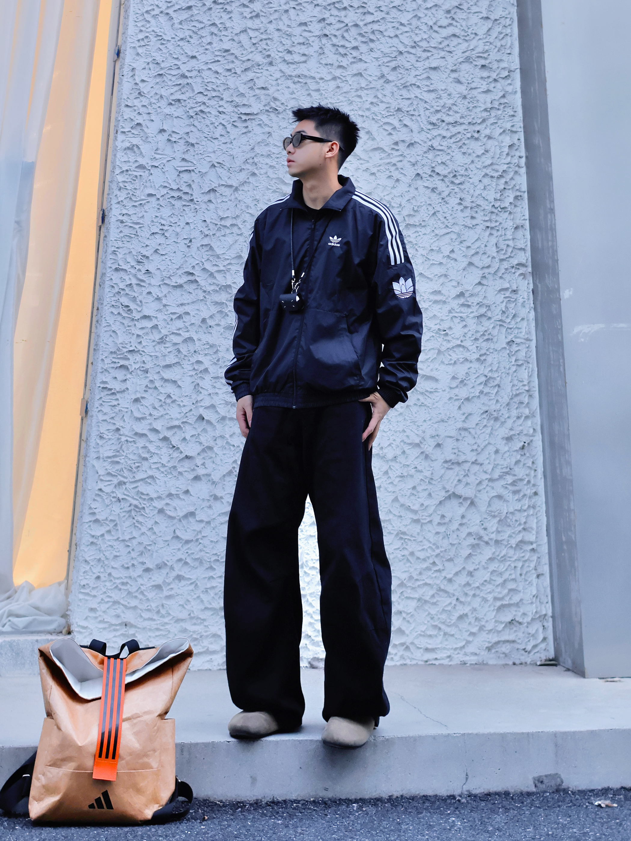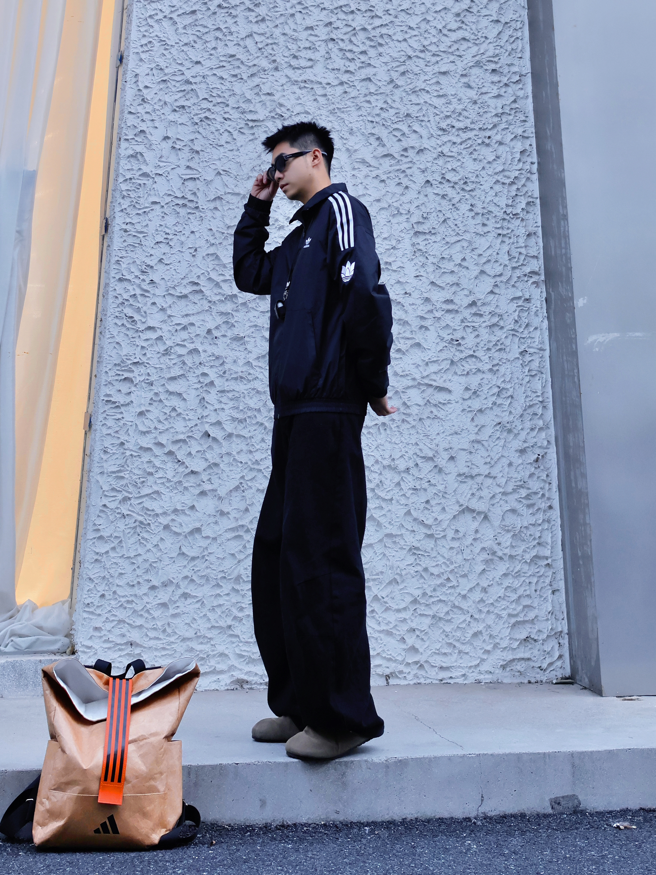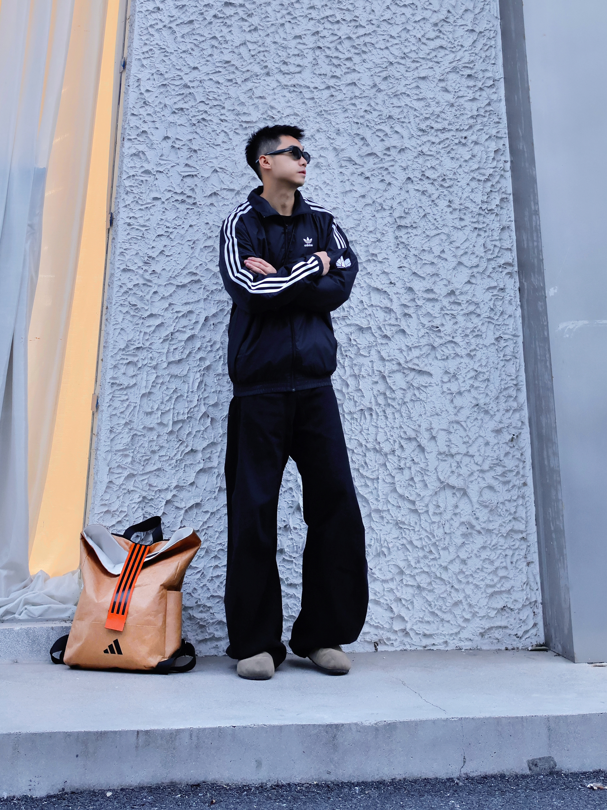 美式男高穿搭来咯 今天这一身尊滴帅到没朋友啦 上身一件经典黑色三条杠adidas的夹克 简约的黑色加上利落的潮流线条感很酷⚫️ 搭配一条同色系阔腿的裤子拉一下身材比例 上脚一双勃肯鞋点缀出这一身的慵懒感 另外选择了adidas的牛皮袋双肩包作为穿搭小亮点 这一身简约又耐看,穿搭也不用费力