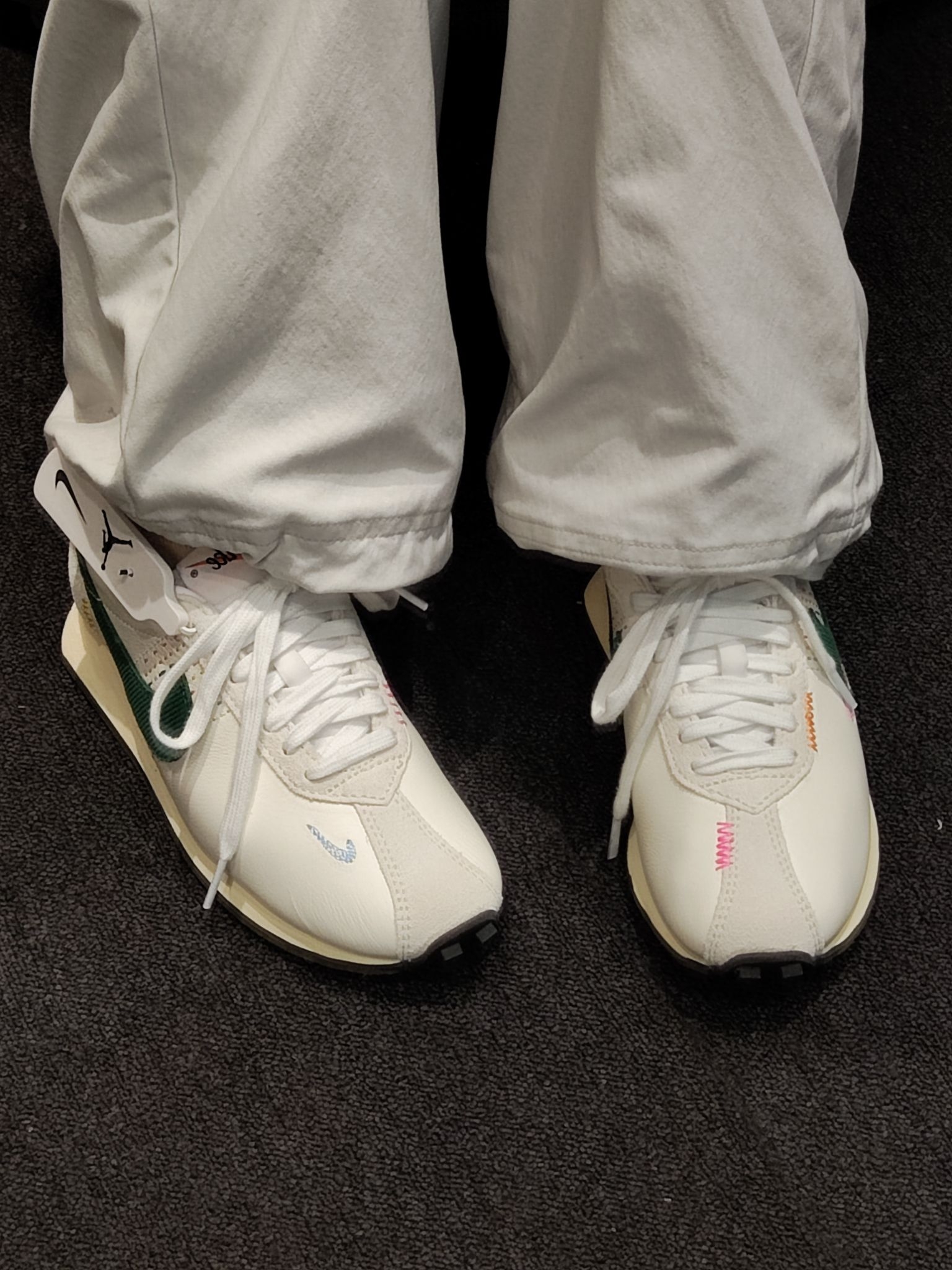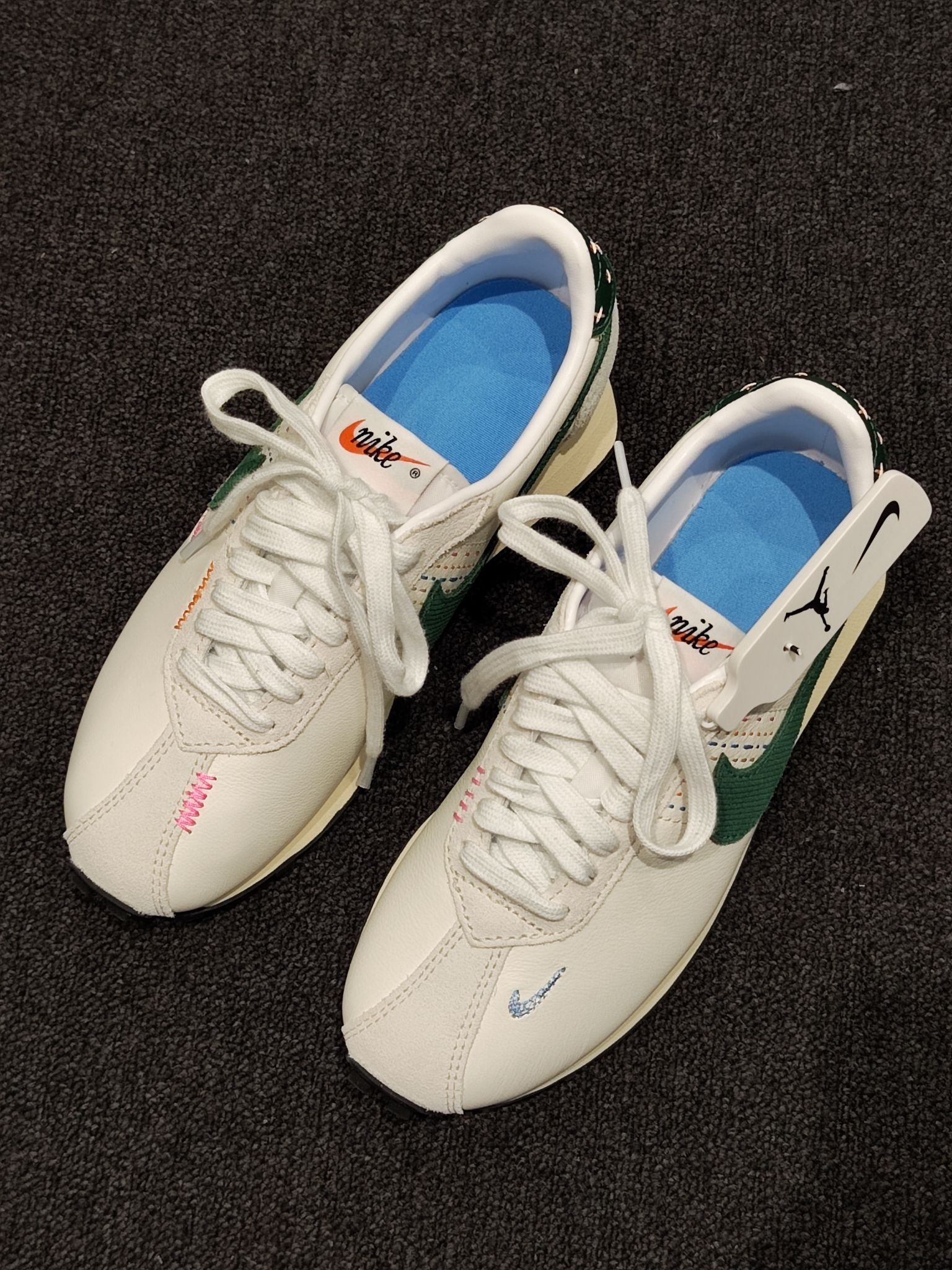 奶呼呼的米白鞋面打底,深绿色Swoosh用编织纹理做点缀,质感直接拉满!最戳人的是鞋身的彩色刺绣细节,粉蓝黄的细线条悄悄藏在Logo边缘,像把春日的温柔和心动都缝了进去,低调又有小心机💖