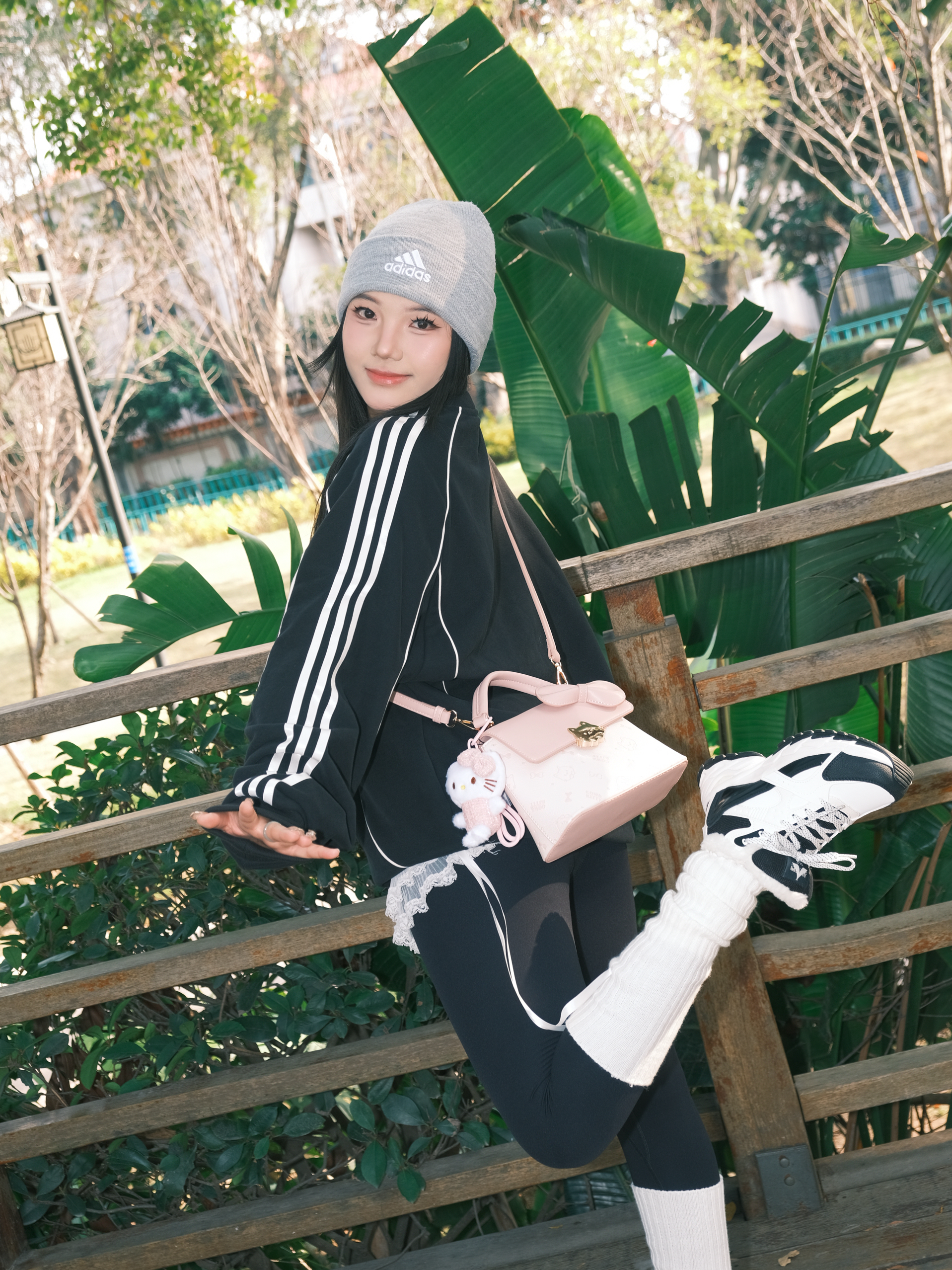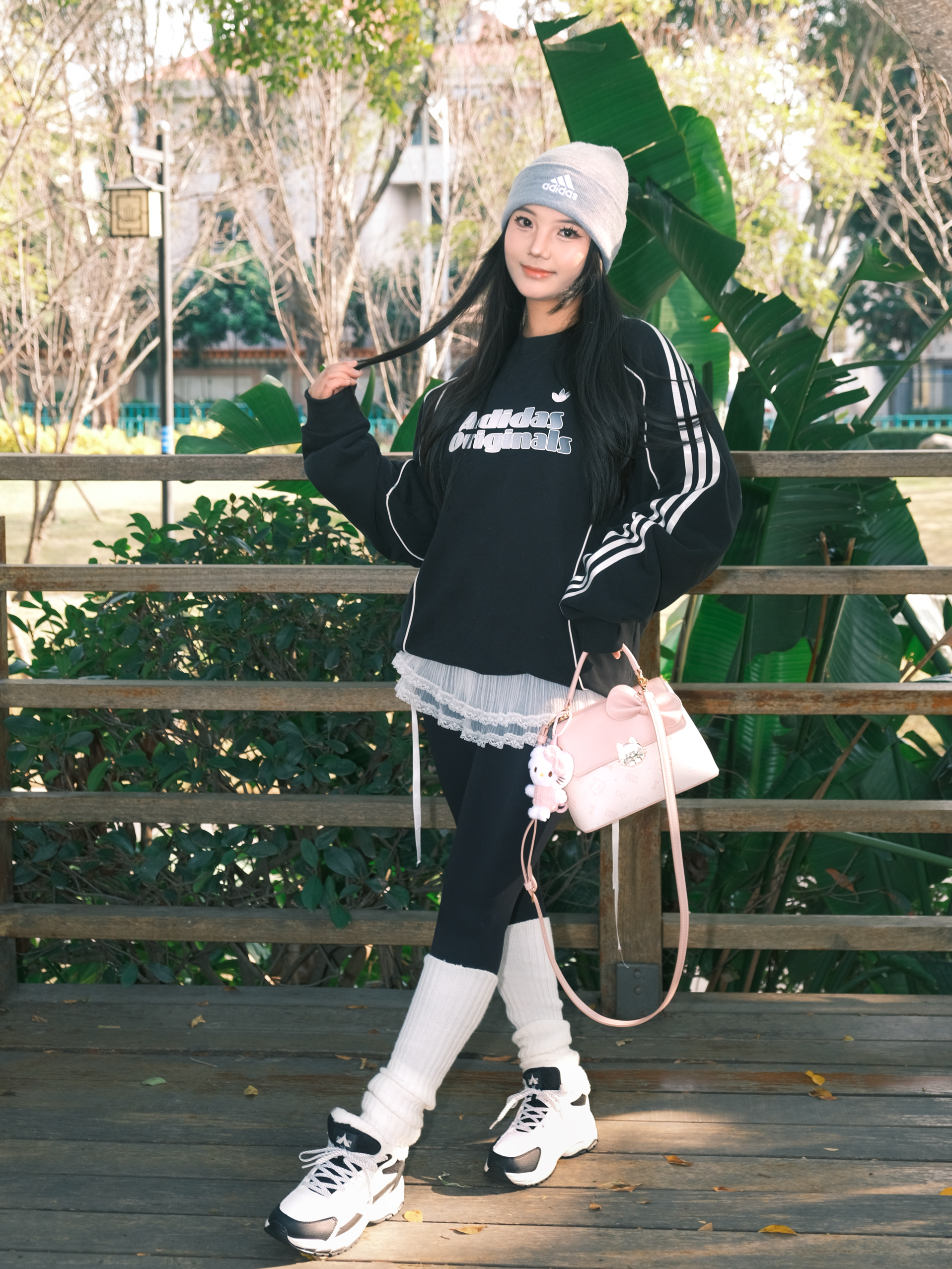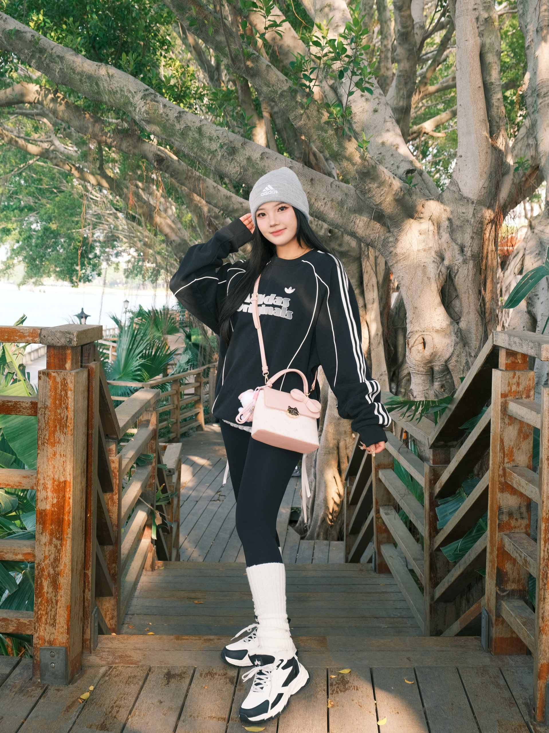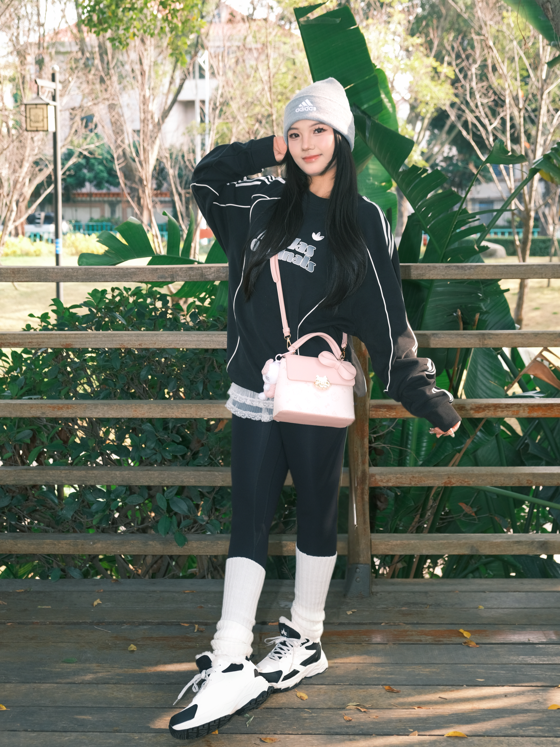 今日份OOTD主打一个舒服出街~ 黑色卫衣配鲨鱼裤🐳 经典不出错 灰色冷帽一戴,慵懒感直接拉满🧶 重点是这个粉色小包!🎀 甜妹属性瞬间激活,中和了一身黑的酷 这双黑白老爹鞋是今天的隐藏功臣,软乎乎的鞋底暴走一天都不累,配堆堆袜还悄悄拉长了腿线✨ 在木栈道上随便拍都很出片 阳光好的时候,心情也跟着亮起来啦✨