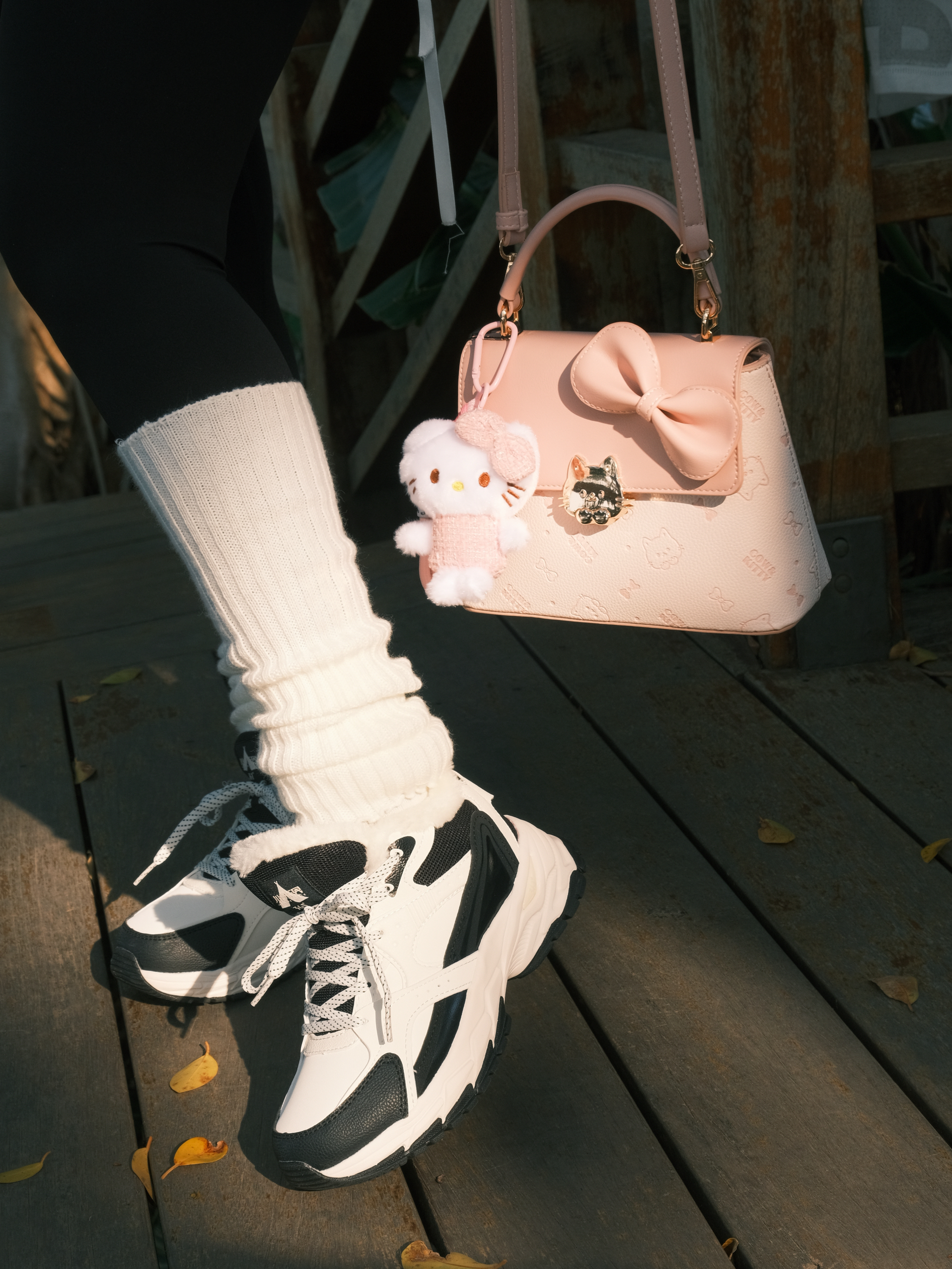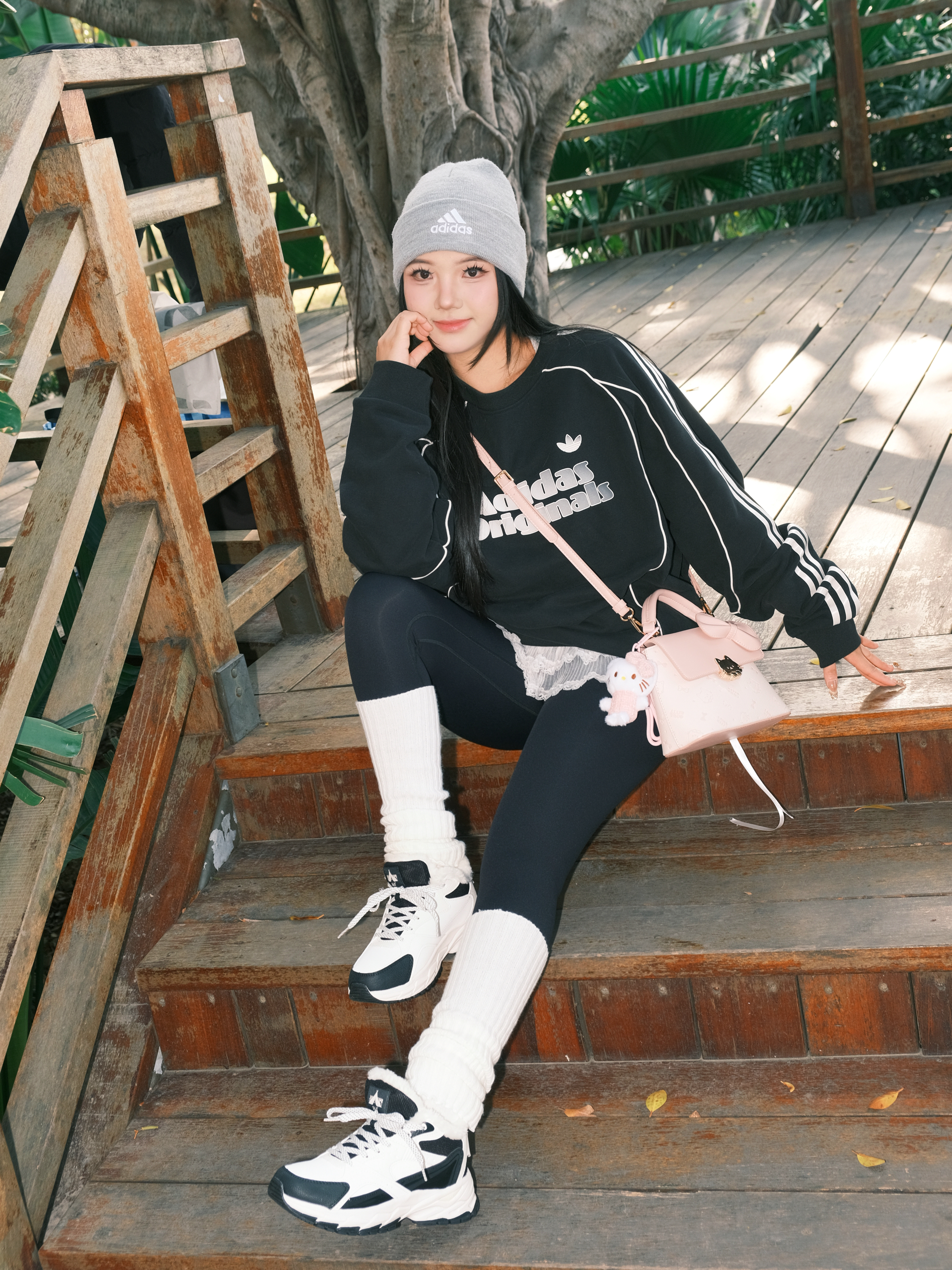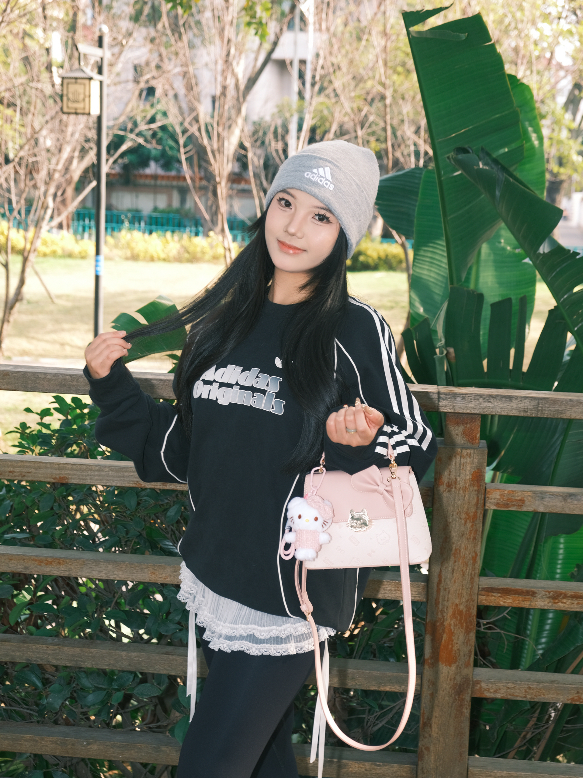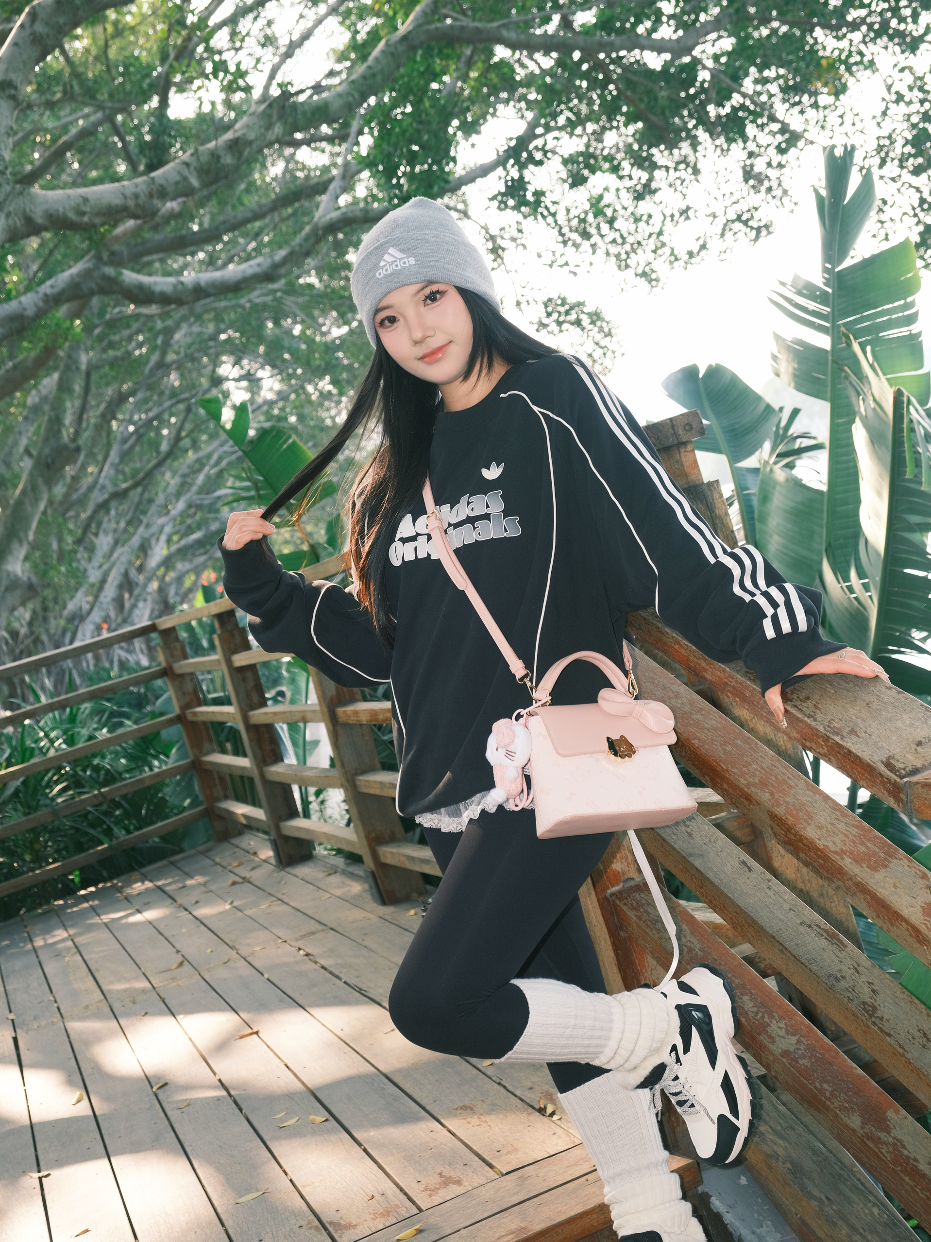 今日份OOTD主打一个舒服出街~ 黑色卫衣配鲨鱼裤🐳 经典不出错 灰色冷帽一戴,慵懒感直接拉满🧶 重点是这个粉色小包!🎀 甜妹属性瞬间激活,中和了一身黑的酷 这双黑白老爹鞋是今天的隐藏功臣,软乎乎的鞋底暴走一天都不累,配堆堆袜还悄悄拉长了腿线✨ 在木栈道上随便拍都很出片 阳光好的时候,心情也跟着亮起来啦✨