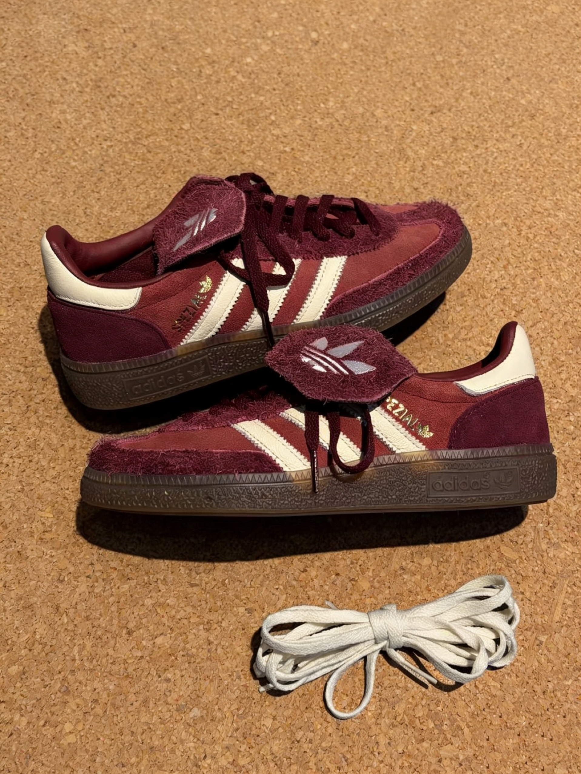 新年到底是穿灵珠还是魔丸💥 🔵🔴酒红色和深蓝色麂皮鞋面质感拉满,搭配米白色三条纹和金色“SPEZIAL”刺绣标,复古又高级。鞋舌的魔术贴设计不仅增加实用性,还能让整体造型更有层次感,随便一拍都是氛围感大片📸 🔵🔴复古生胶底配色,自带做旧滤镜,和鞋身的酒红色完美呼应,复古感直接拉满!