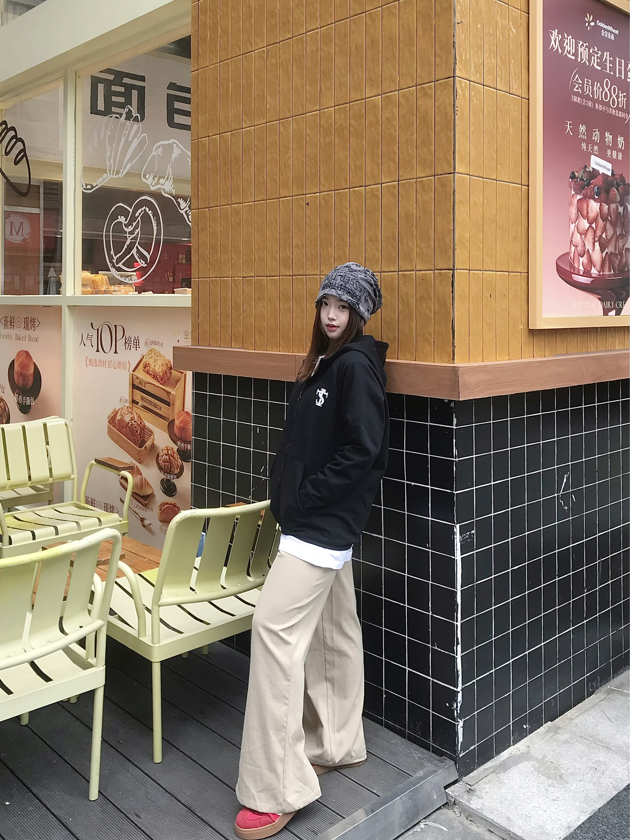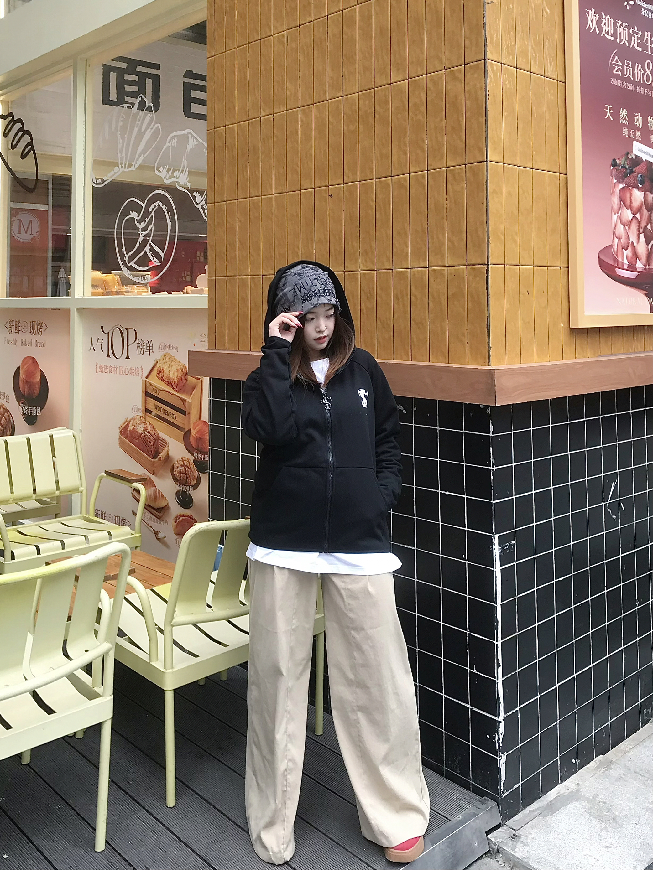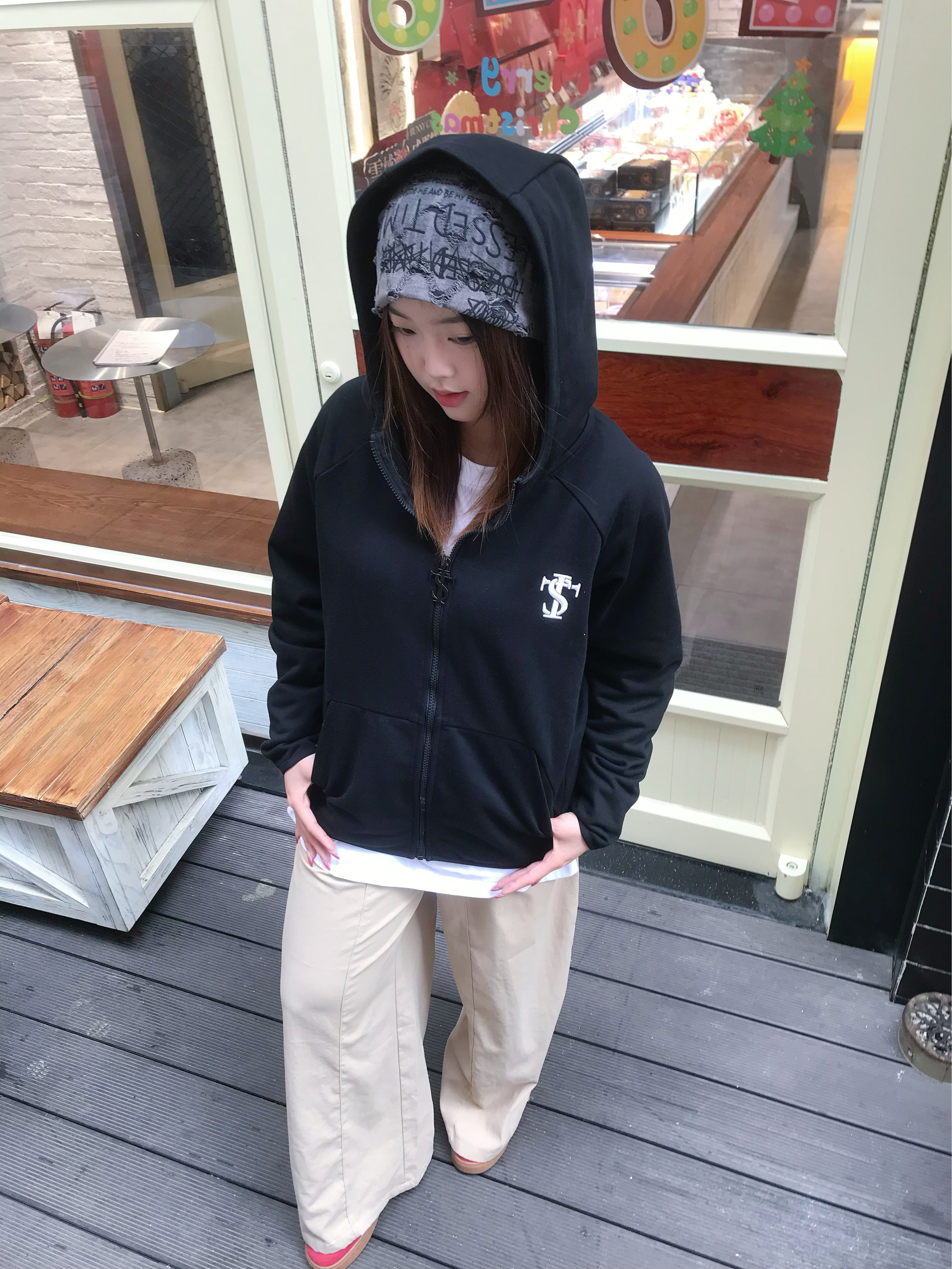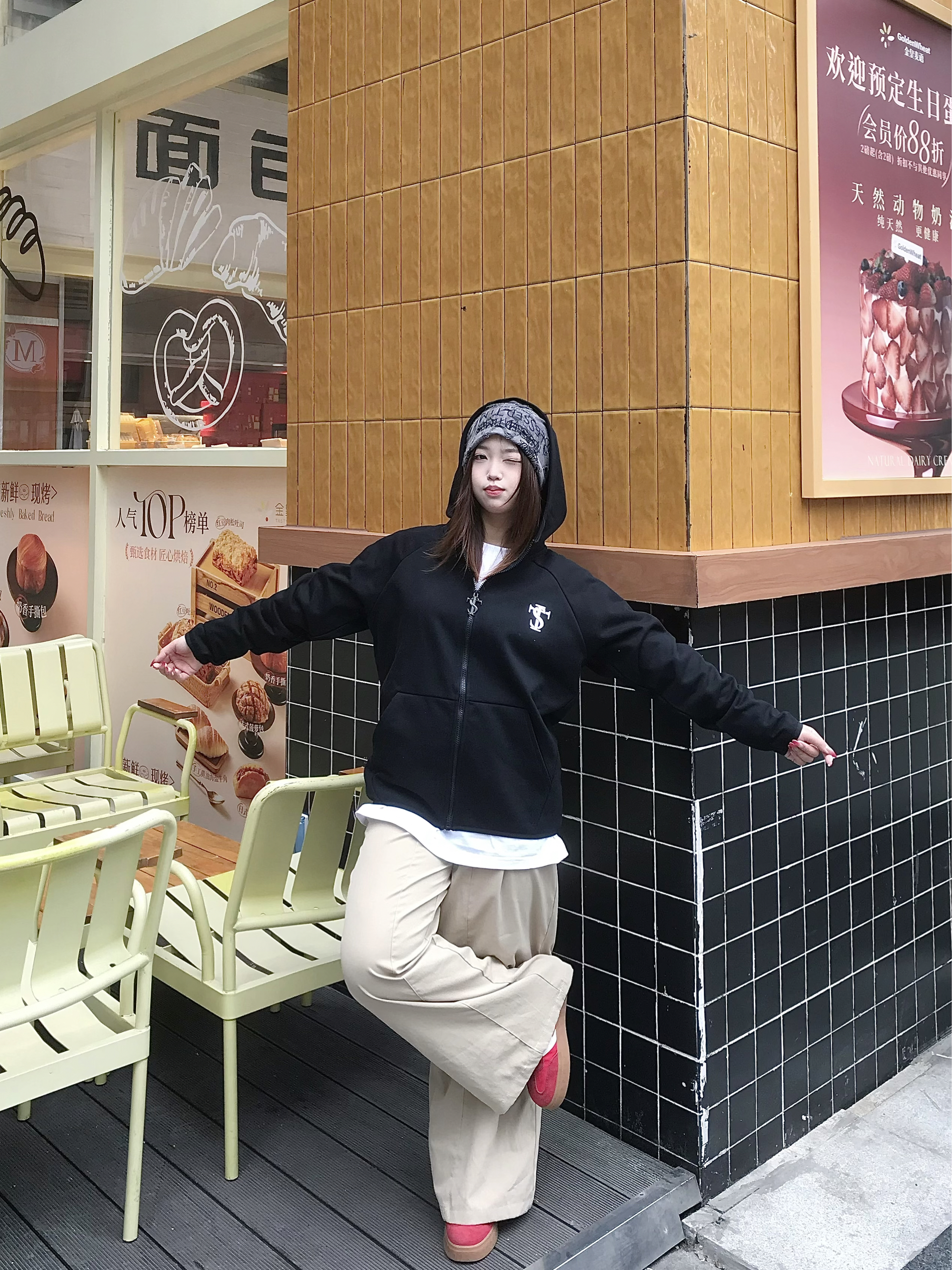 STKSmallTownKid这件黑帽衫的街头感我直接爱上了 不加绒的在春秋穿刚刚好 宽松oversize版型自带松弛感 拉链设计穿脱方便 配卡其裤和红鞋子,一整个美式rapper出街既视感 日常和朋友逛潮店、拍照都超吸睛~