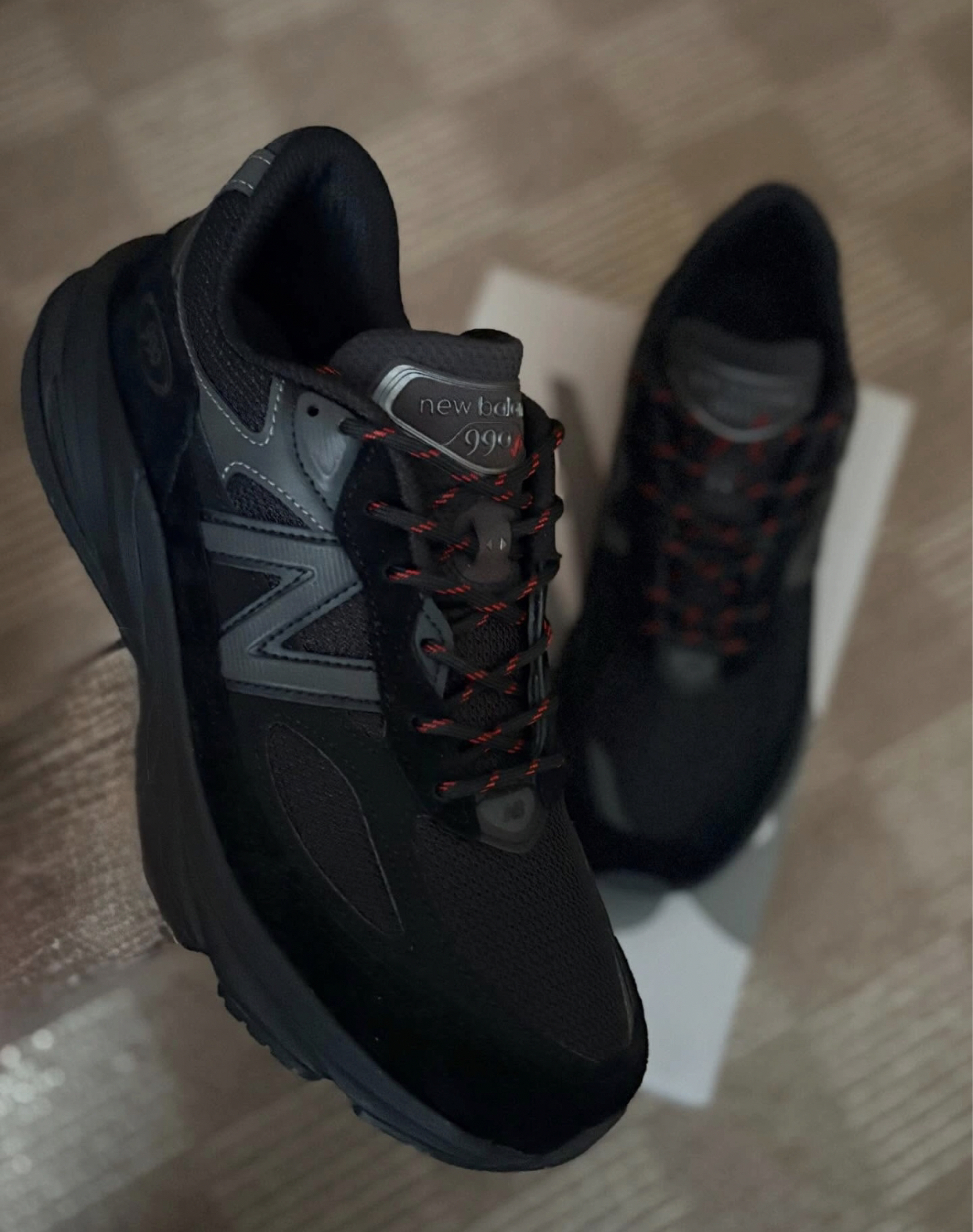 这个纯黑色的质感 配上细节黑红鞋带 这双990的V6上脚就喜欢上了它 纯黑色加上猪皮革的质感拉满
