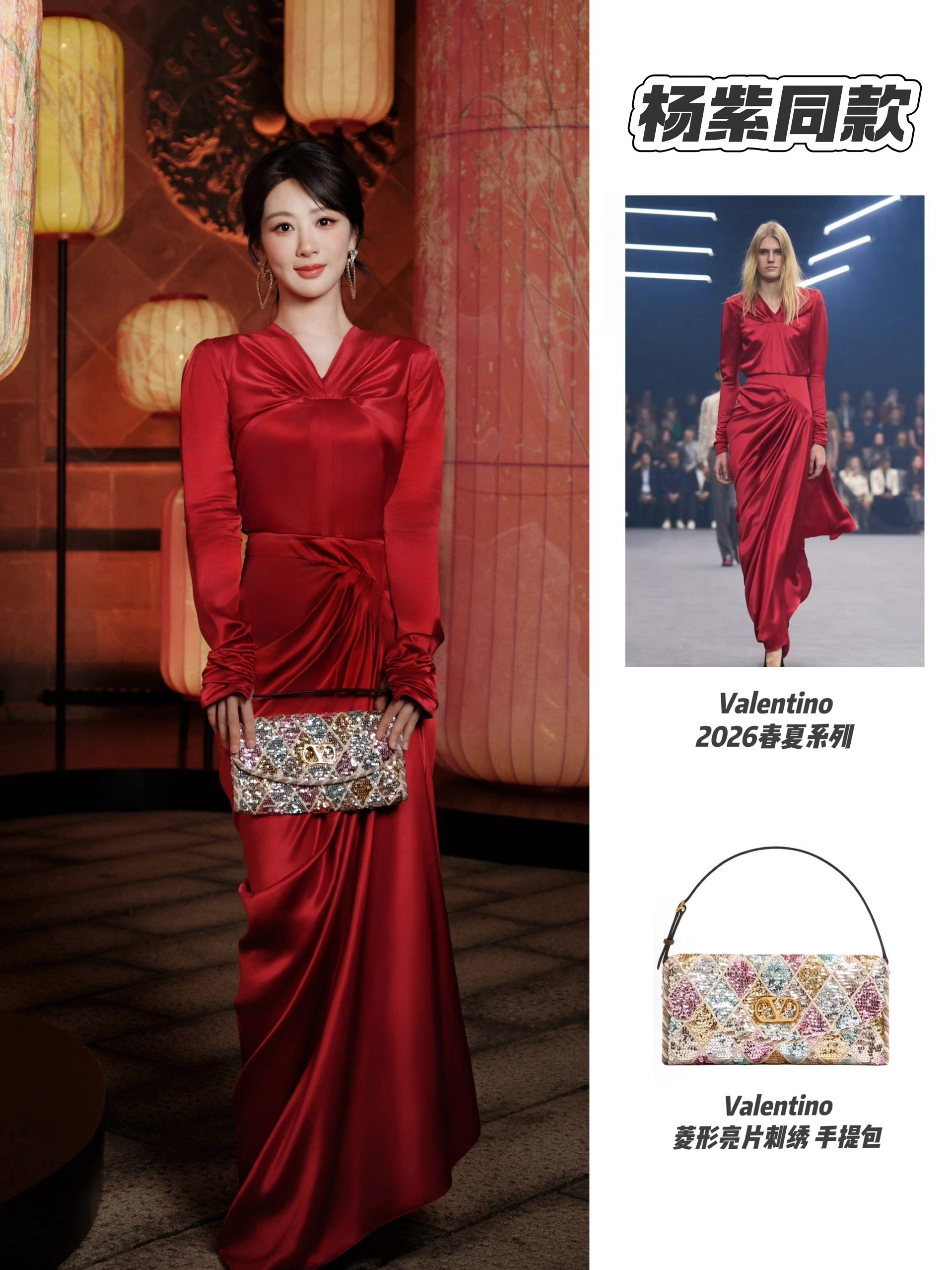 杨紫这套Valentino红裙简直是春节战袍天花板! 2026春夏系列的缎面材质自带高级光泽感,收腰扭结设计勾勒出曼妙曲线,明艳又大气。搭配满钻刺绣手包,华丽感拉满,红裙配亮片的组合既喜庆又显贵气,不管是走亲访友还是新年聚会,穿这套绝对稳赢,瞬间成为全场焦点。