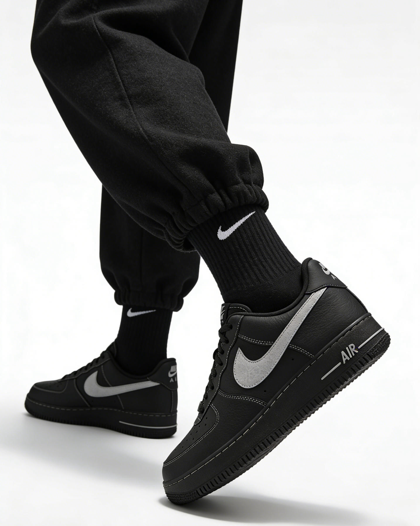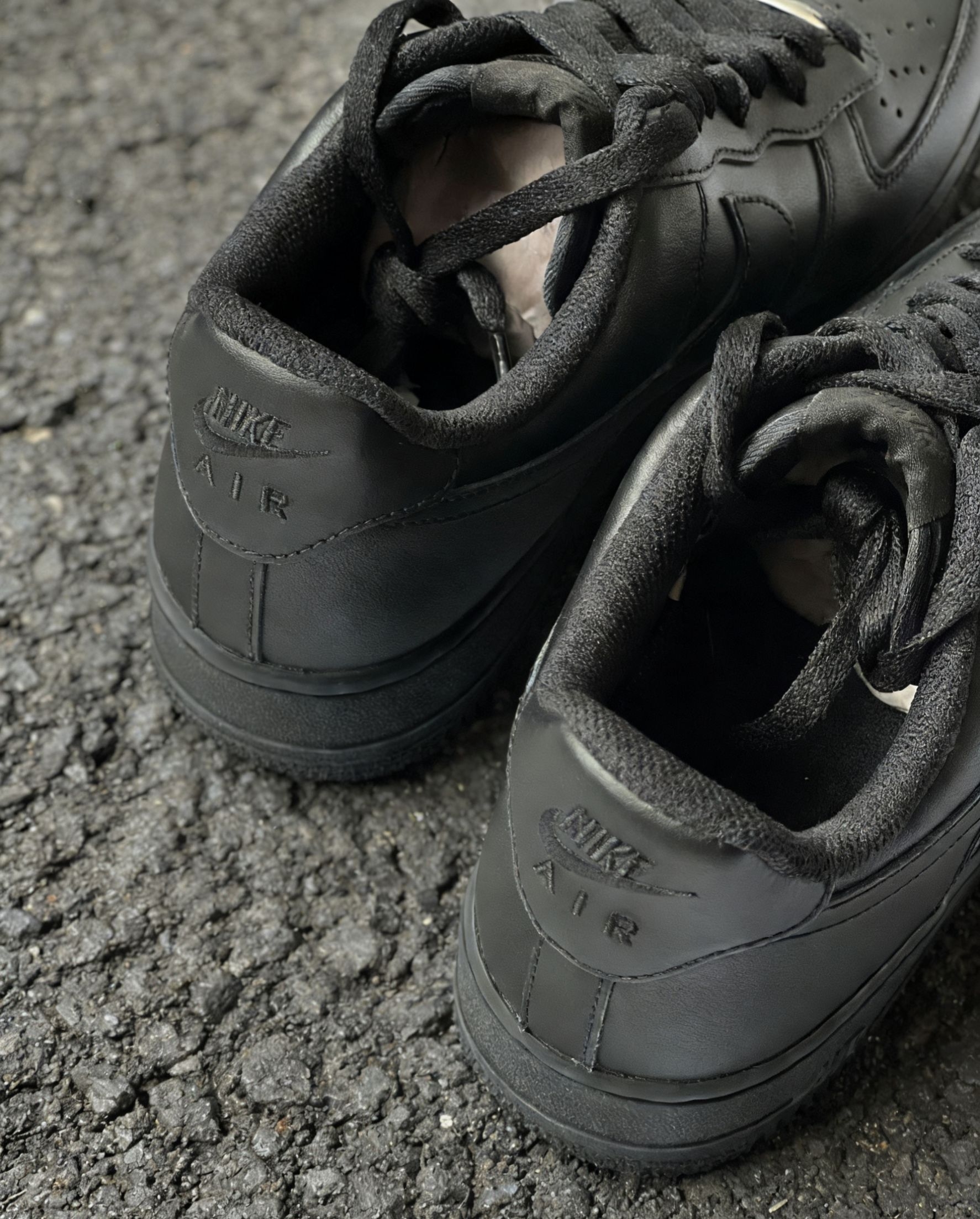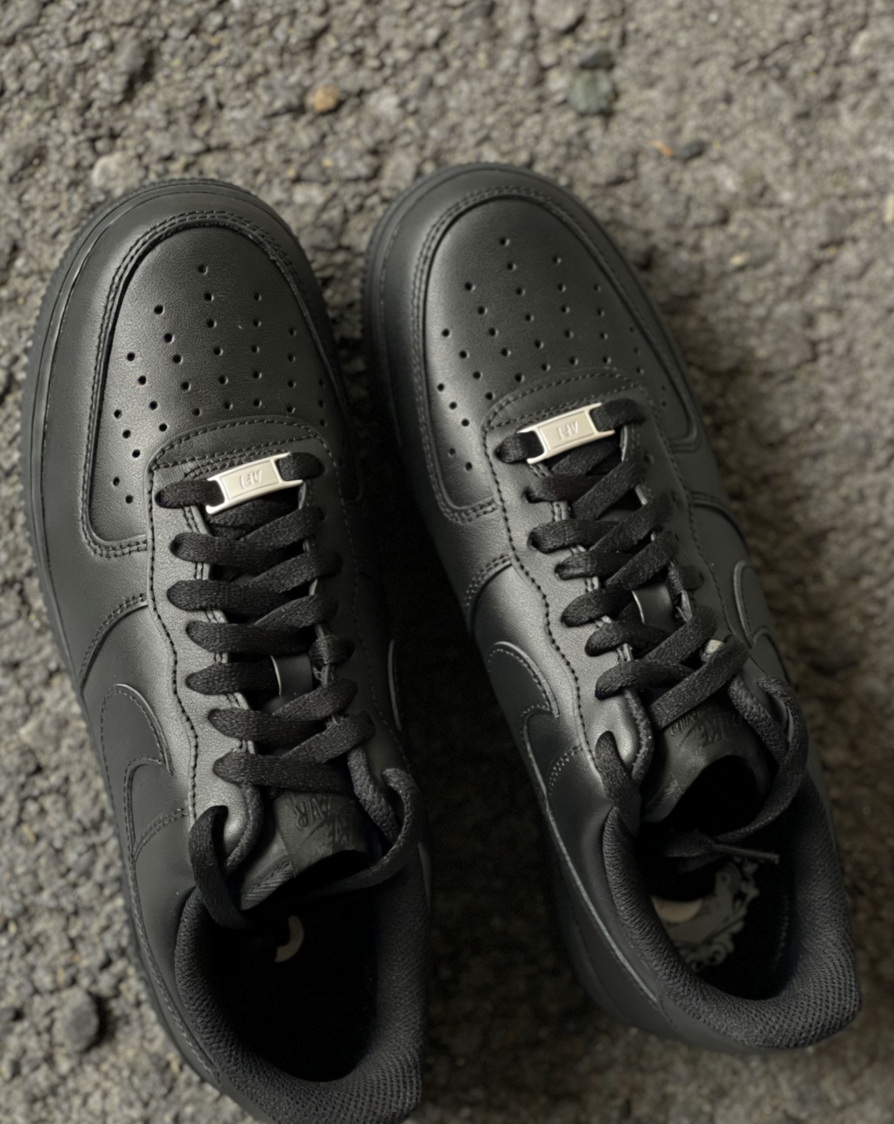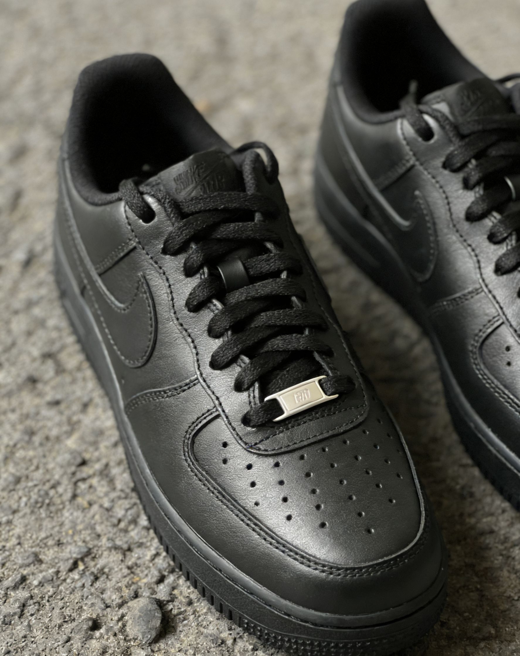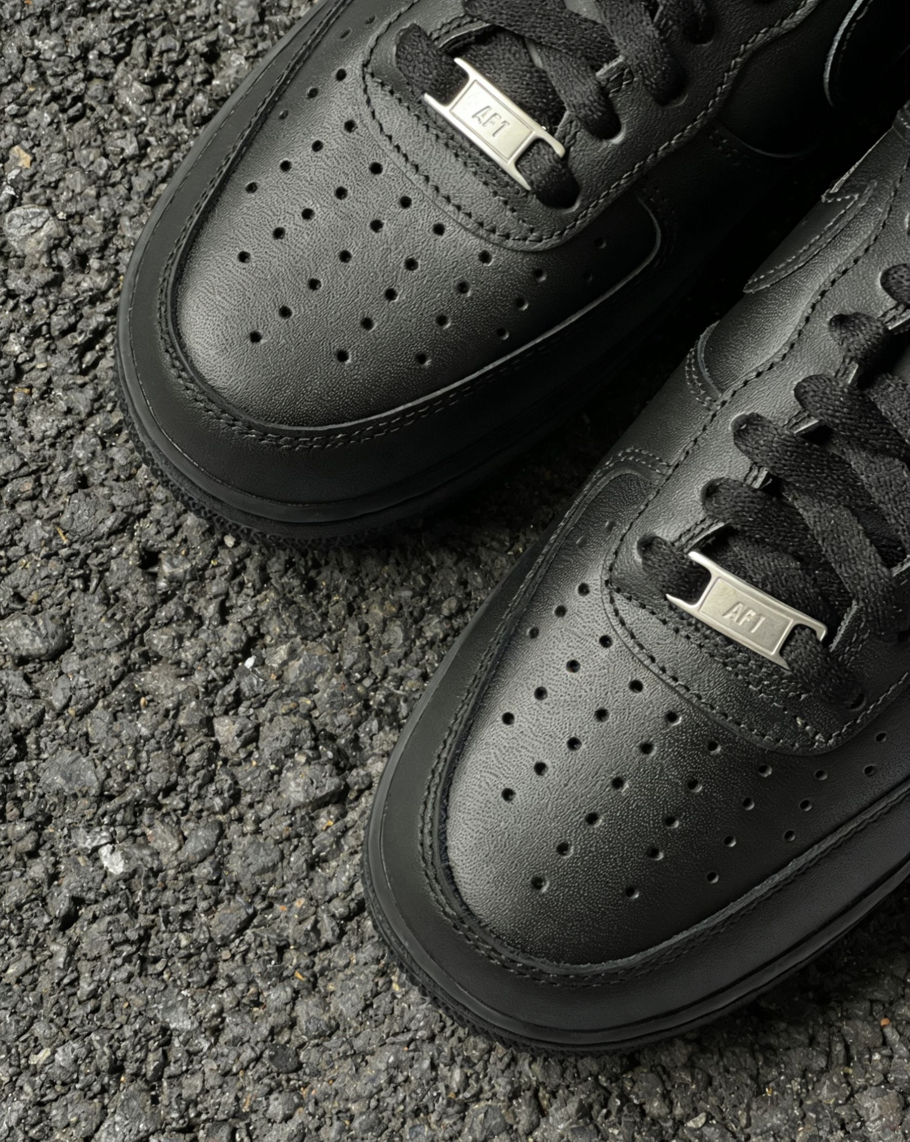 无色彩胜有色彩:这双空军采用光面皮革材质,表面均匀分布着细密透气孔,既保证了鞋子的透气性,又提升了整体质感。鞋带为纯黑色,系带方式整齐规范,展现出简约大方的风格。鞋舌上的金属装饰扣是点睛之笔,在自然光下折射出低调的光泽,为整体设计增添了一丝精致感。厚实的黑色橡胶鞋底提供了良好的支撑和舒适度,边缘线条流畅,与鞋身完美融合。无论是日常休闲还是运动场合,这双鞋子都能轻松搭配,展现出简约而不失品味的风格。