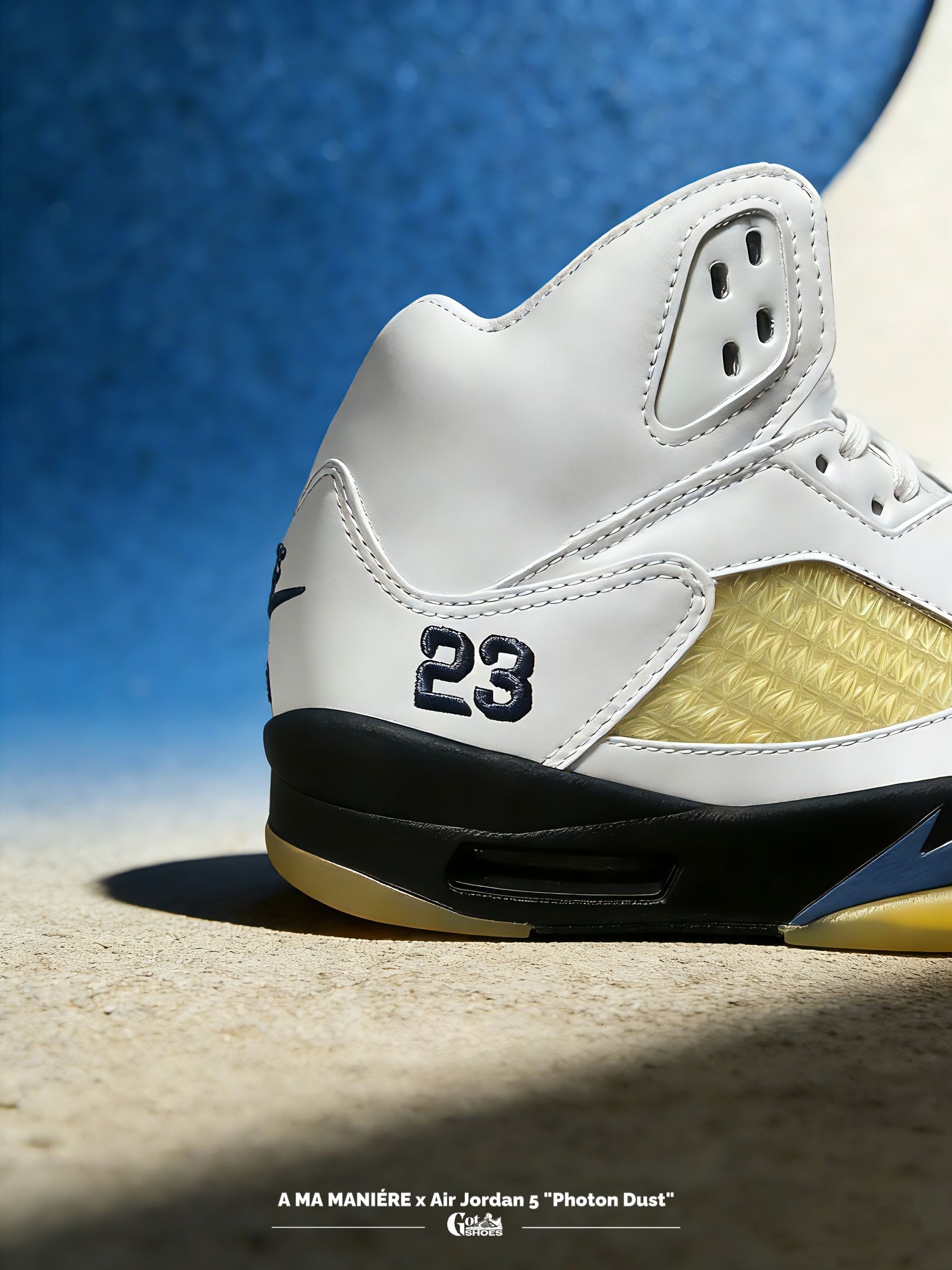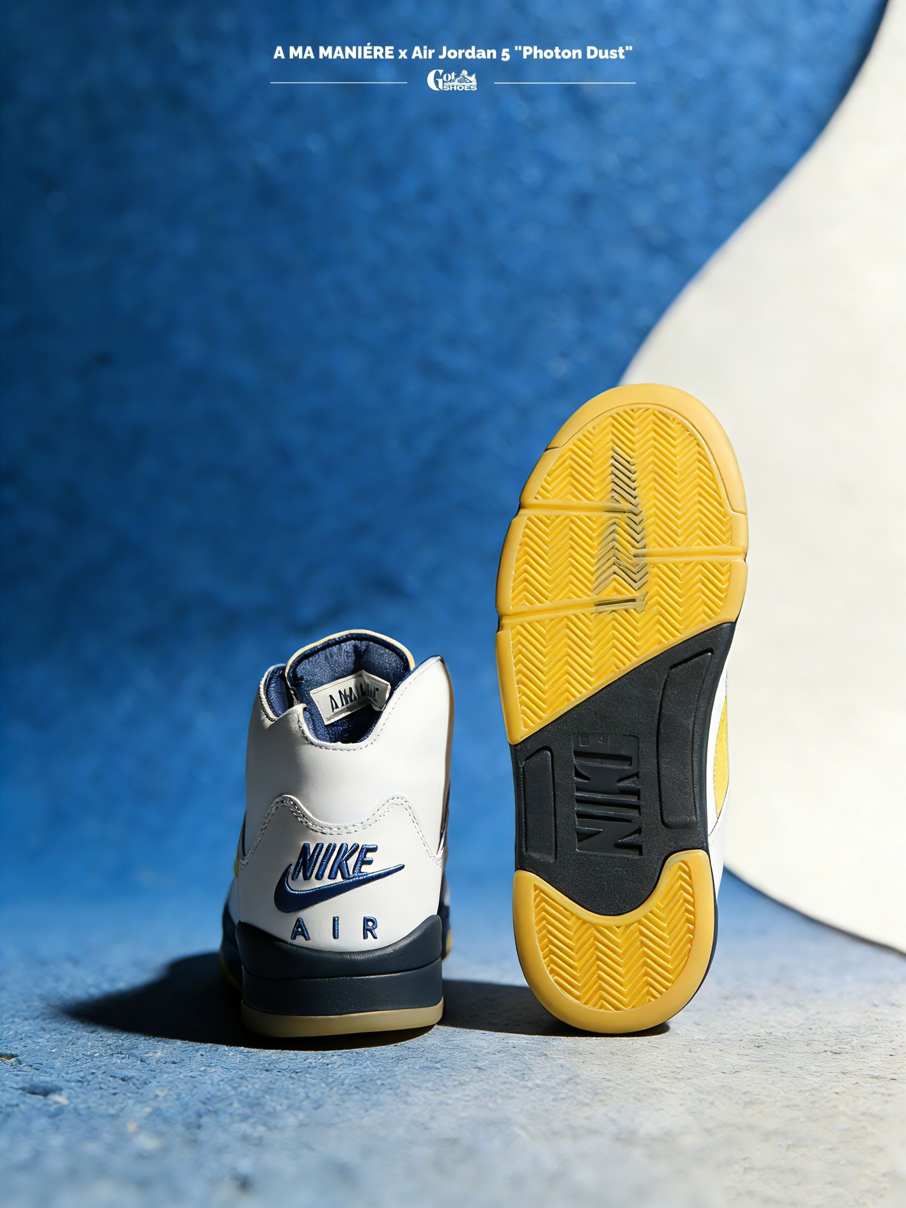 本次联名是A Ma Maniére与Air Jordan首次以Air Jordan 5为设计基础合作推出的系列,共包含黑色与白色两款配色。此前已经为大家带来黑色“黄昏”配色的解析,而眼前这双则是以浅色调为主的“日出”版本。鞋身大面积采用白色短绒麂皮包裹,在鞋舌、侧面网格等细节处融入了氧化做旧处理,延续了AMM一贯的Vibe风格。特别值得注意的是,侧面透气网、鞋舌及内衬均使用了AMM字样纹理装饰,这...