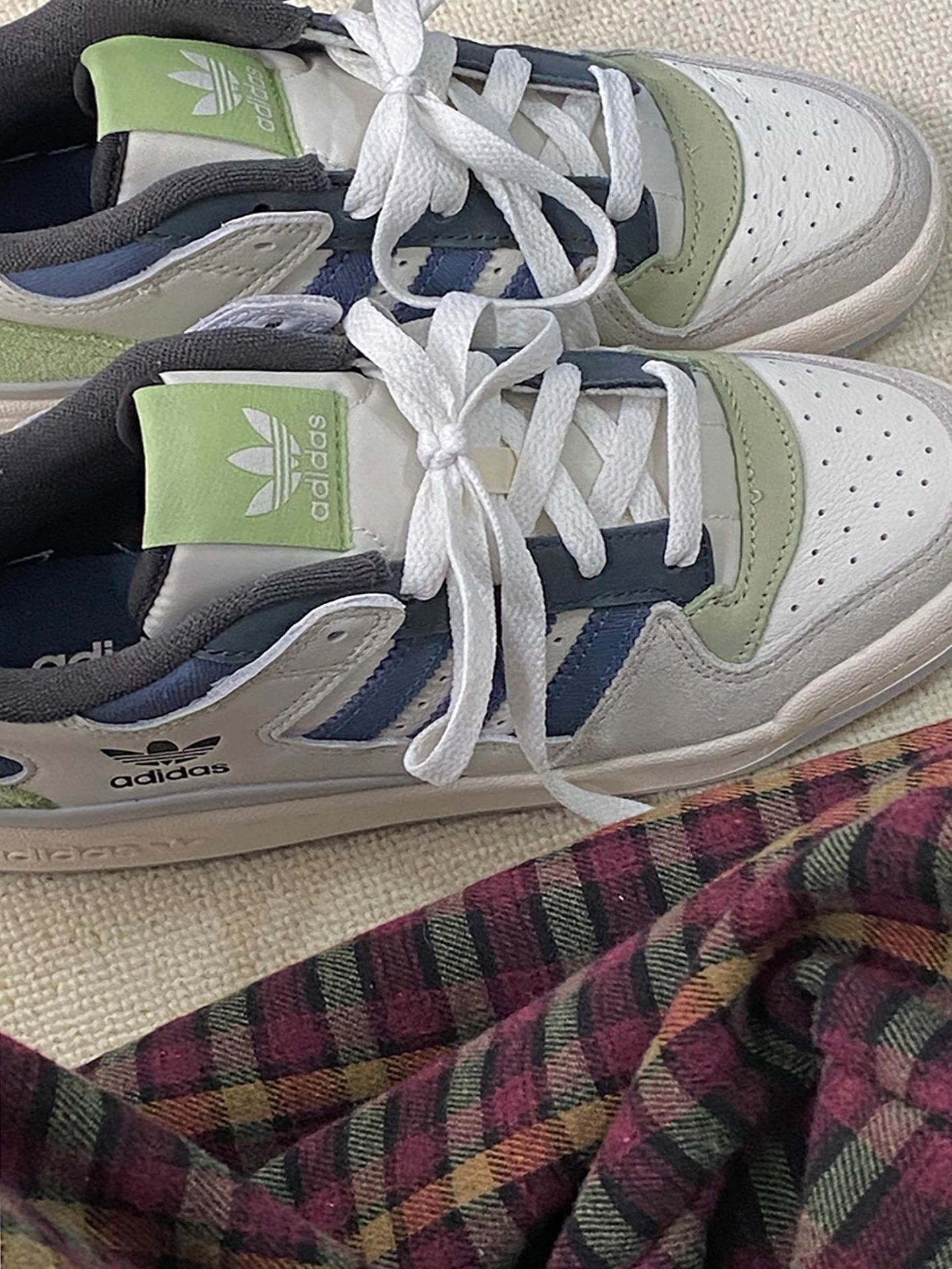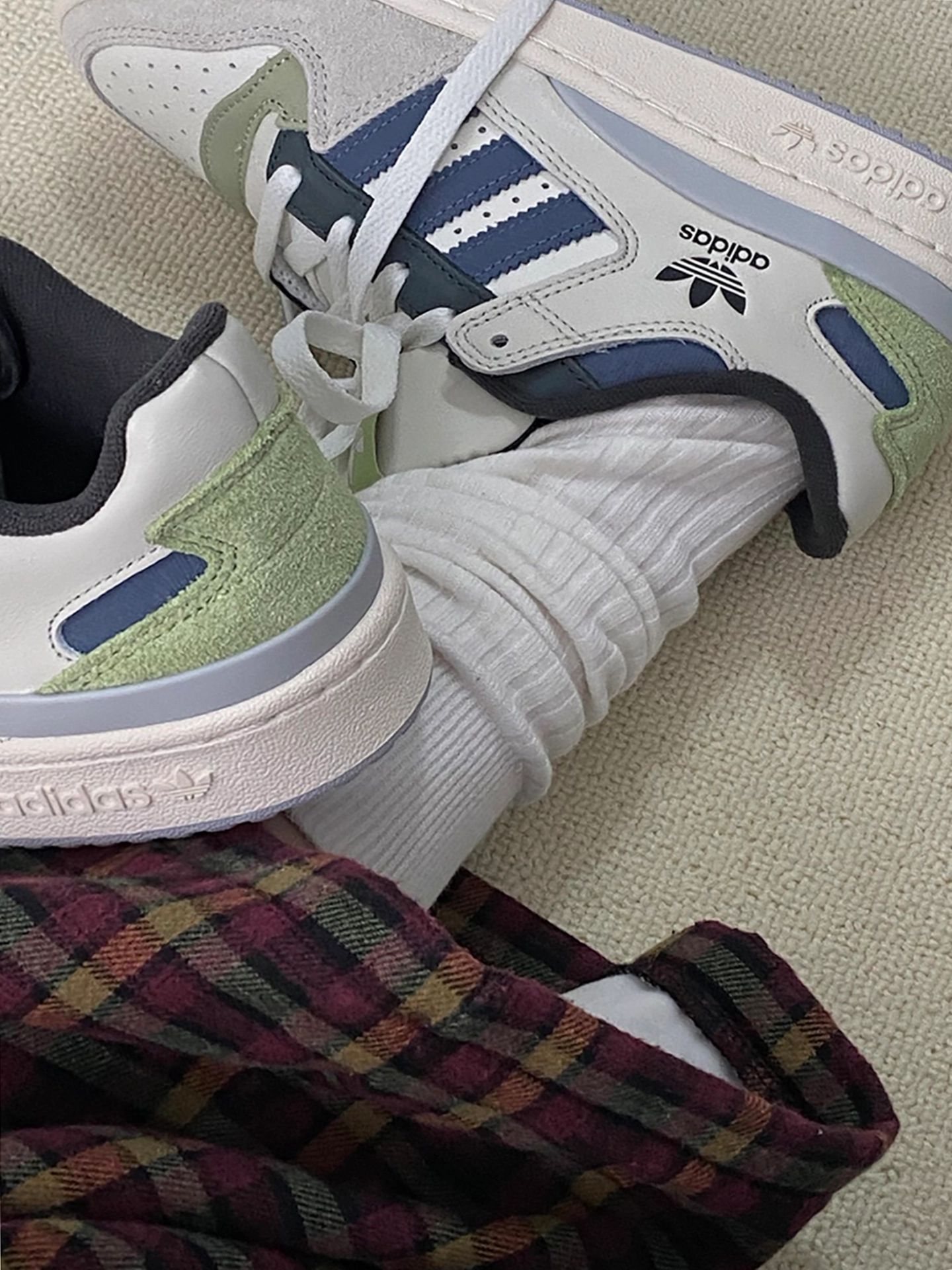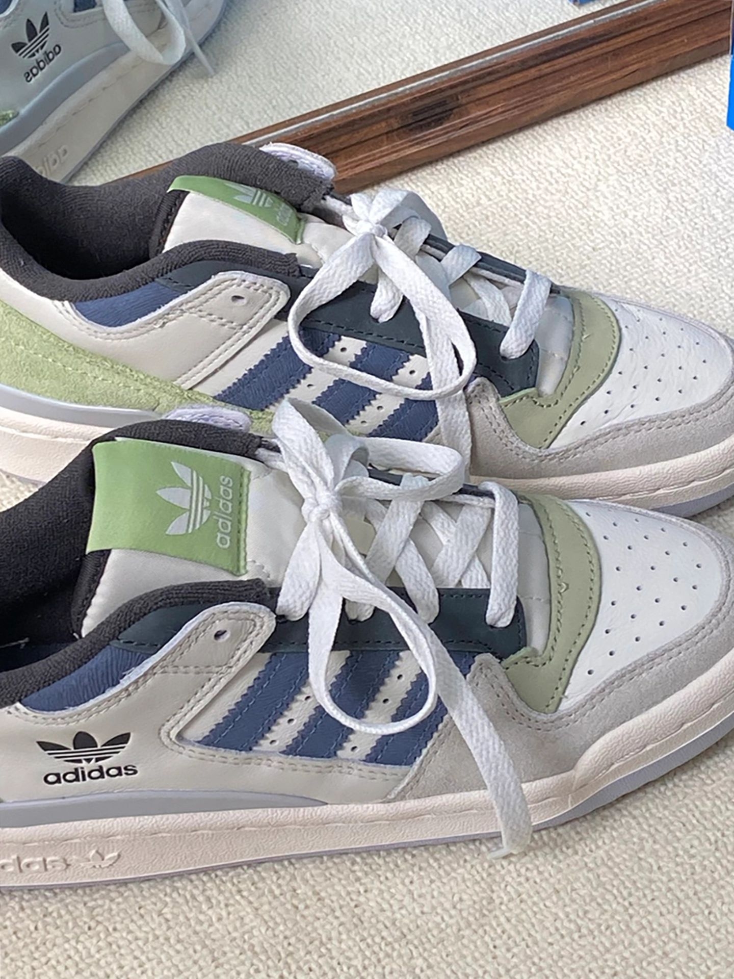 最近入的Adidas originals FORUM低帮板鞋真的好爱😚!周末穿它和闺蜜去公园晒太阳☀️,搭了米白卫衣+浅蓝牛仔裤,闺蜜一眼就夸“这鞋配色好舒服,白绿灰蓝的组合超小清新!” 鞋面摸起来软乎乎的,圆头系带显脚型好看,走一下午也没觉得累~尺码很正,瘦脚宽脚都合适哦✅,建议搭浅色系衣服,比如小裙子或休闲裤都超搭✨。 白色部分脏了用橡皮擦🧼擦就干净啦!你们平时喜欢搭什么衣服配板鞋?来评论区...