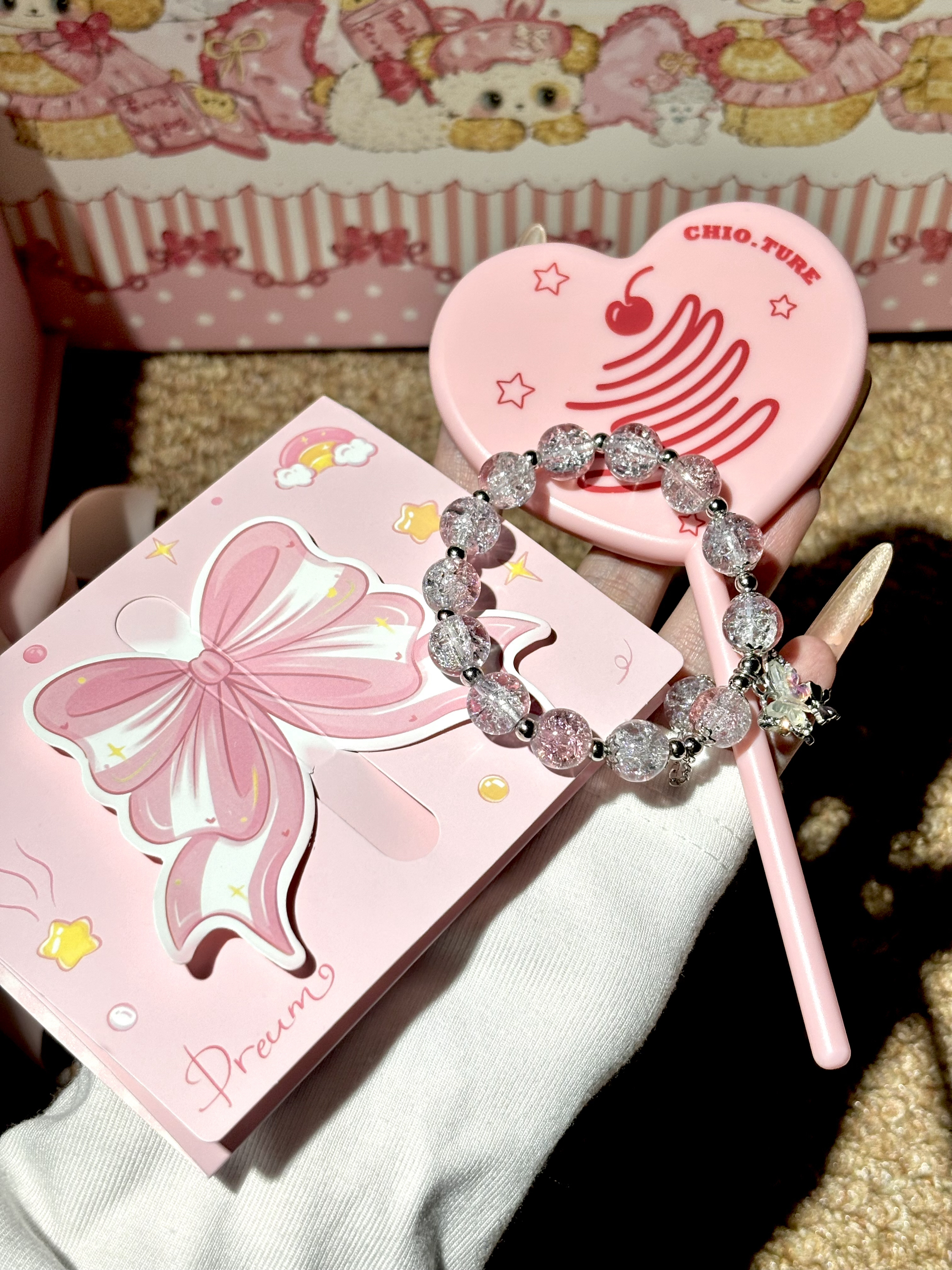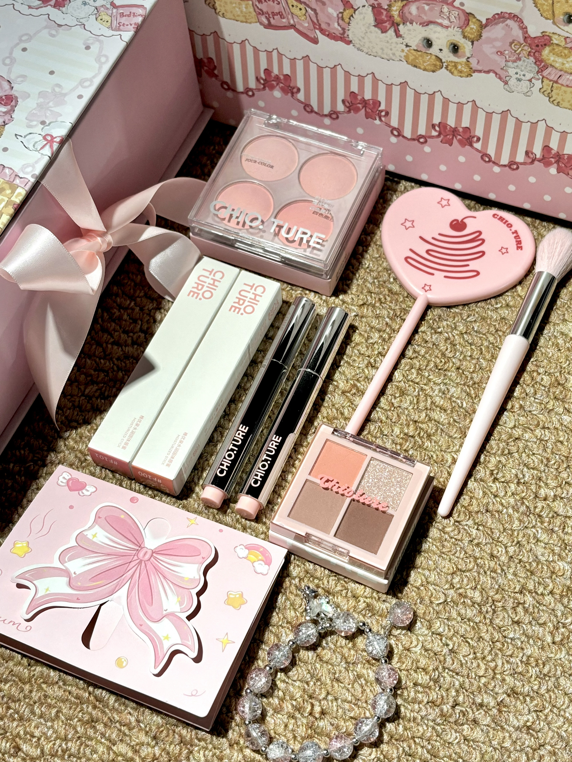 稚优泉新出的甜心泡泡礼盒A款 眼影、腮红、唇釉全配齐,还有爱心小镜子和手链 四色腮红盘:膨胀色+收缩色一盘搞定 四色眼影:珠光爆闪+日常哑光,新手用也不出错 两支唇釉:一支豆沙,一支显白粉嫩,镜面质地成膜快,喝水都不沾杯 百元的价格还带了手提袋,学生党拿来送礼也很合适