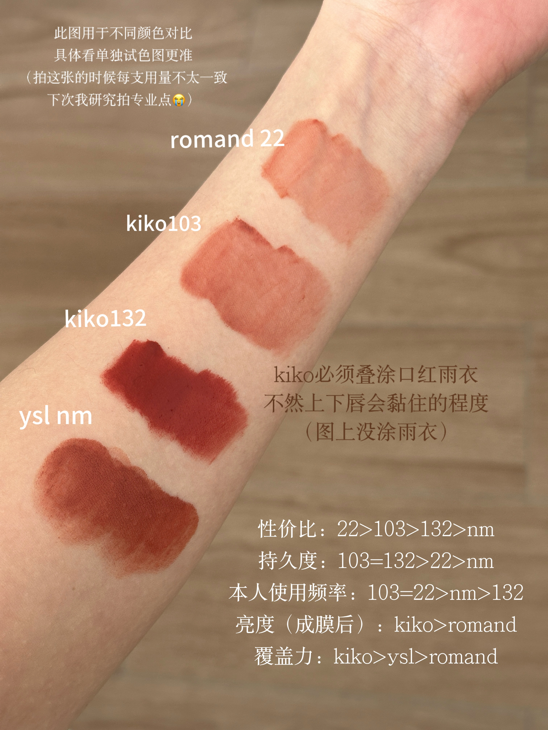 本人情况:黄一白 深唇 素颜居多 嘴唇很少打底 如果你和我一样!那这篇真的很适合你! 🧾素颜用22更多,其次是nm(另外两支要叠口红雨衣,素颜的时候不想多任何一步);化妆则是基本都用103,还会再叠132~ 都是原相机没有调任何滤镜的手臂试色!比对过了,跟肉眼看到的色差不大,基本还原嘿嘿(*≧ω≦) 因为鄙人嘴唇不太好看所以拍拍手臂试色大家看看好了^-^希望能帮到大家~
